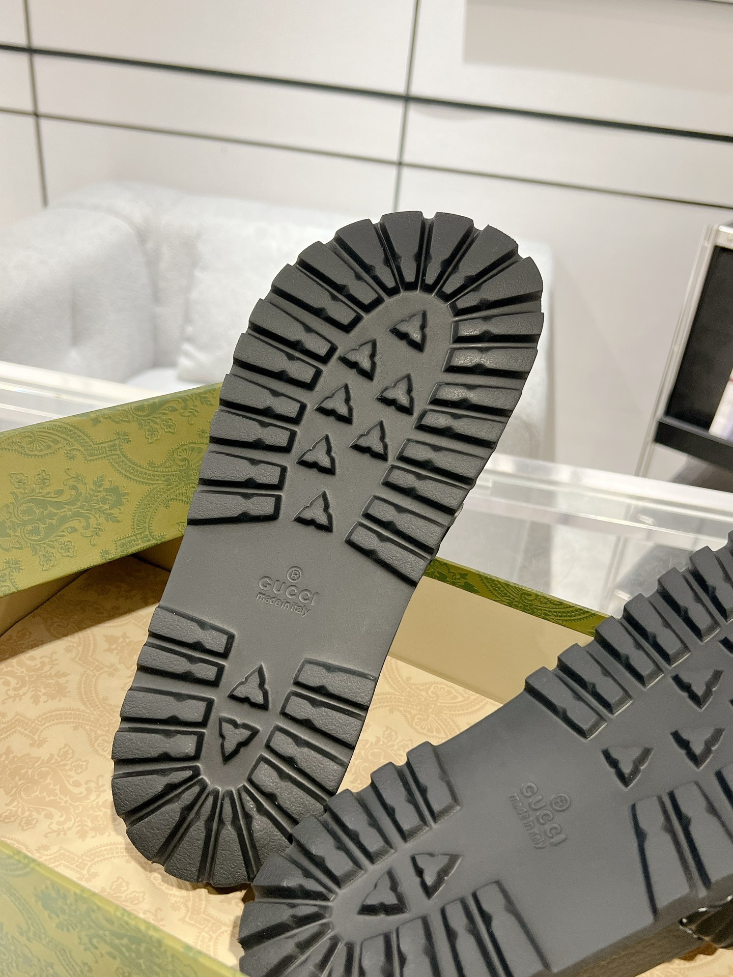 这款鞋子是AAAAA 1:1 质量 (非常棒). 使用了和原版一模一样的材料. 商标部分也保持了和古奇/Gucci一样. 图片拍摄是实物鞋子拍摄, 您所收到的实物保证和我们图片一模一样.