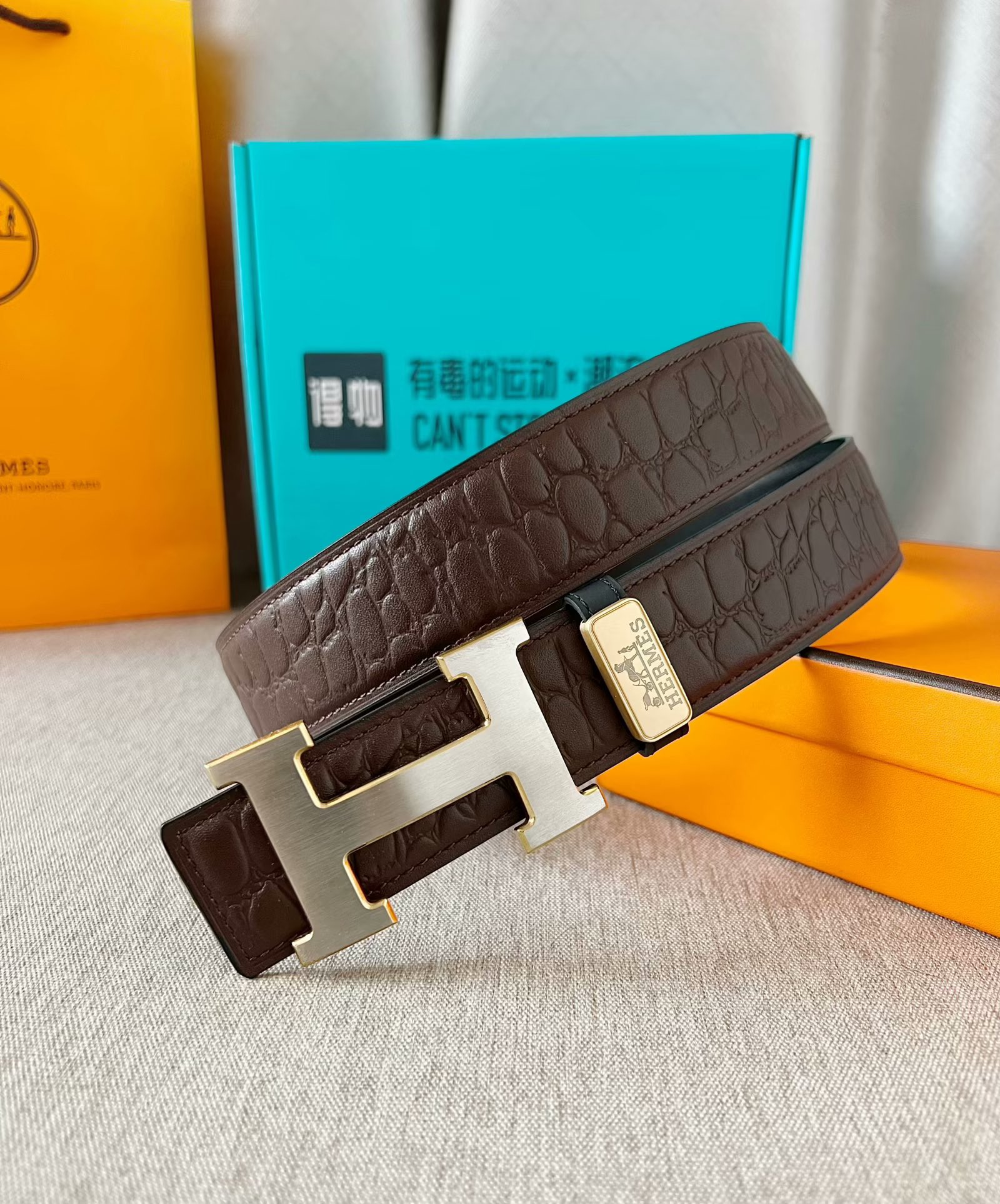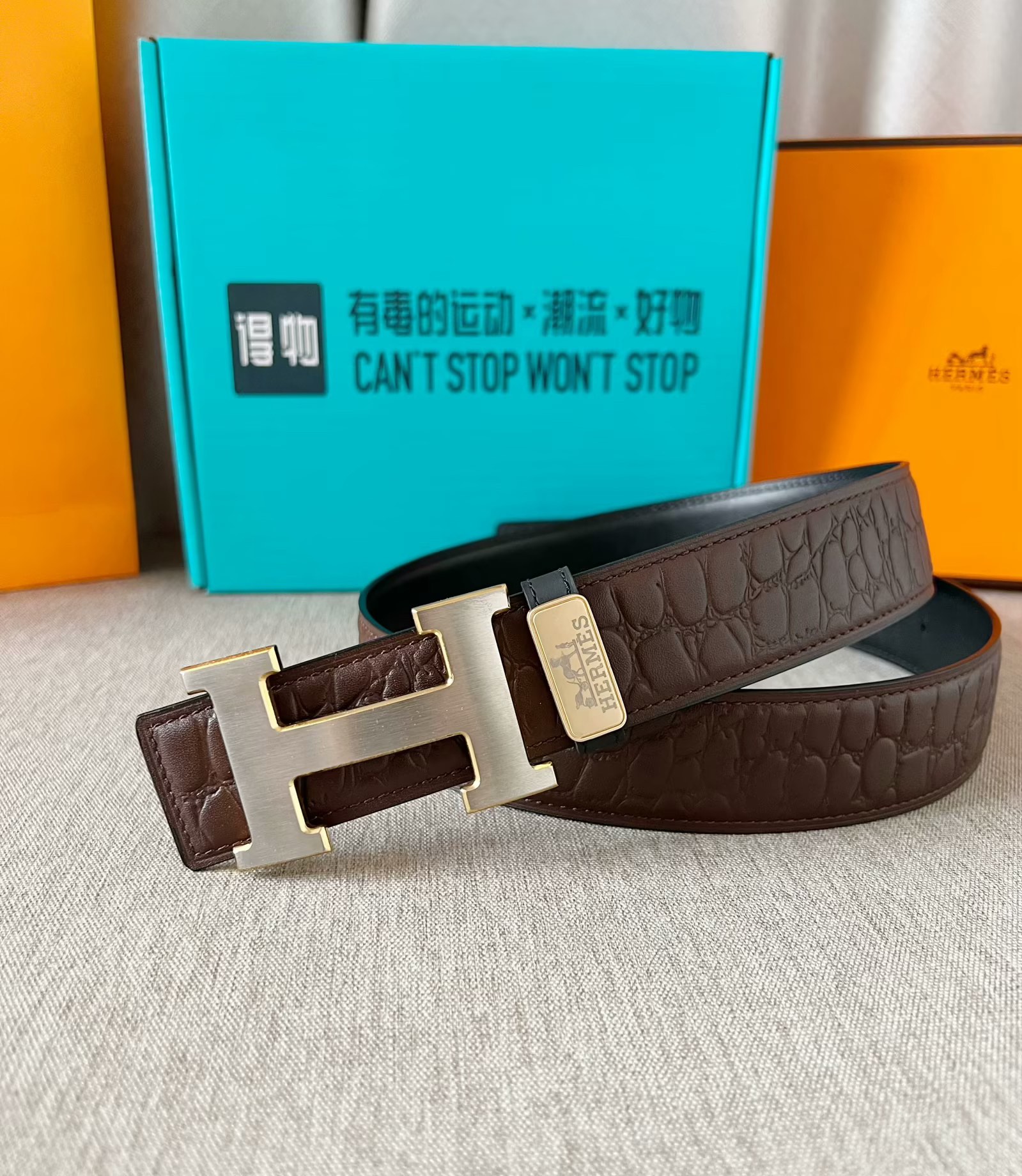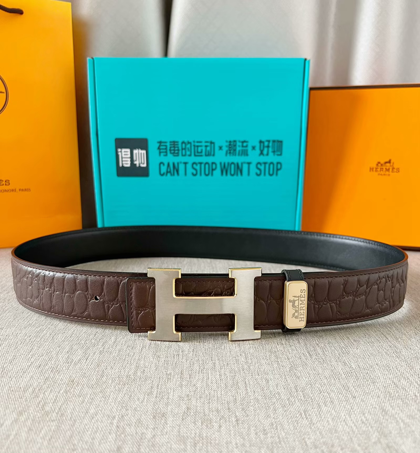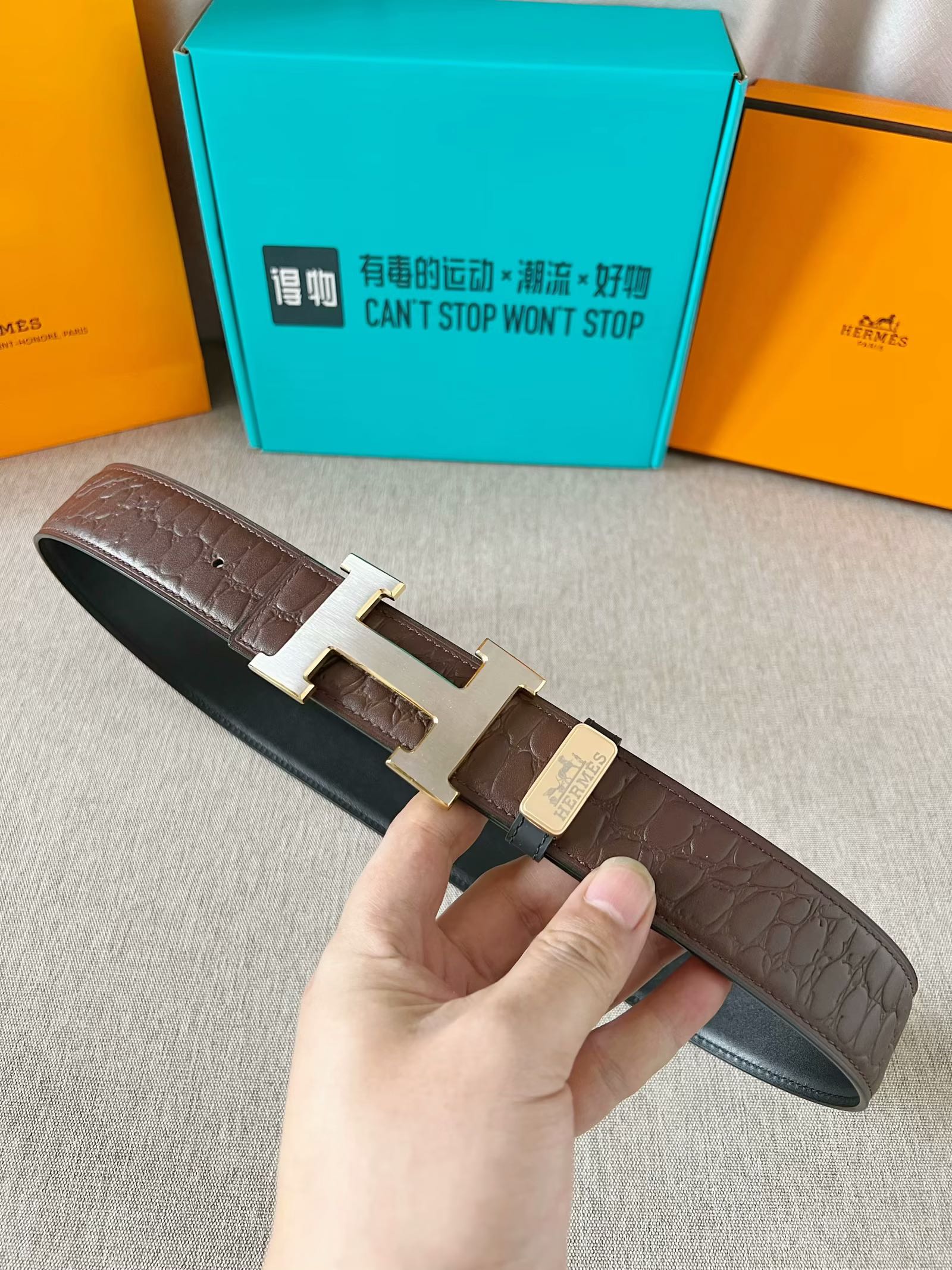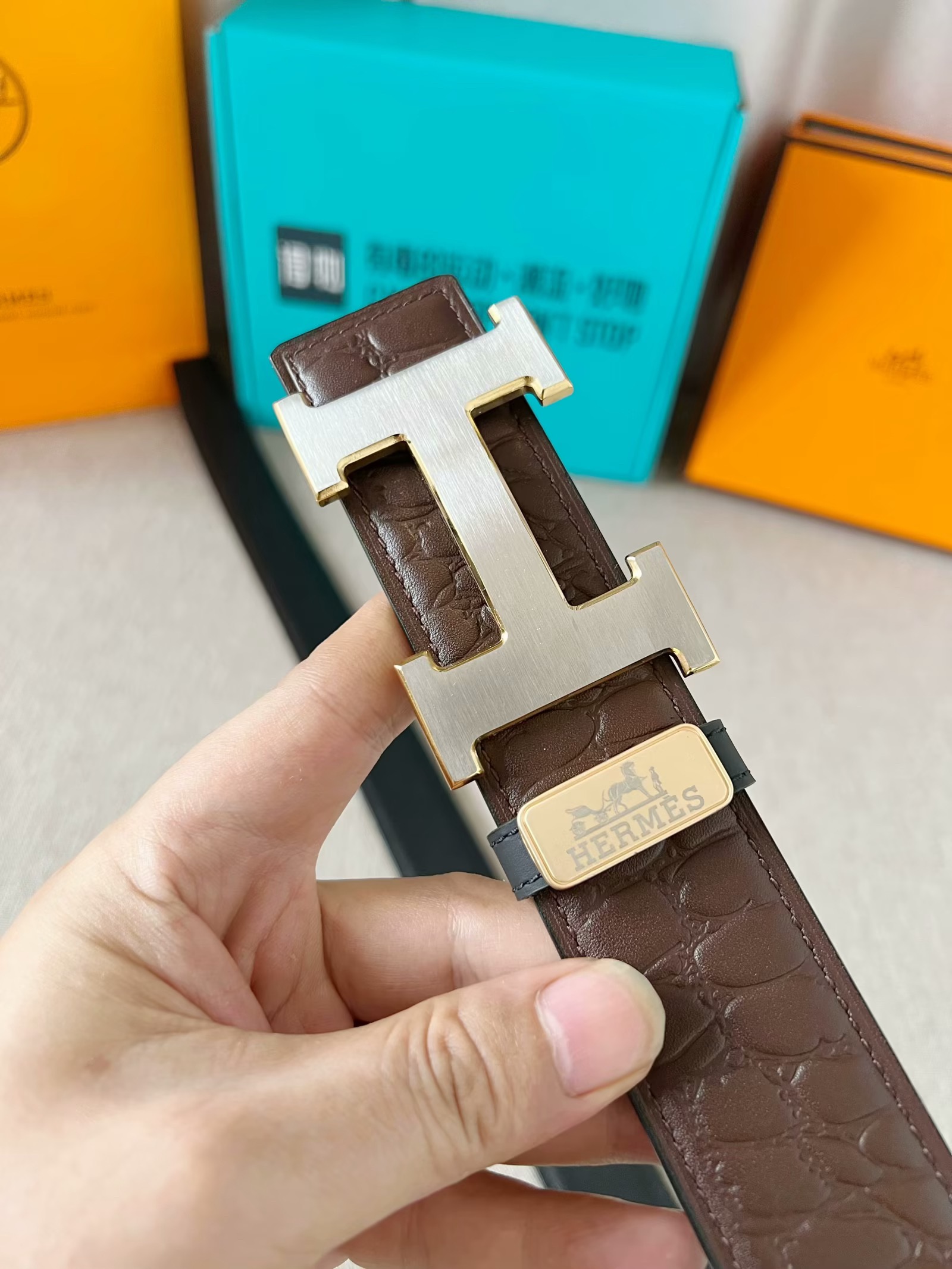 这款皮带是AAAAA 1:1 质量 (非常棒). 使用了和原版一模一样的材料. 商标部分也保持了和爱马仕/Hermes一样. 图片拍摄是实物皮带拍摄, 您所收到的实物保证和我们图片一模一样.