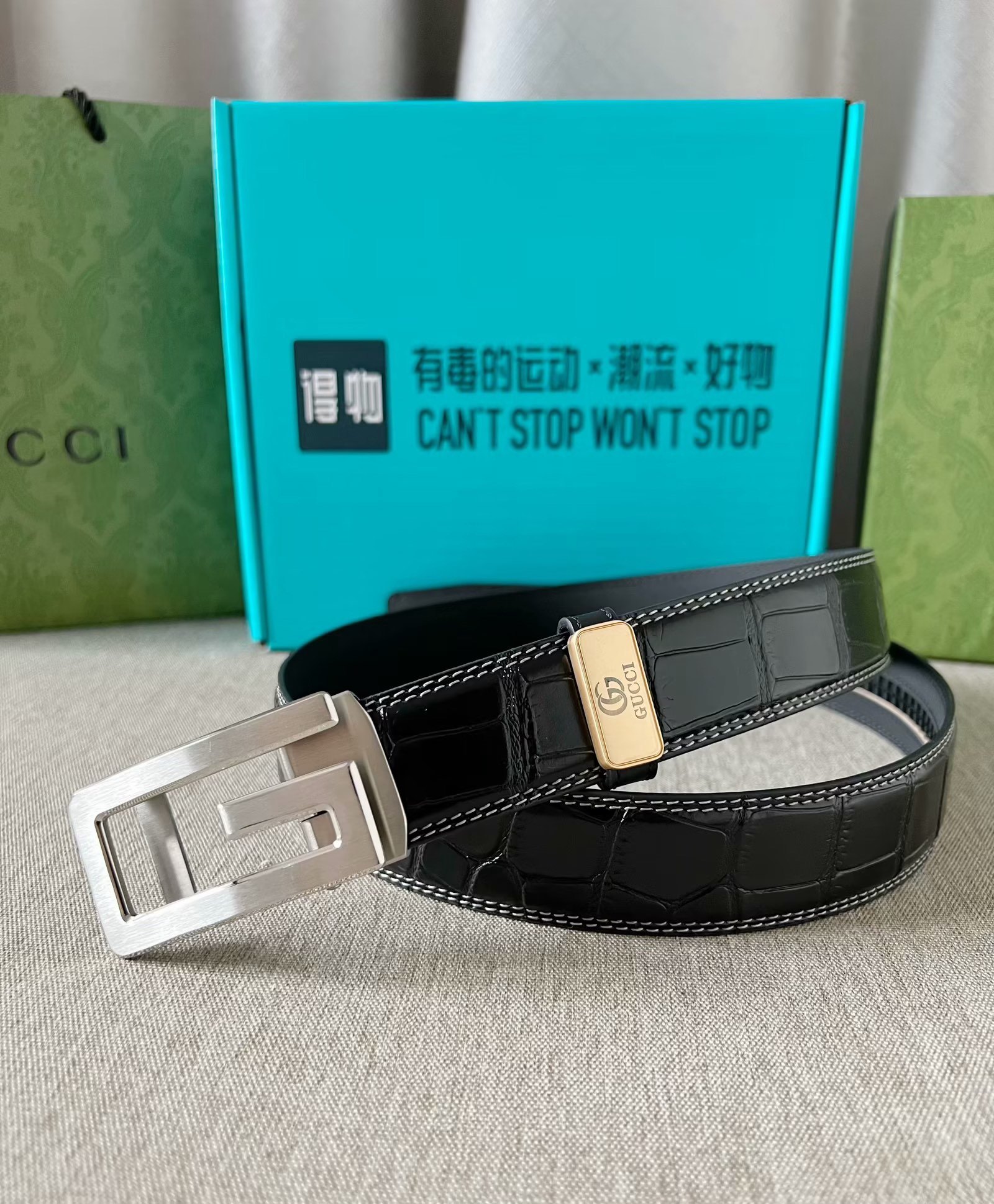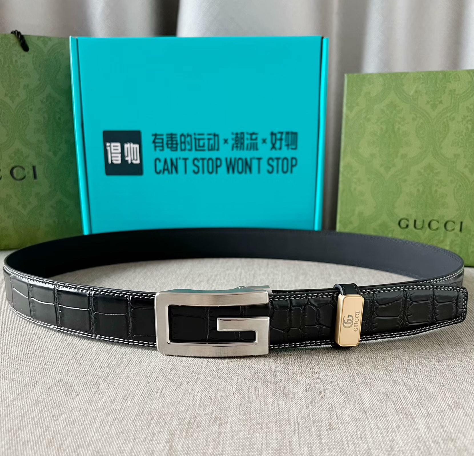 这款皮带是AAAAA 1:1 质量 (非常棒). 使用了和原版一模一样的材料. 商标部分也保持了和古奇/Gucci一样. 图片拍摄是实物皮带拍摄, 您所收到的实物保证和我们图片一模一样.