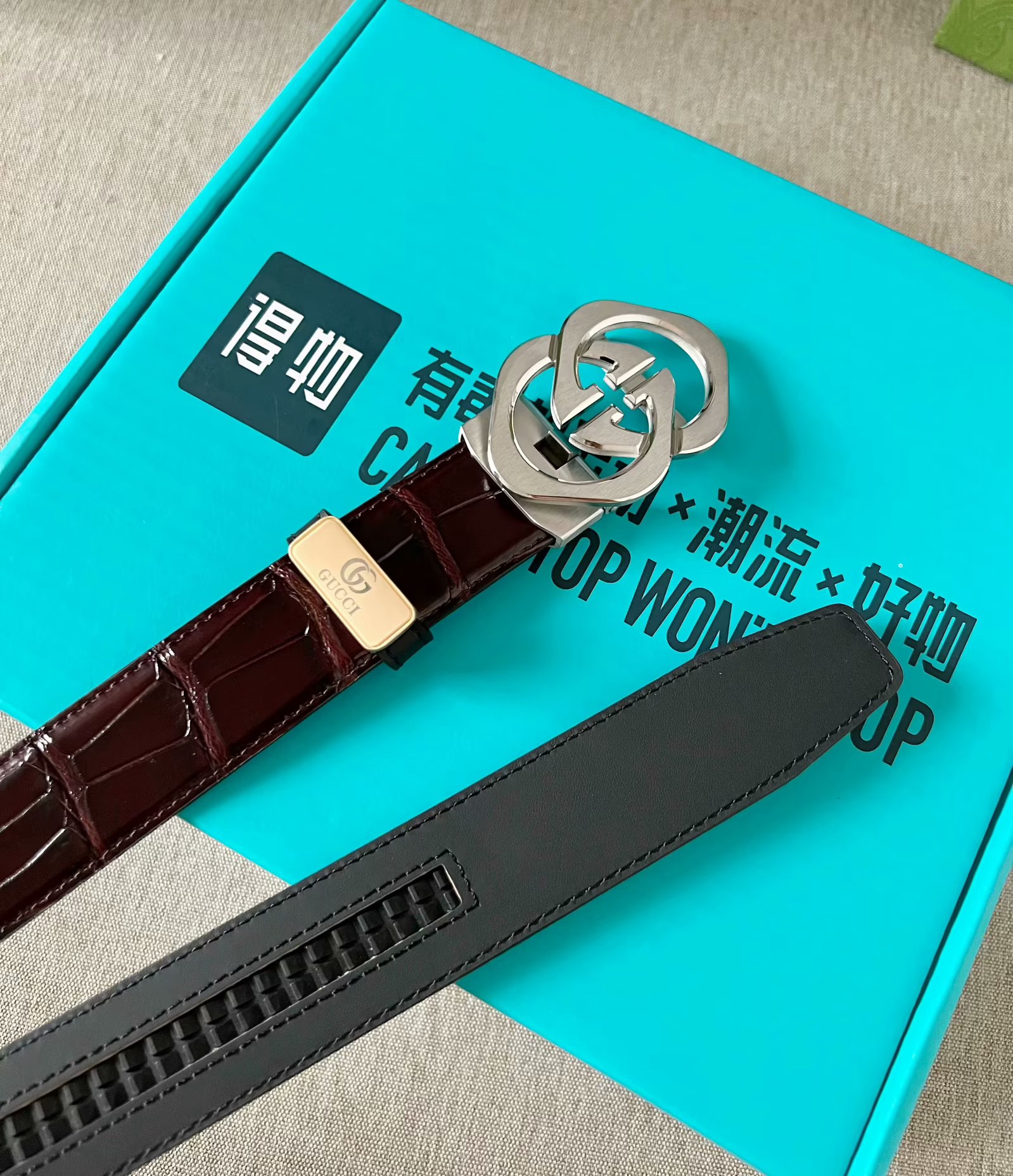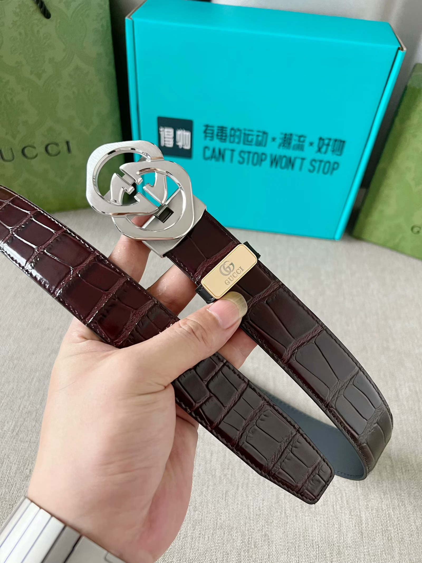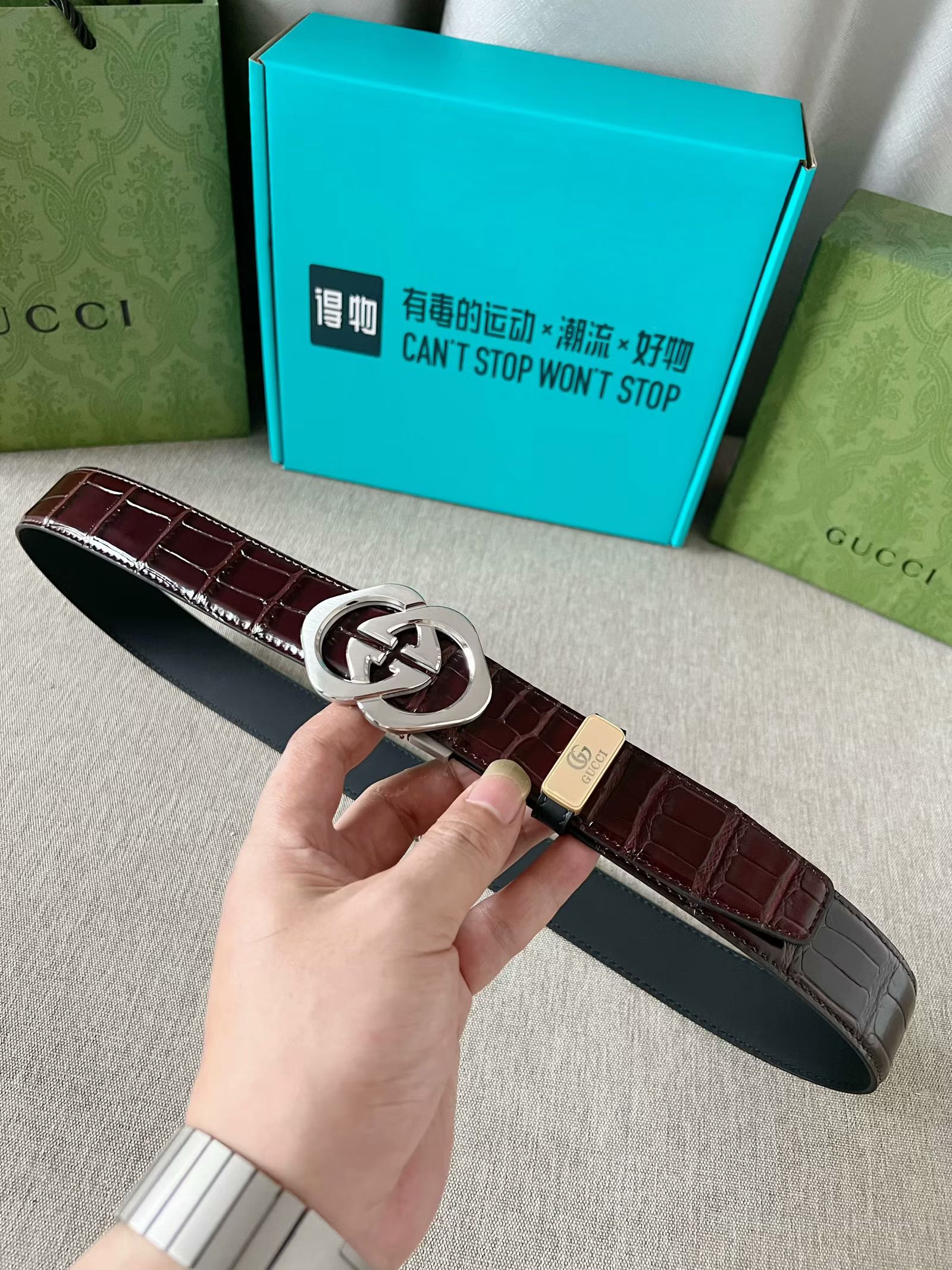 这款皮带是AAAAA 1:1 质量 (非常棒). 使用了和原版一模一样的材料. 商标部分也保持了和古奇/Gucci一样. 图片拍摄是实物皮带拍摄, 您所收到的实物保证和我们图片一模一样.