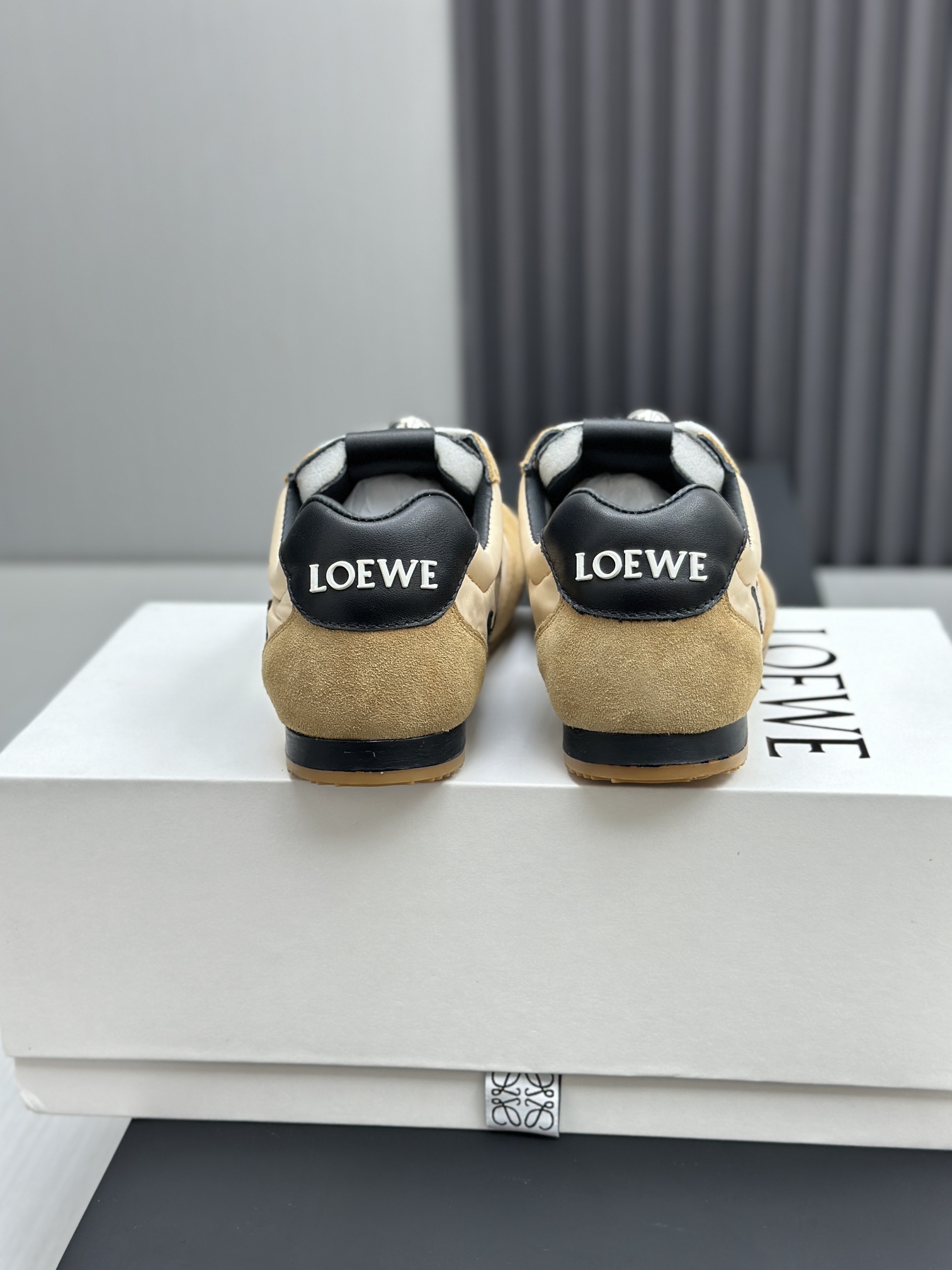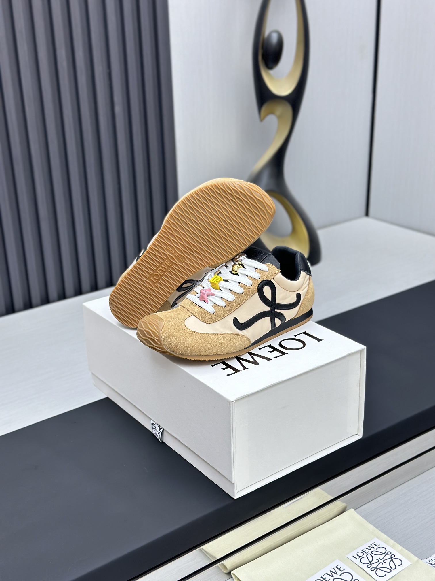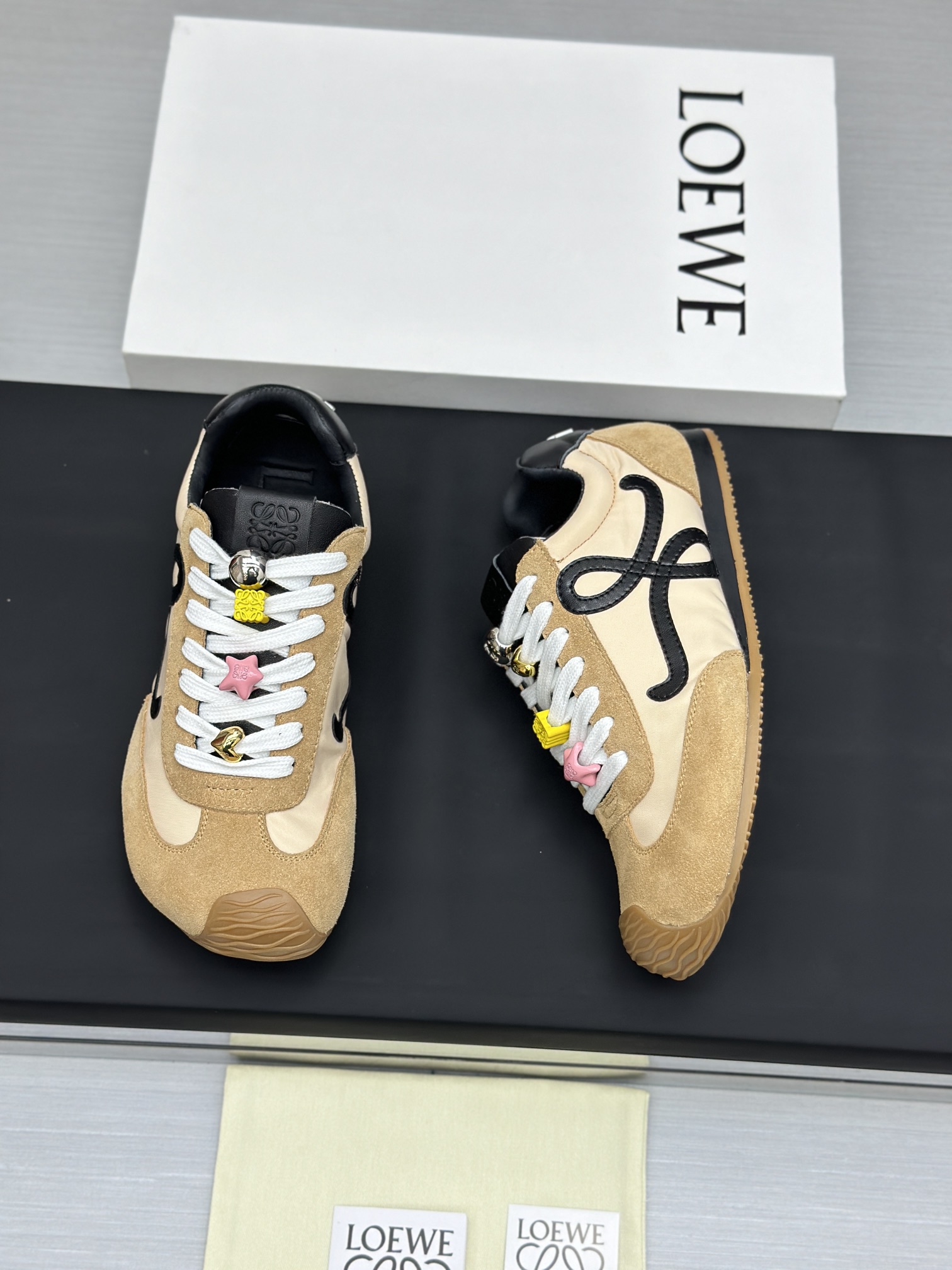 这款鞋子是AAAAA 1:1 质量 (非常棒). 使用了和原版一模一样的材料. 商标部分也保持了和罗意威/Loewe一样. 图片拍摄是实物鞋子拍摄, 您所收到的实物保证和我们图片一模一样.