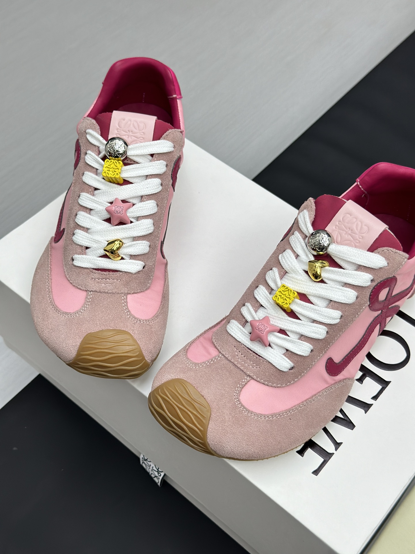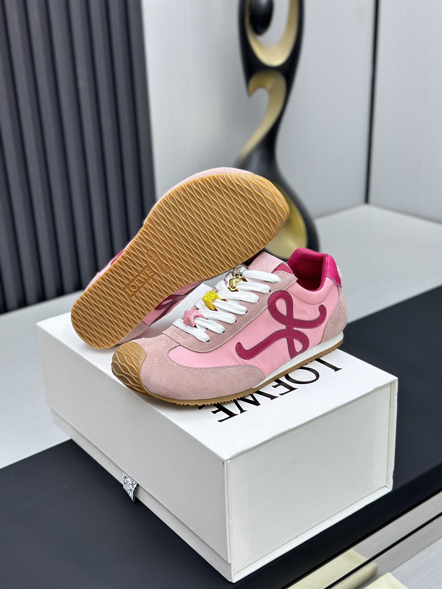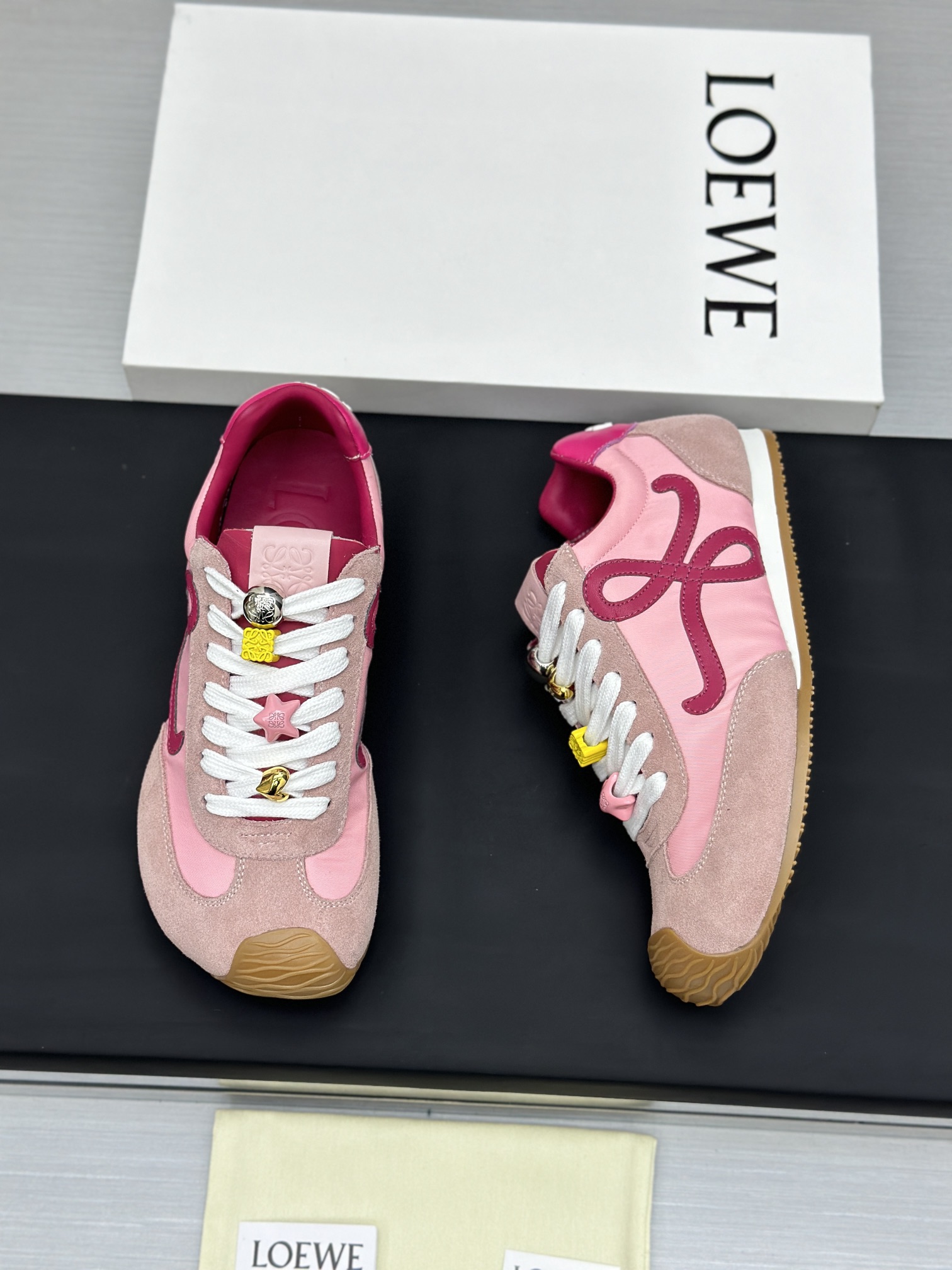 这款鞋子是AAAAA 1:1 质量 (非常棒). 使用了和原版一模一样的材料. 商标部分也保持了和罗意威/Loewe一样. 图片拍摄是实物鞋子拍摄, 您所收到的实物保证和我们图片一模一样.