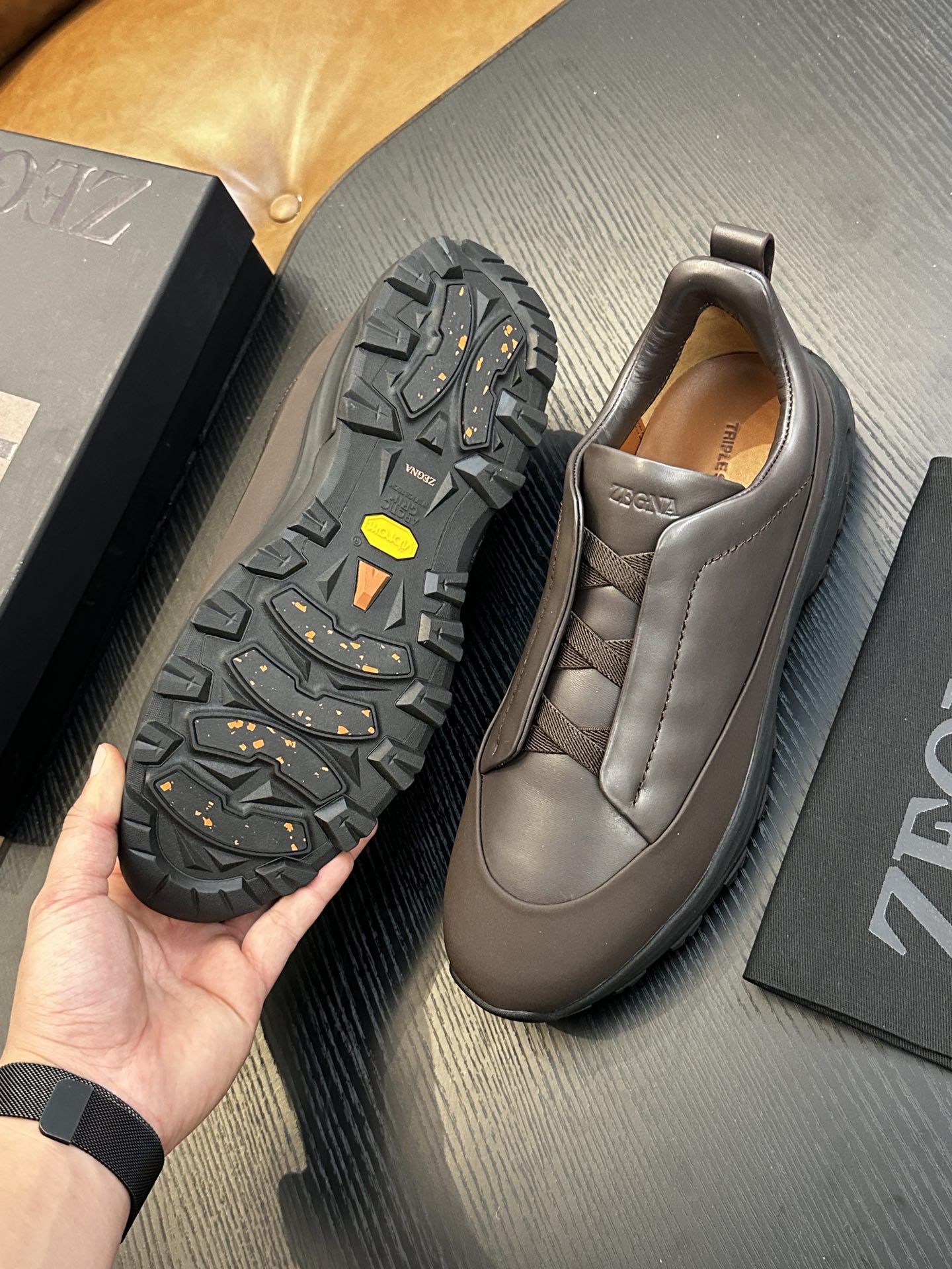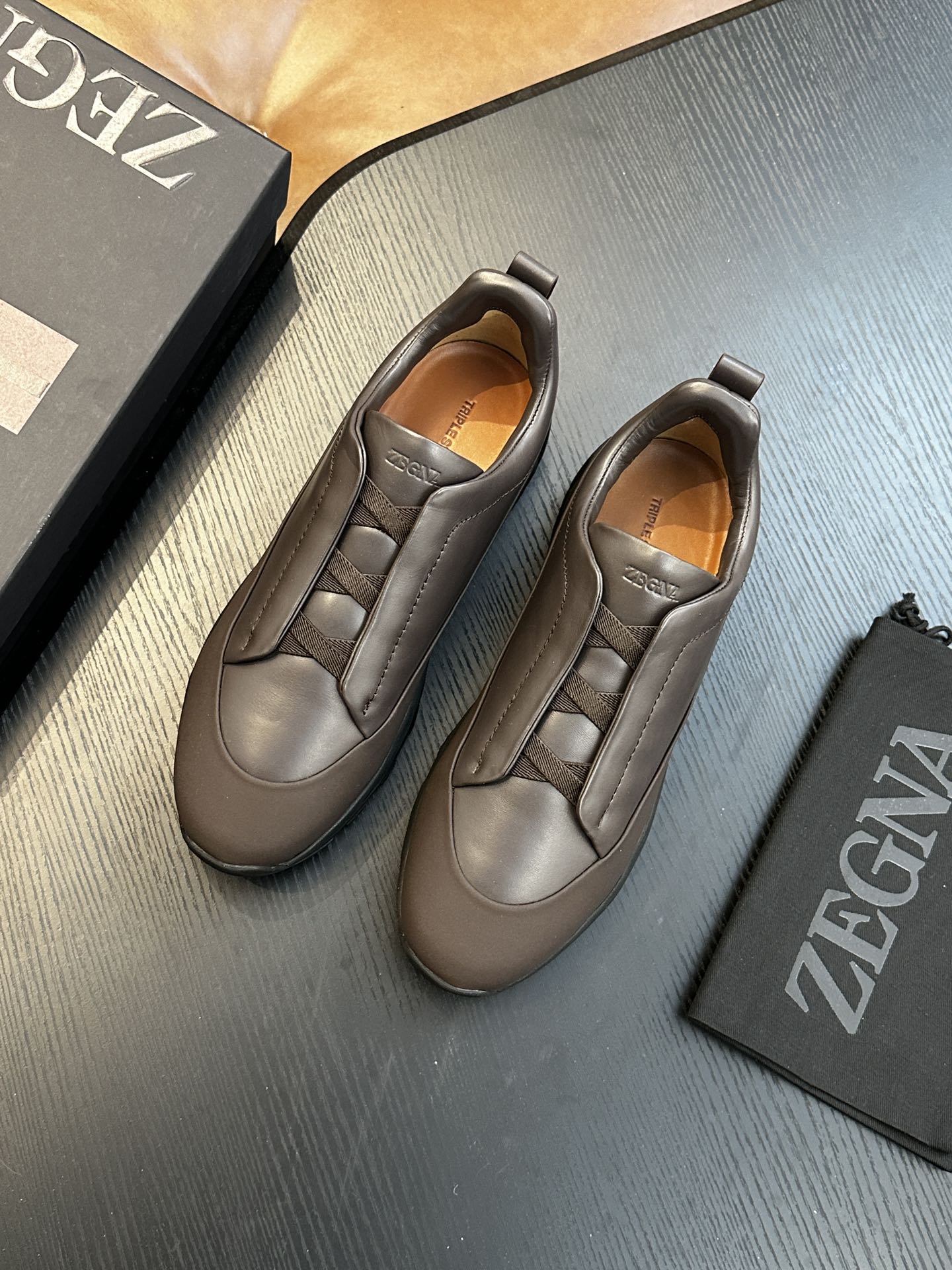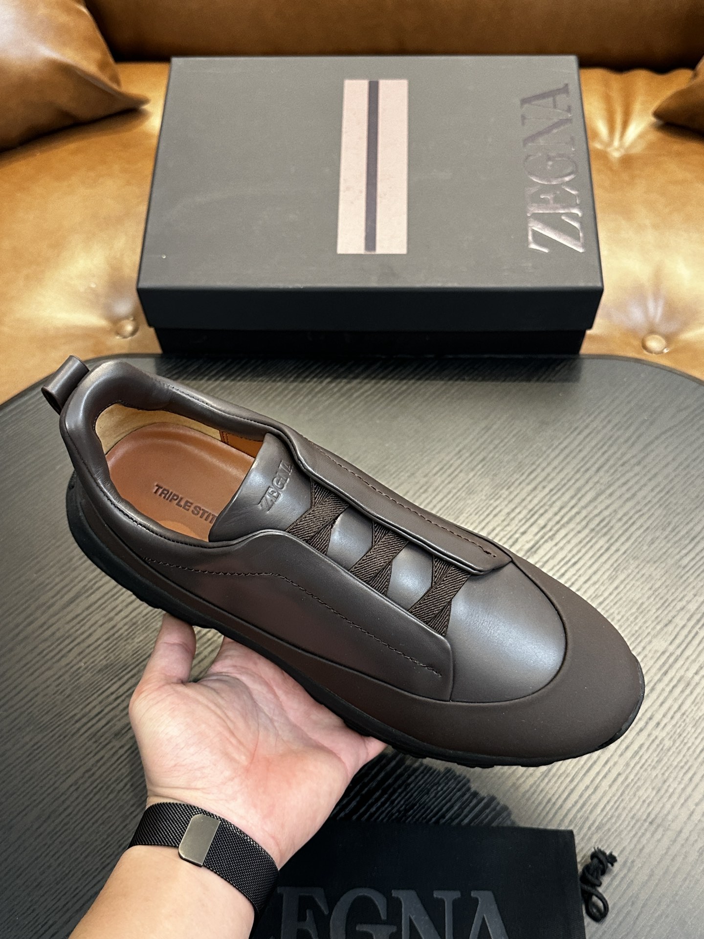 这款鞋子是AAAAA 1:1 质量 (非常棒). 使用了和原版一模一样的材料. 商标部分也保持了和杰尼亚/Zegna一样. 图片拍摄是实物鞋子拍摄, 您所收到的实物保证和我们图片一模一样.