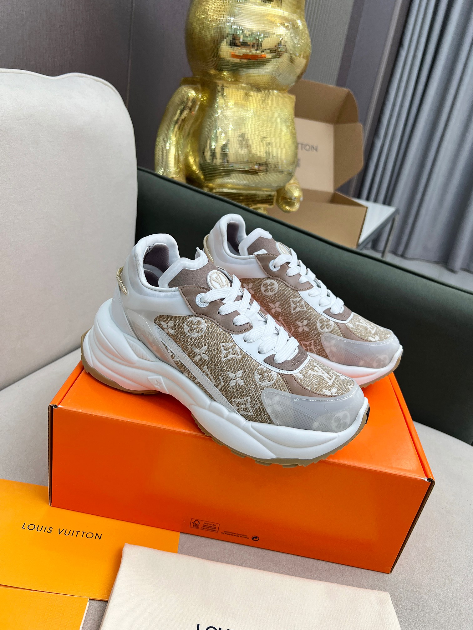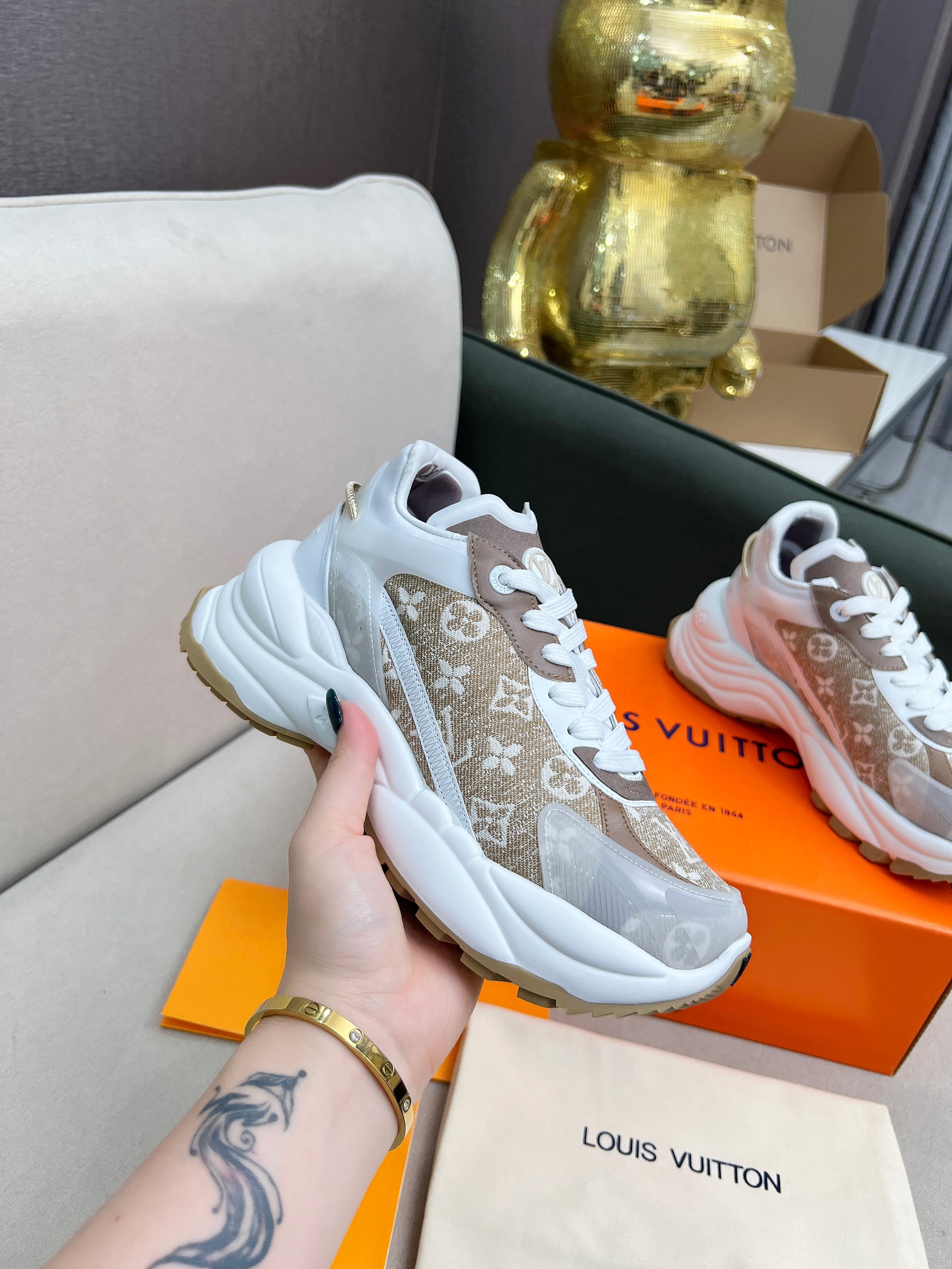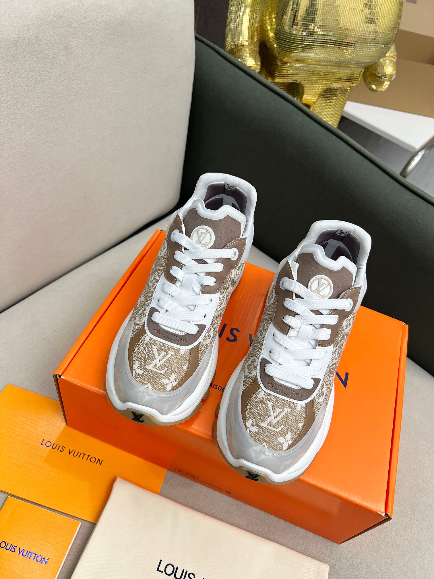 这款鞋子是AAAAA 1:1 质量 (非常棒). 使用了和原版一模一样的材料. 商标部分也保持了和路易威登/Louis Vuitton一样. 图片拍摄是实物鞋子拍摄, 您所收到的实物保证和我们图片一模一样.