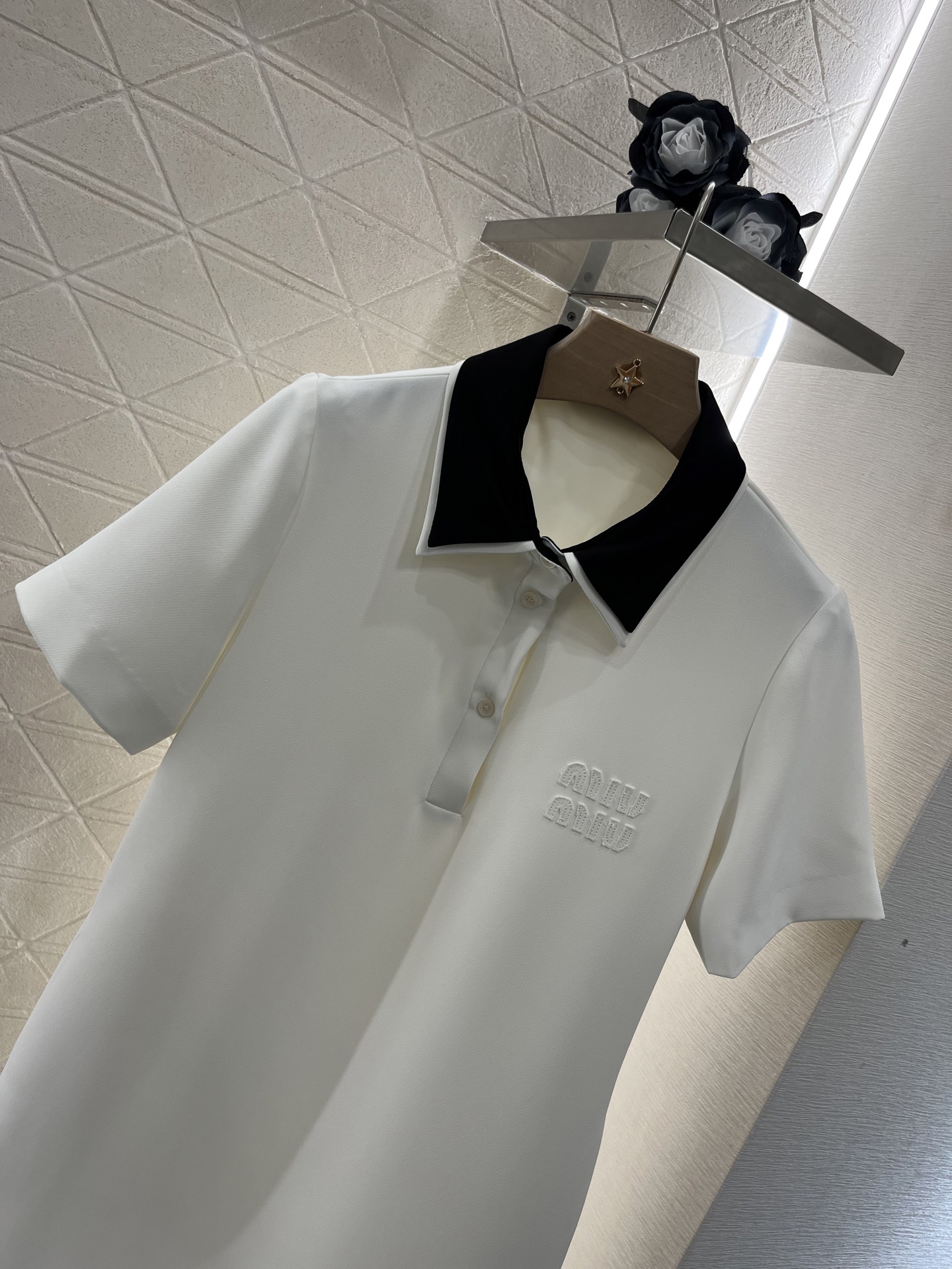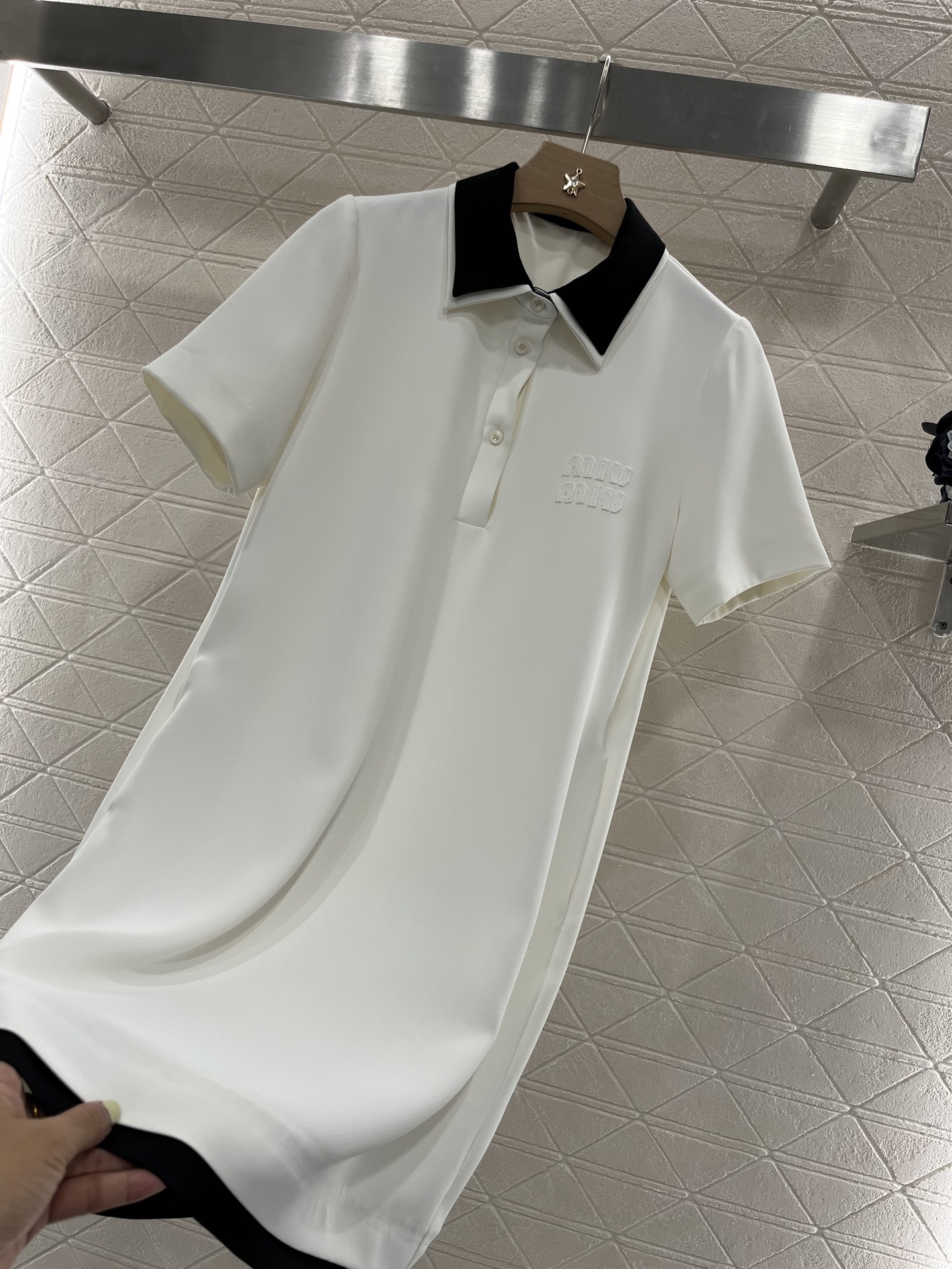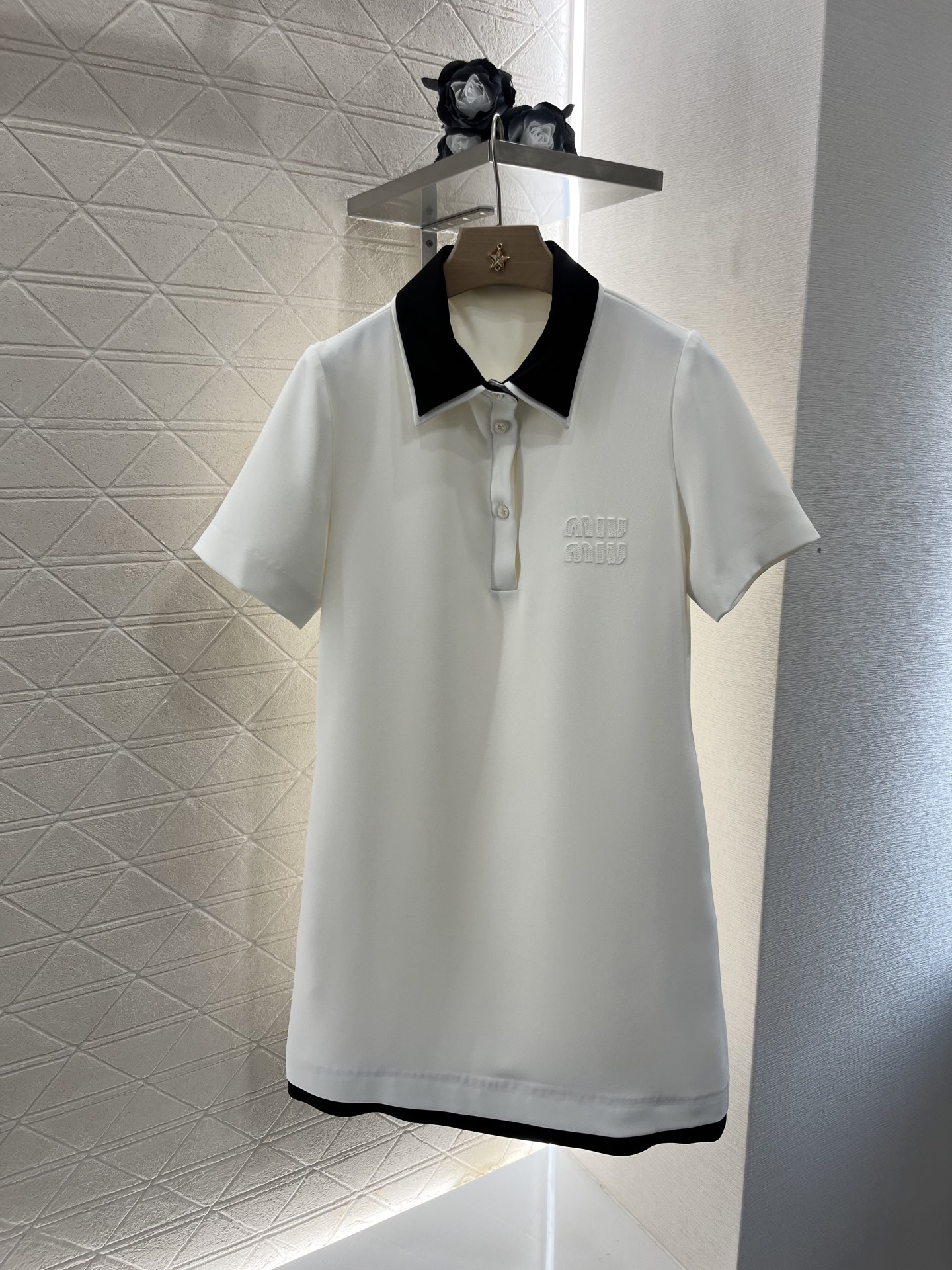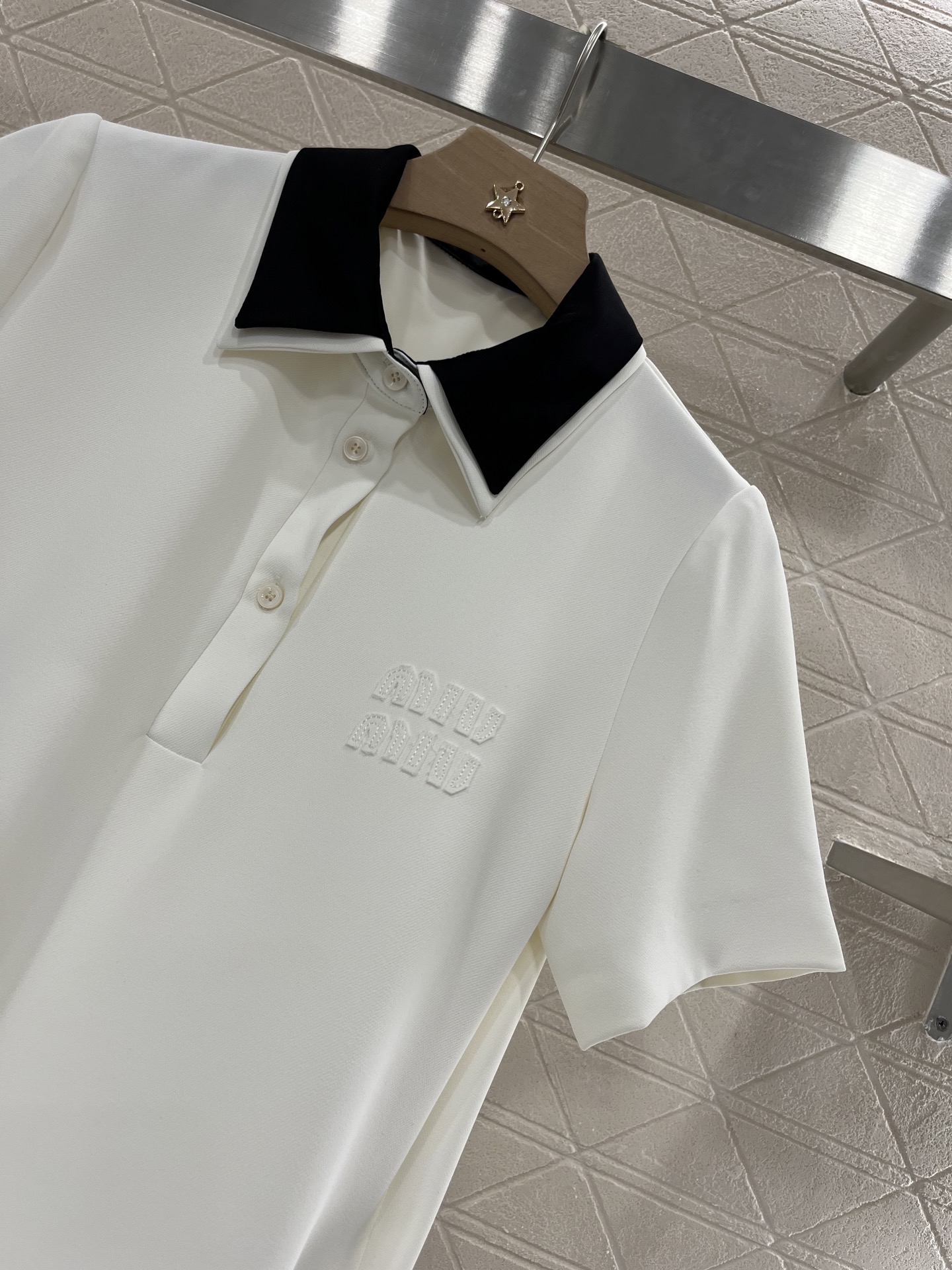 这款衣服是AAAAA 1:1 质量 (非常棒). 使用了和原版一模一样的材料. 商标部分也保持了和缪缪/Miu Miu一样. 图片拍摄是实物衣服拍摄, 您所收到的实物保证和我们图片一模一样.