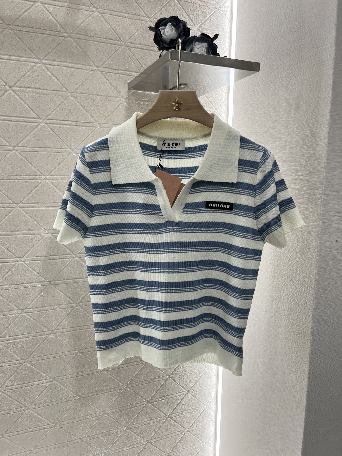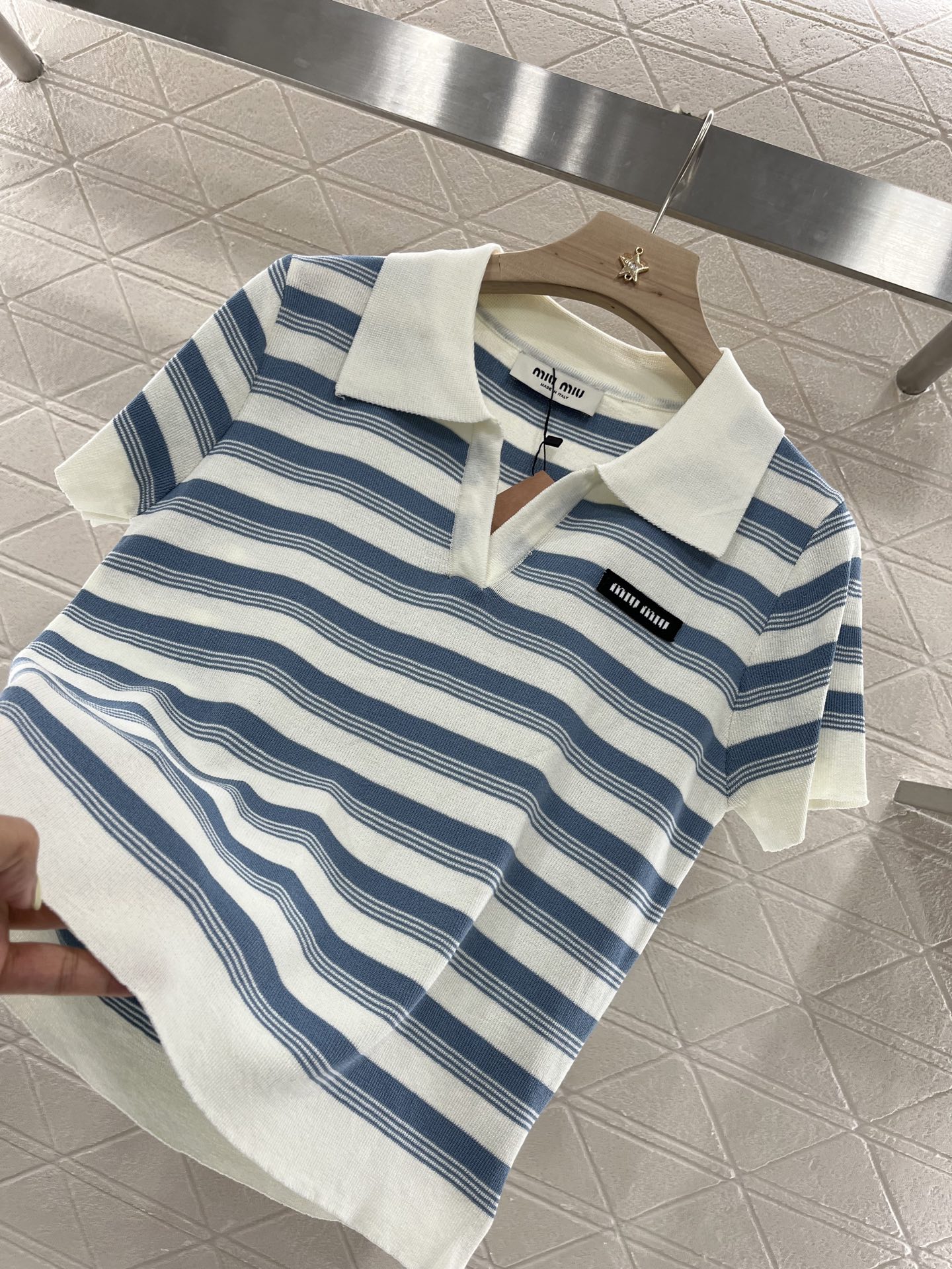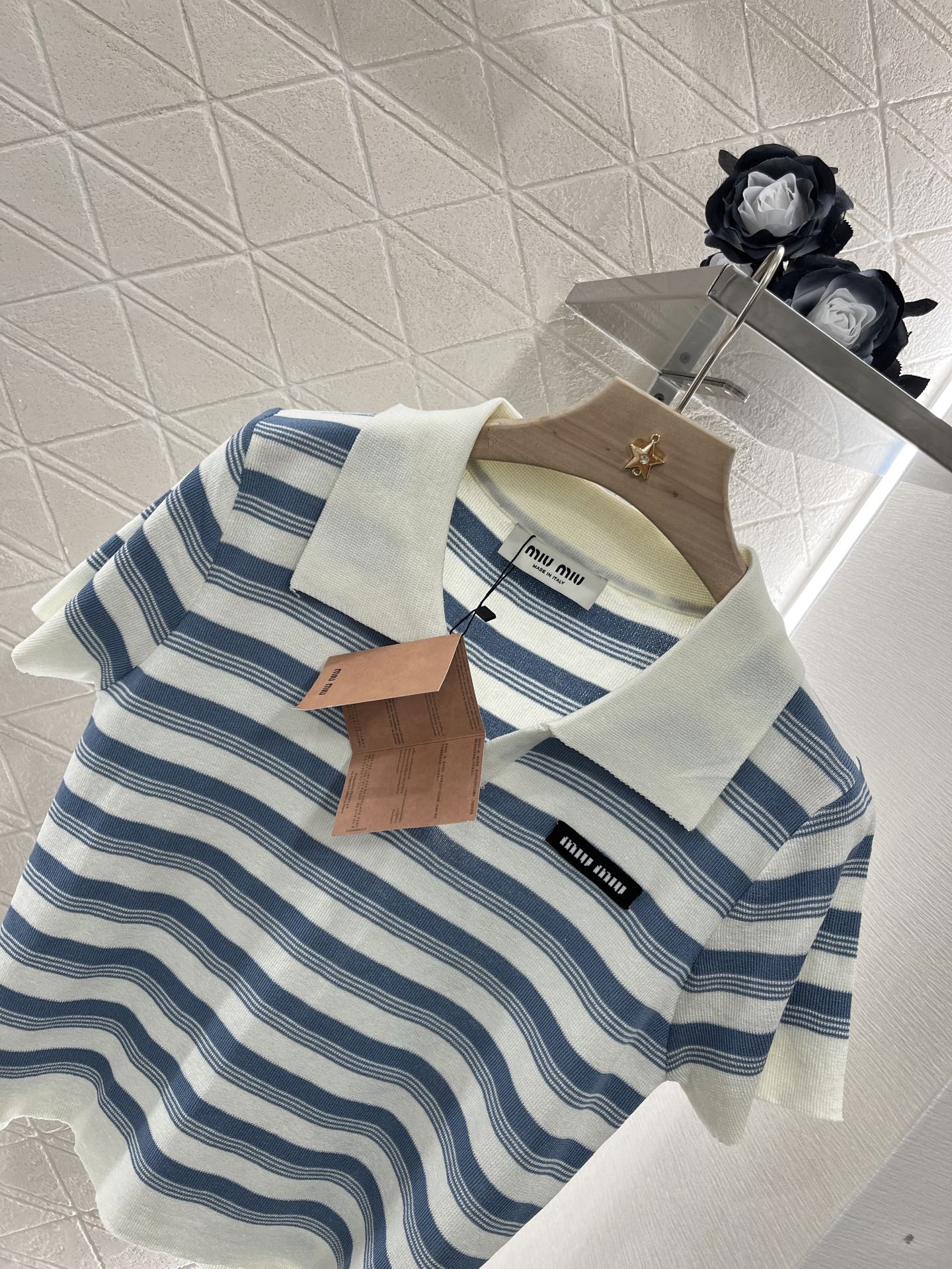 这款衣服是AAAAA 1:1 质量 (非常棒). 使用了和原版一模一样的材料. 商标部分也保持了和缪缪/Miu Miu一样. 图片拍摄是实物衣服拍摄, 您所收到的实物保证和我们图片一模一样.