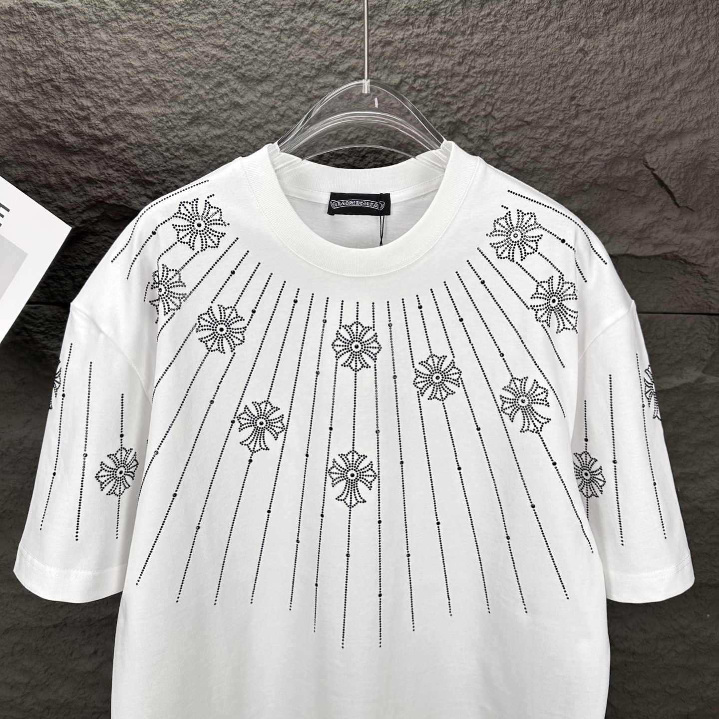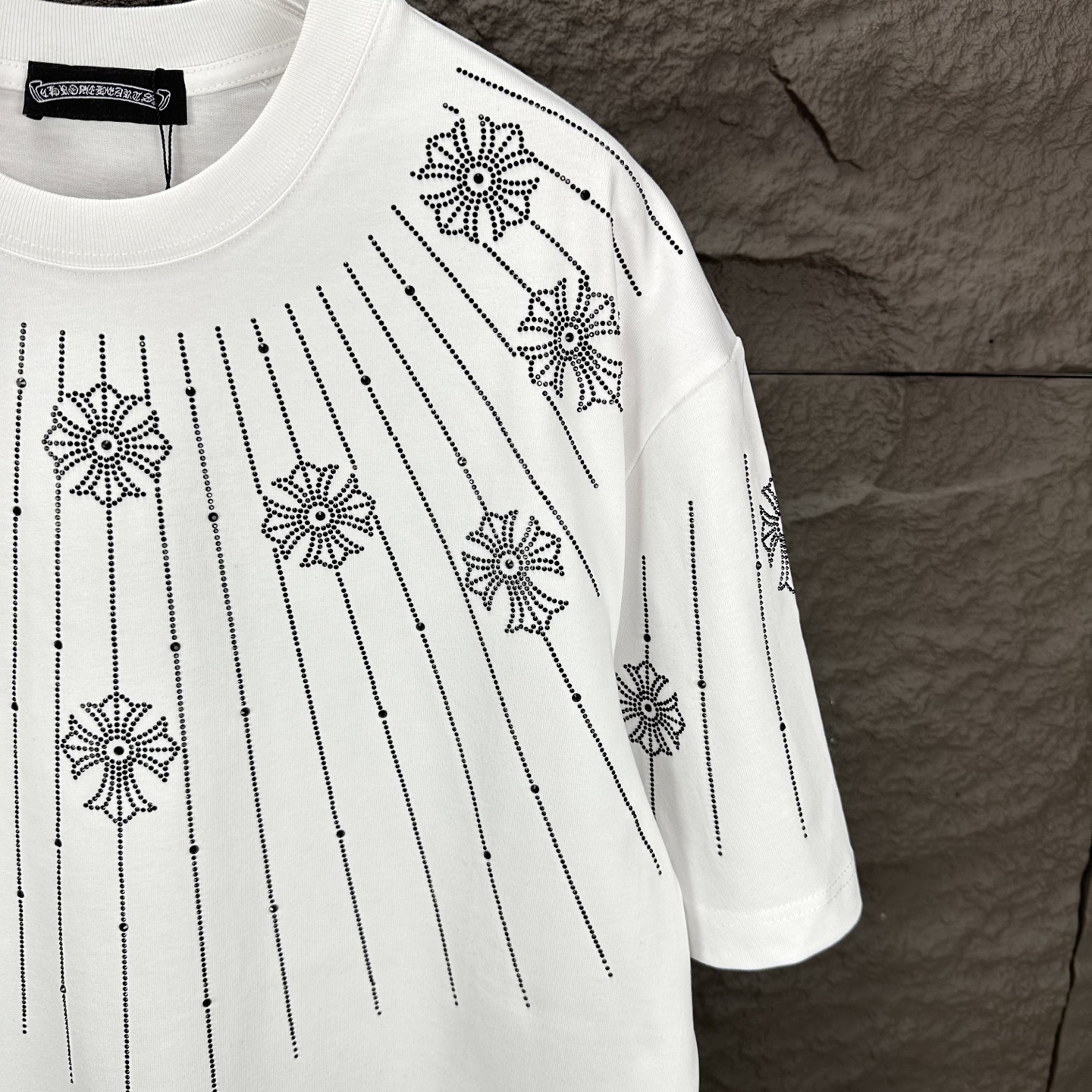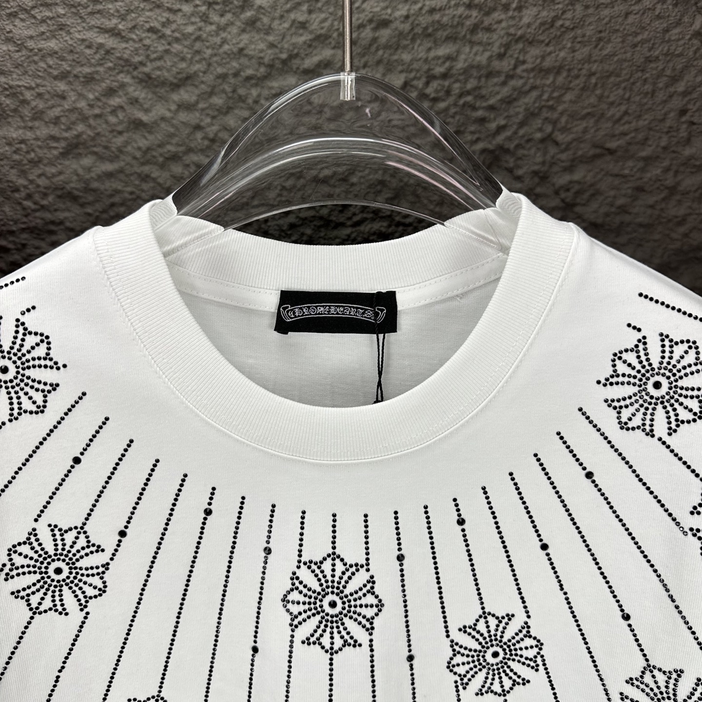 这款衣服是AAAAA 1:1 质量 (非常棒). 使用了和原版一模一样的材料. 商标部分也保持了和克罗心/Chrome Hearts一样. 图片拍摄是实物衣服拍摄, 您所收到的实物保证和我们图片一模一样.