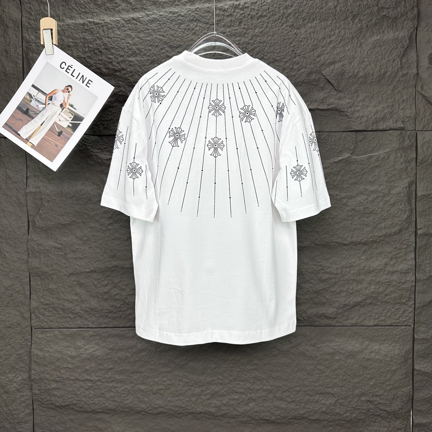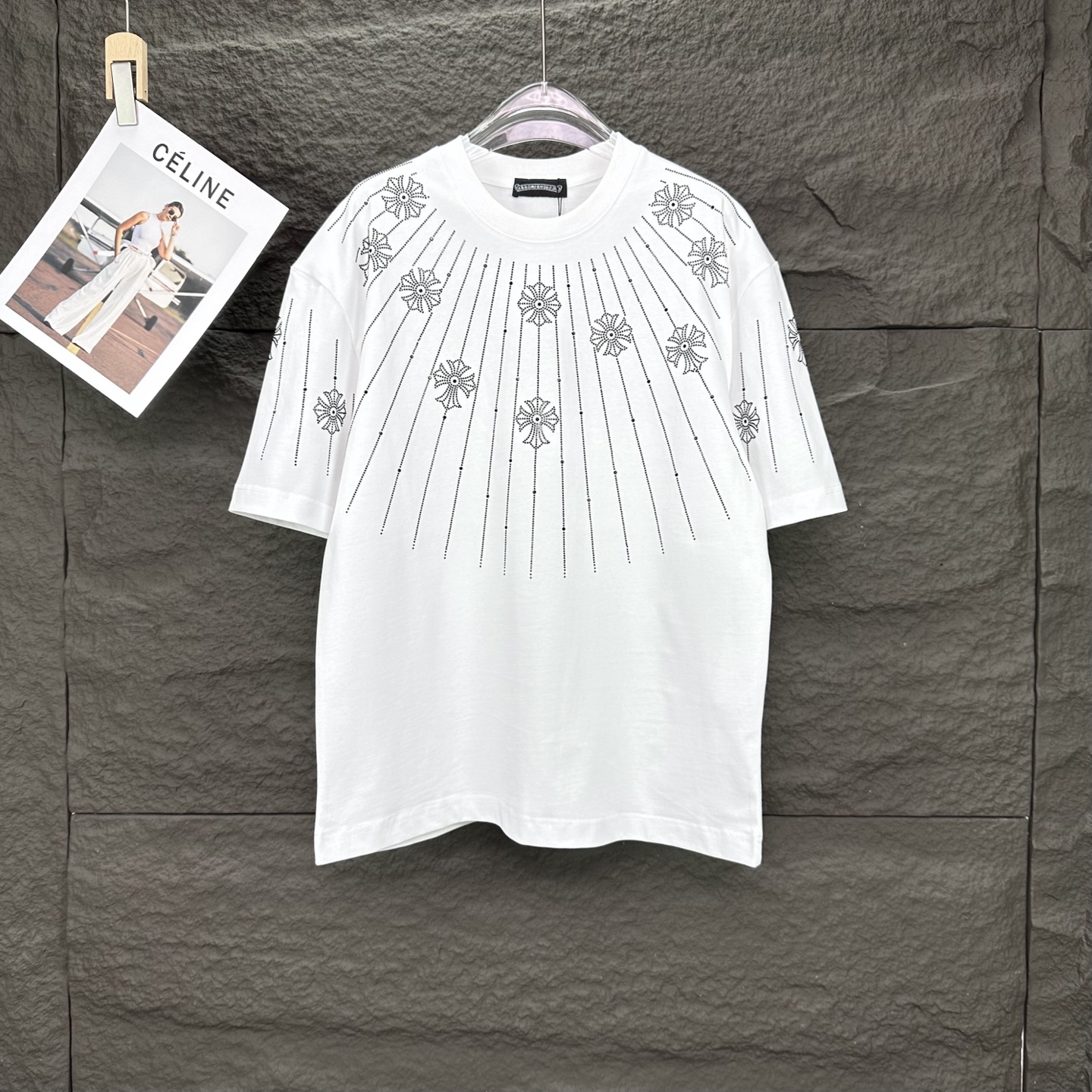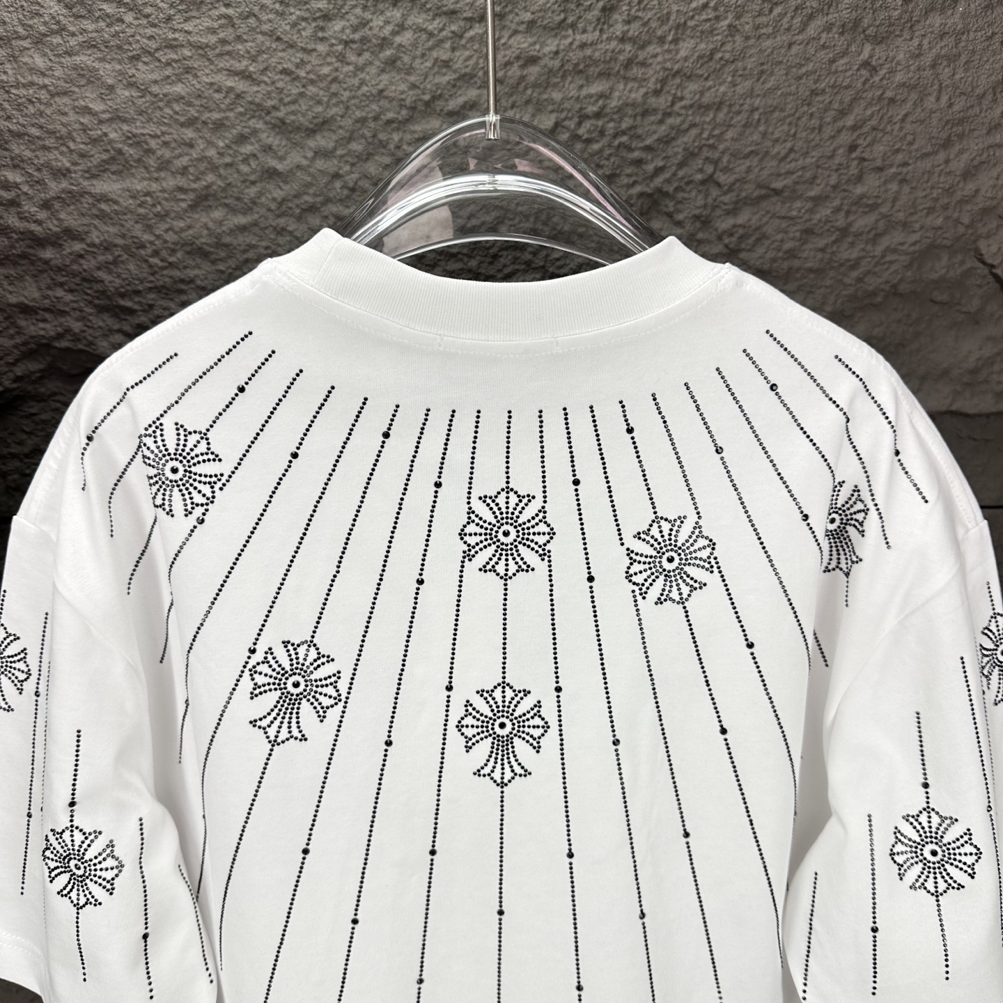 这款衣服是AAAAA 1:1 质量 (非常棒). 使用了和原版一模一样的材料. 商标部分也保持了和克罗心/Chrome Hearts一样. 图片拍摄是实物衣服拍摄, 您所收到的实物保证和我们图片一模一样.