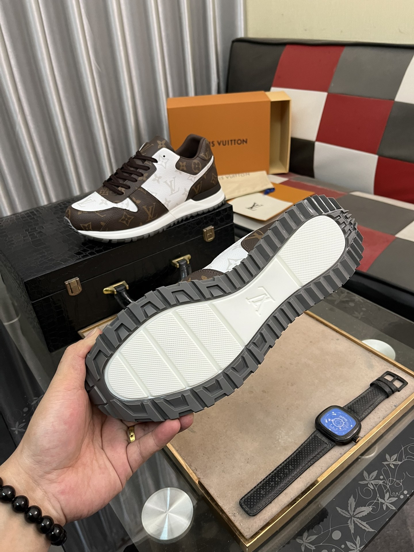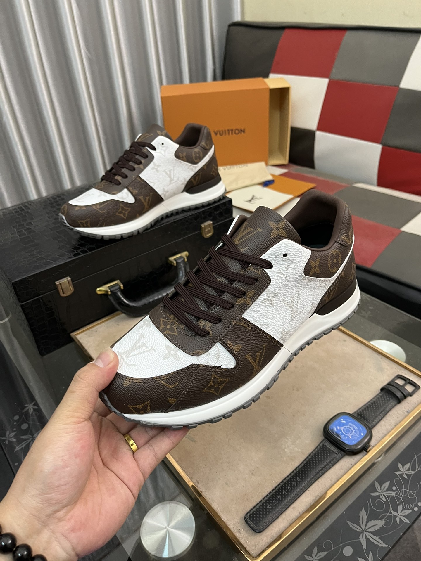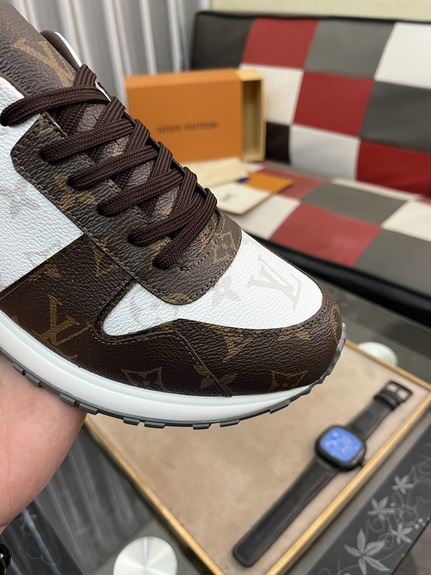 这款鞋子是AAAAA 1:1 质量 (非常棒). 使用了和原版一模一样的材料. 商标部分也保持了和路易威登/Louis Vuitton一样. 图片拍摄是实物鞋子拍摄, 您所收到的实物保证和我们图片一模一样.
