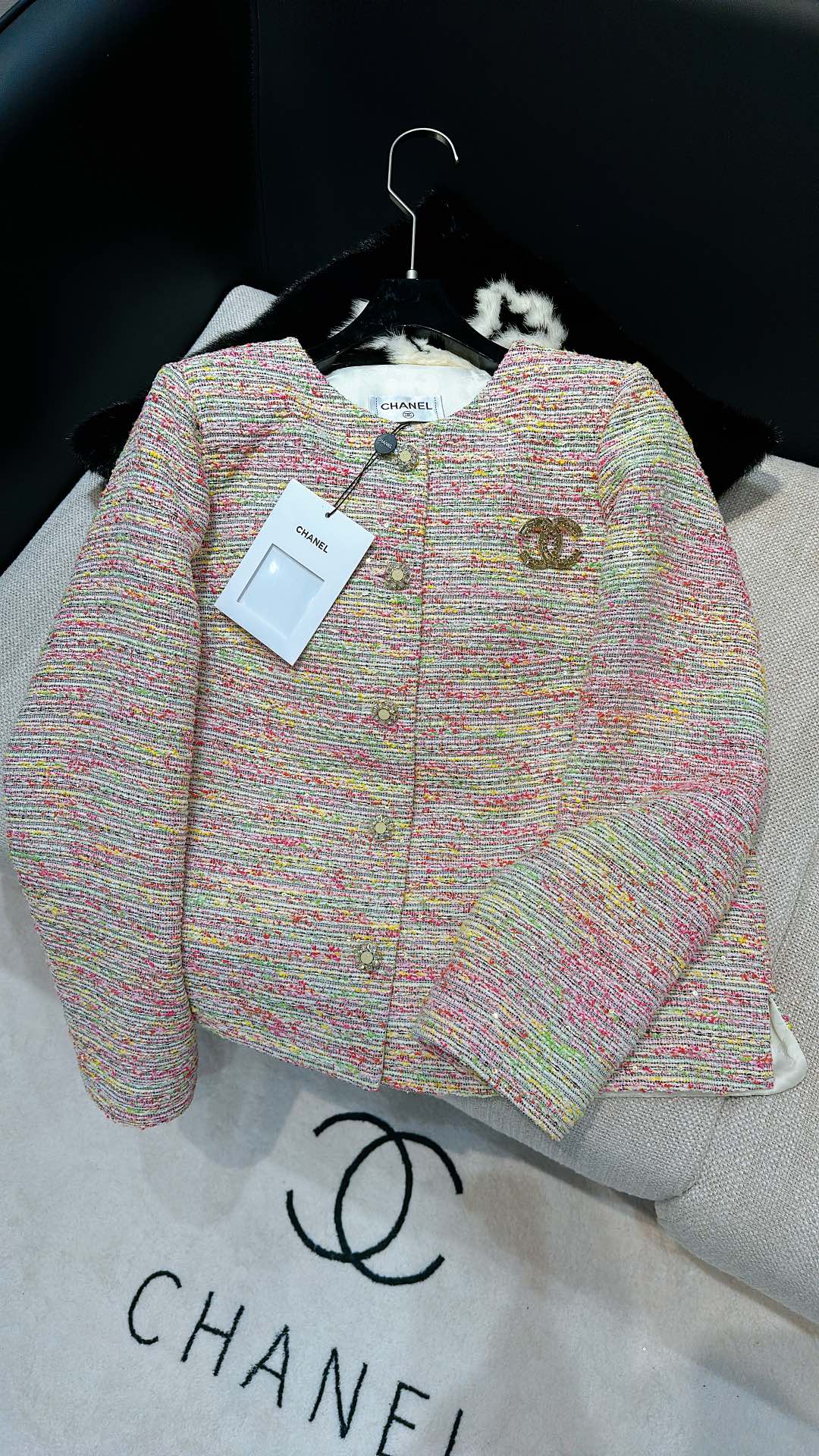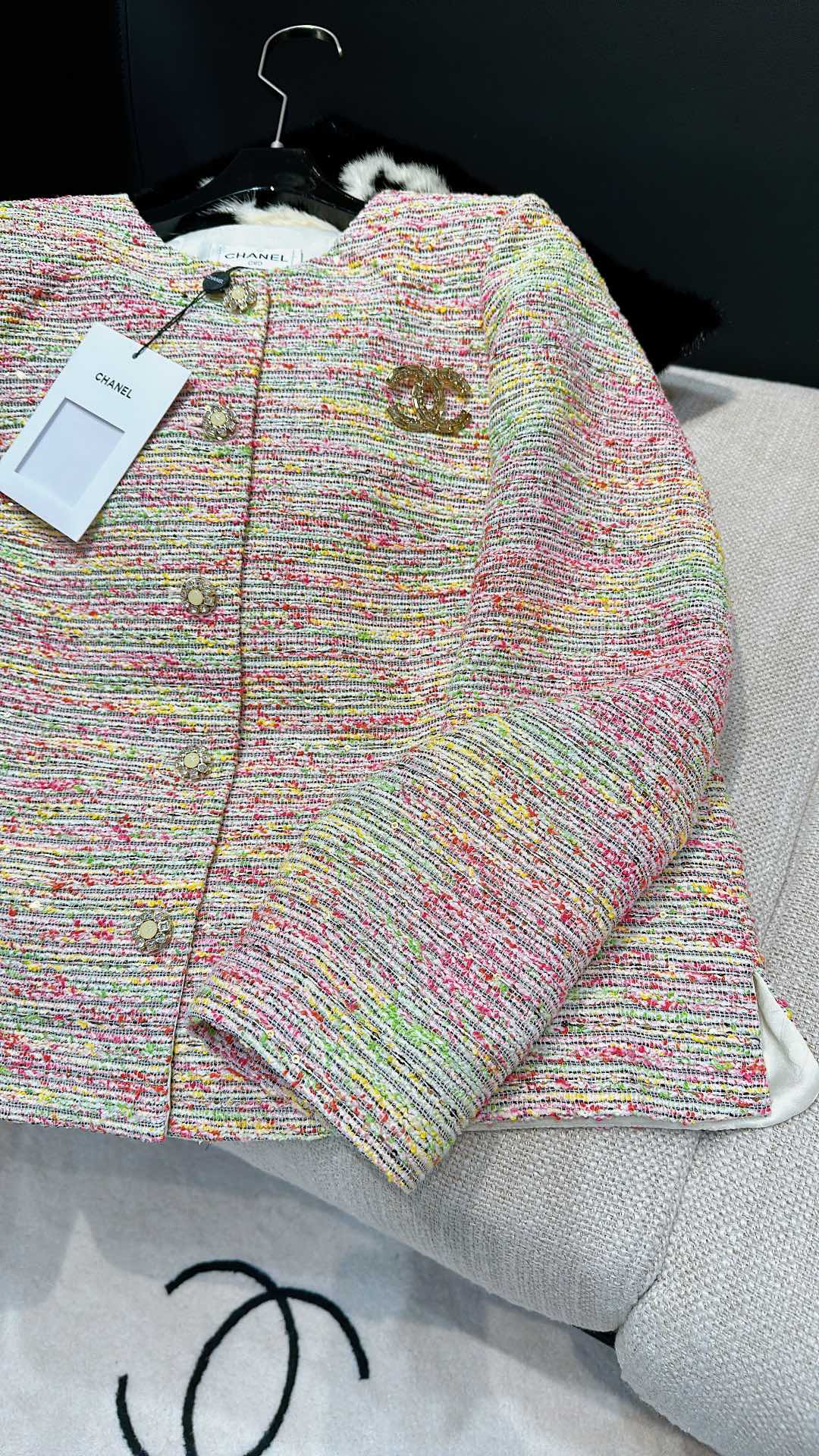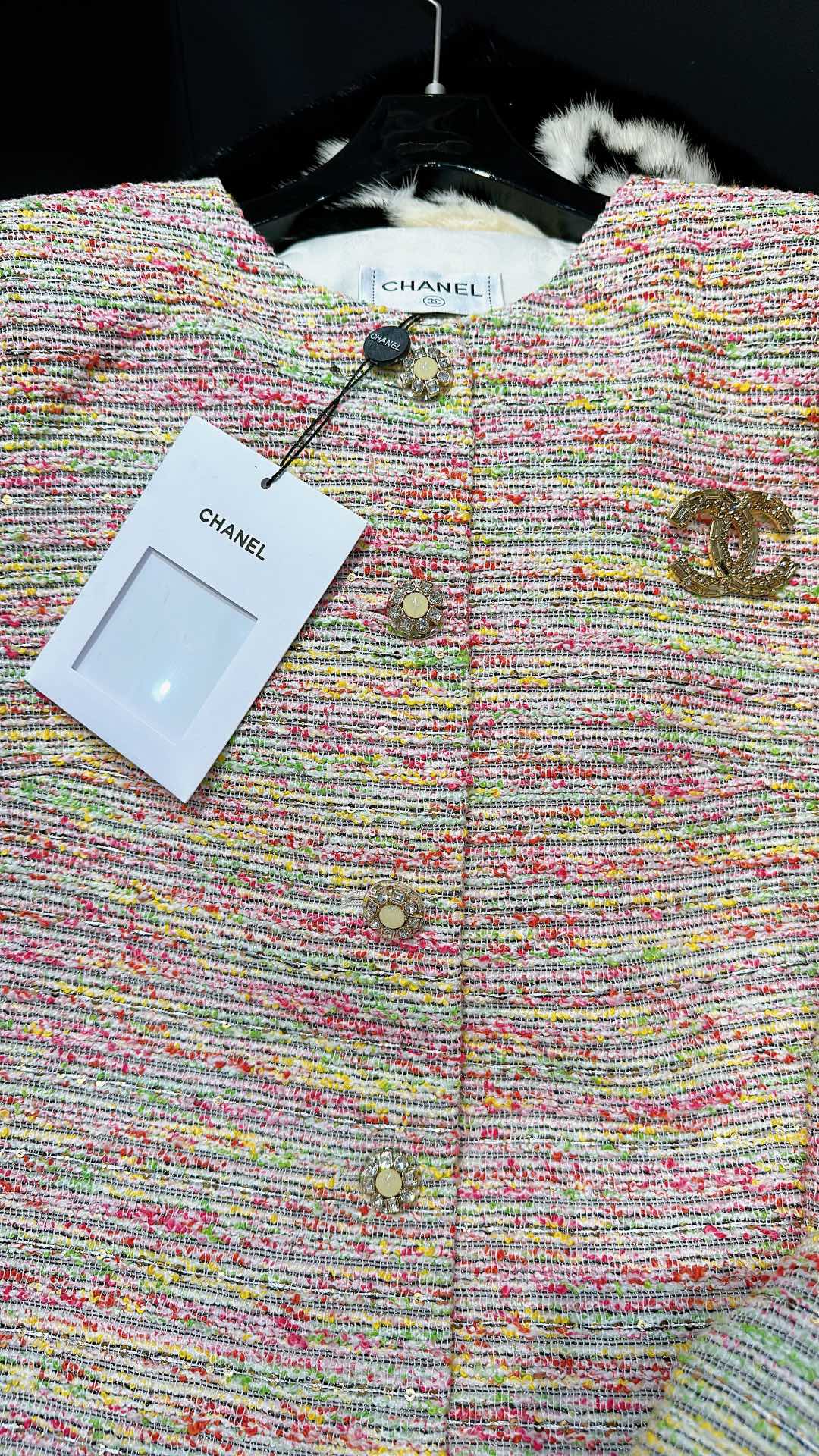 这款衣服是AAAAA 1:1 质量 (非常棒). 使用了和原版一模一样的材料. 商标部分也保持了和香奈儿/Chanel一样. 图片拍摄是实物衣服拍摄, 您所收到的实物保证和我们图片一模一样.