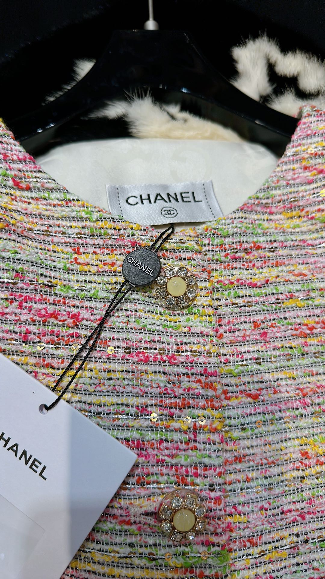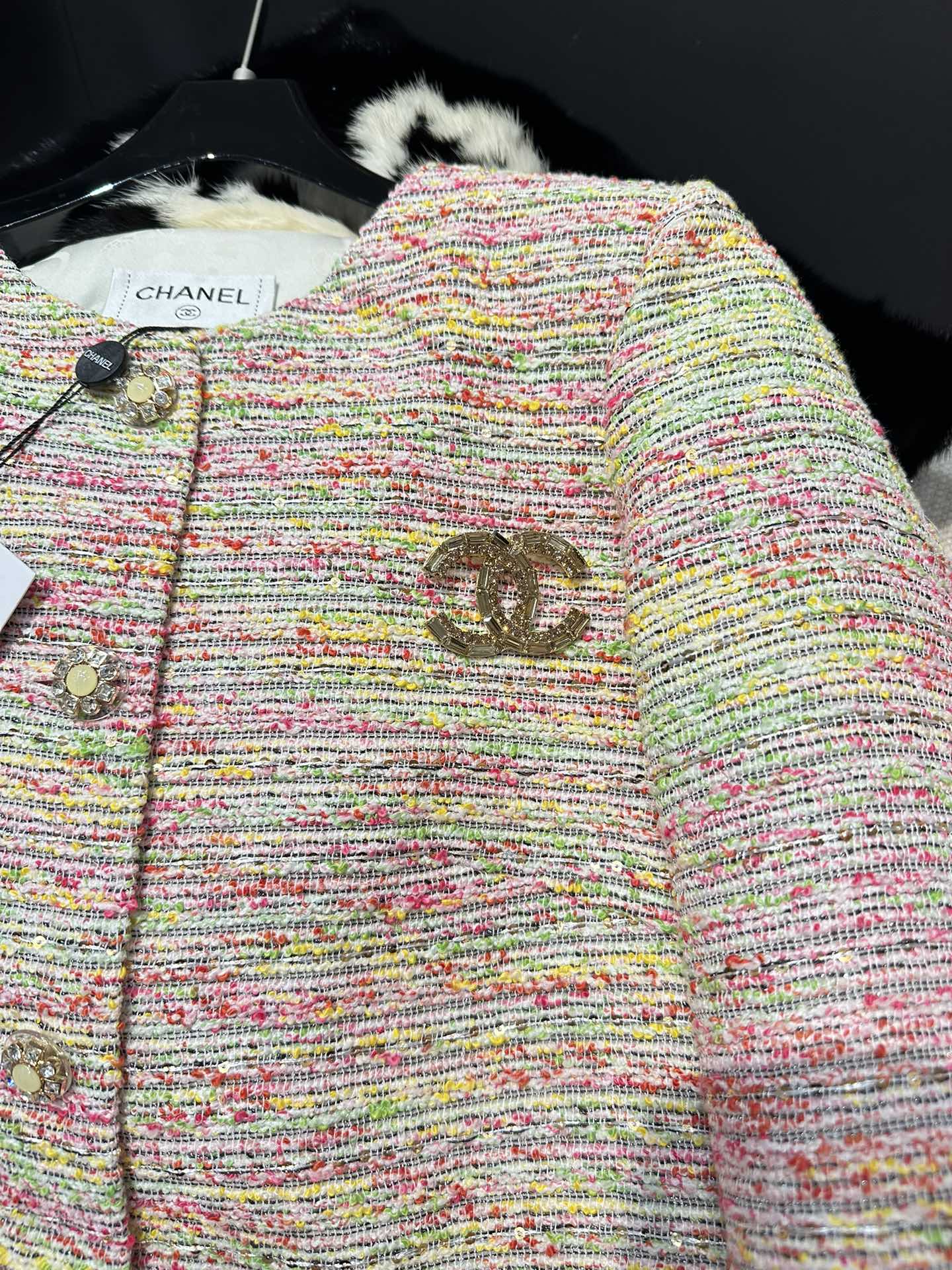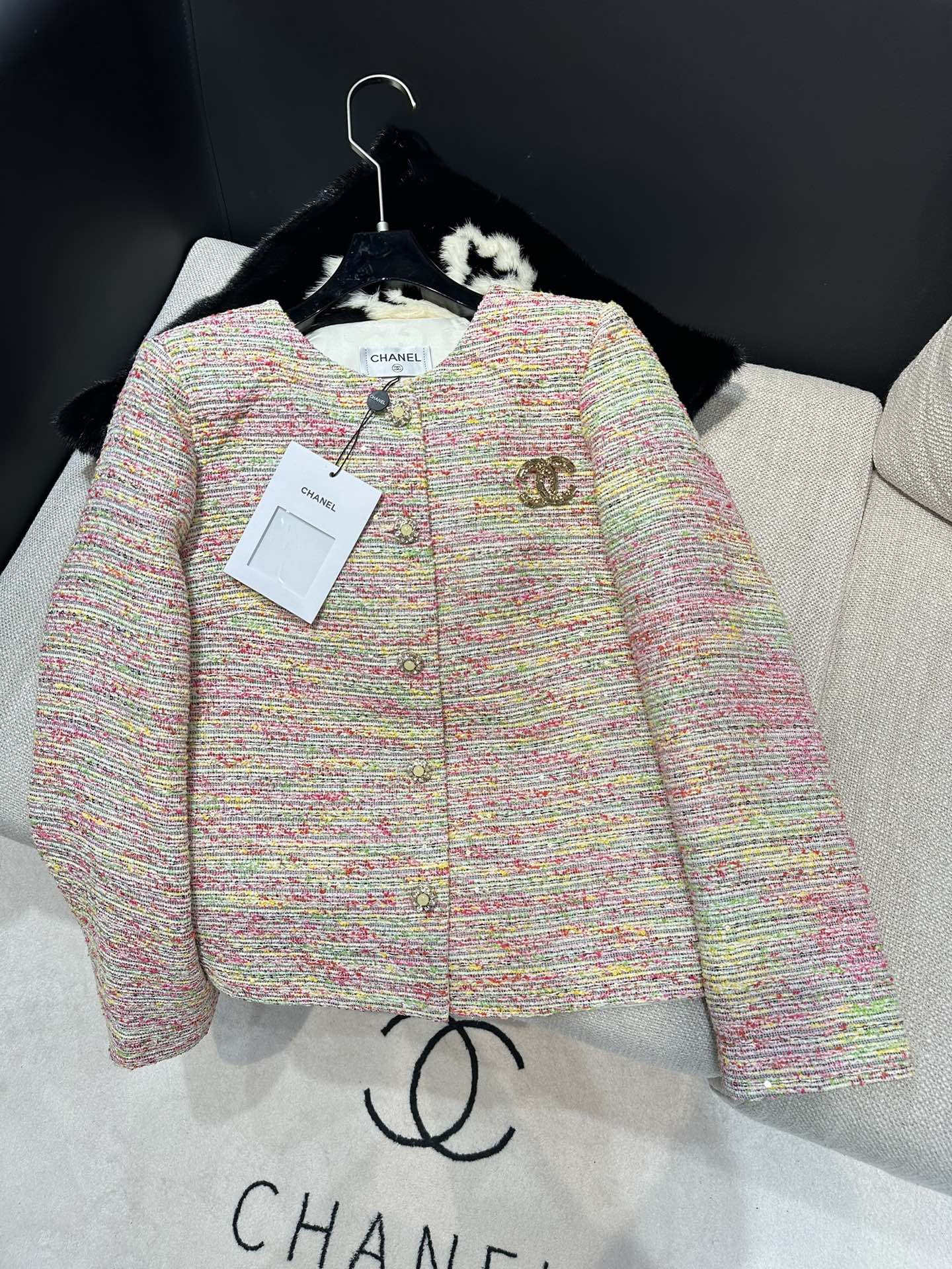 这款衣服是AAAAA 1:1 质量 (非常棒). 使用了和原版一模一样的材料. 商标部分也保持了和香奈儿/Chanel一样. 图片拍摄是实物衣服拍摄, 您所收到的实物保证和我们图片一模一样.