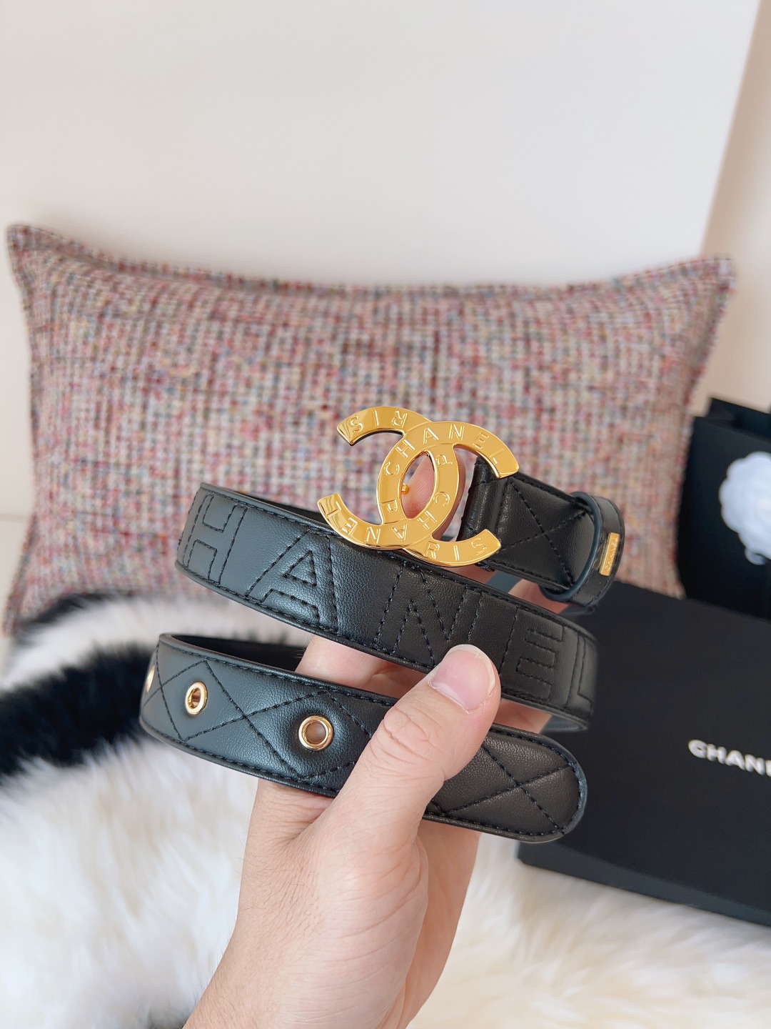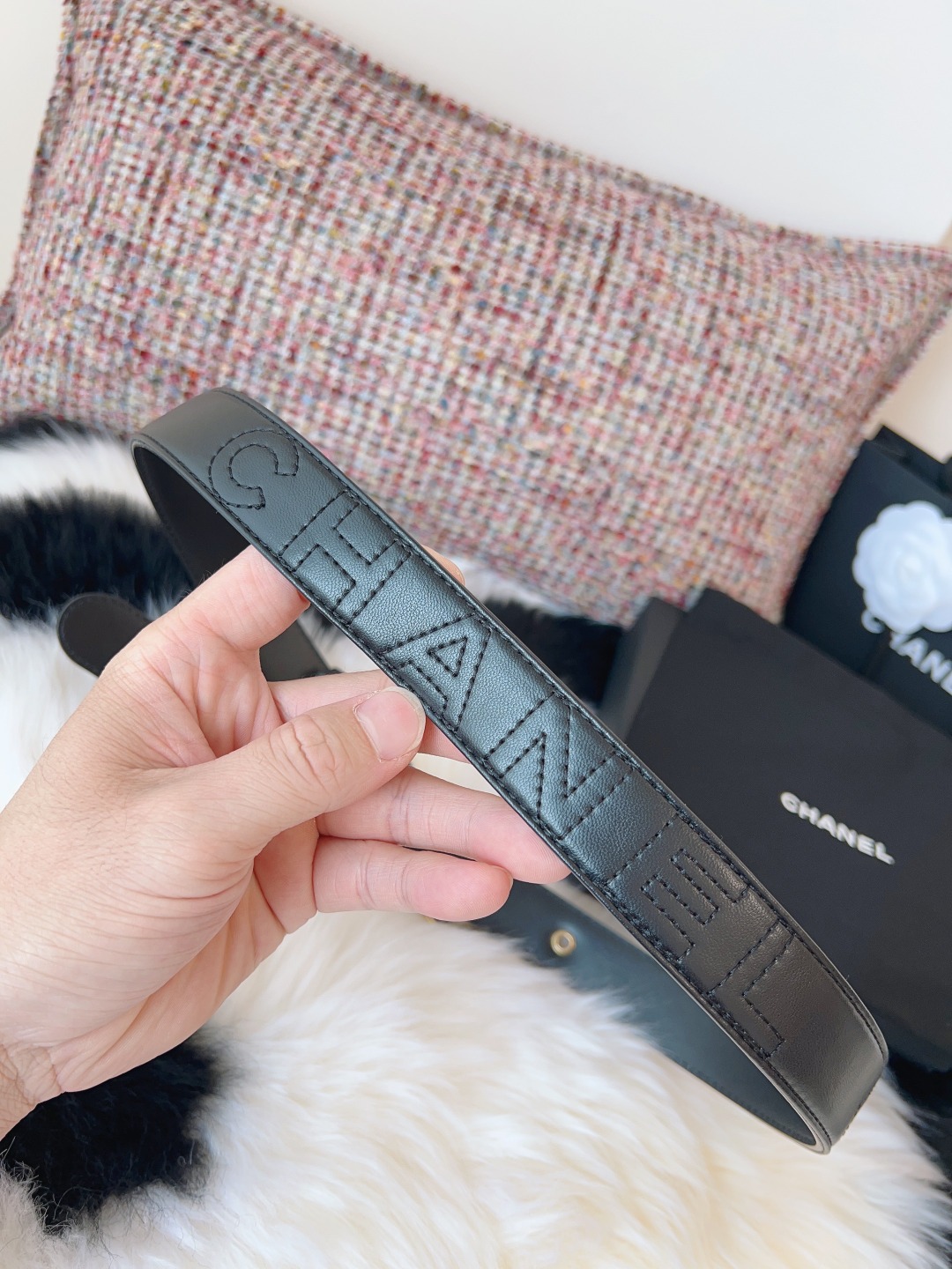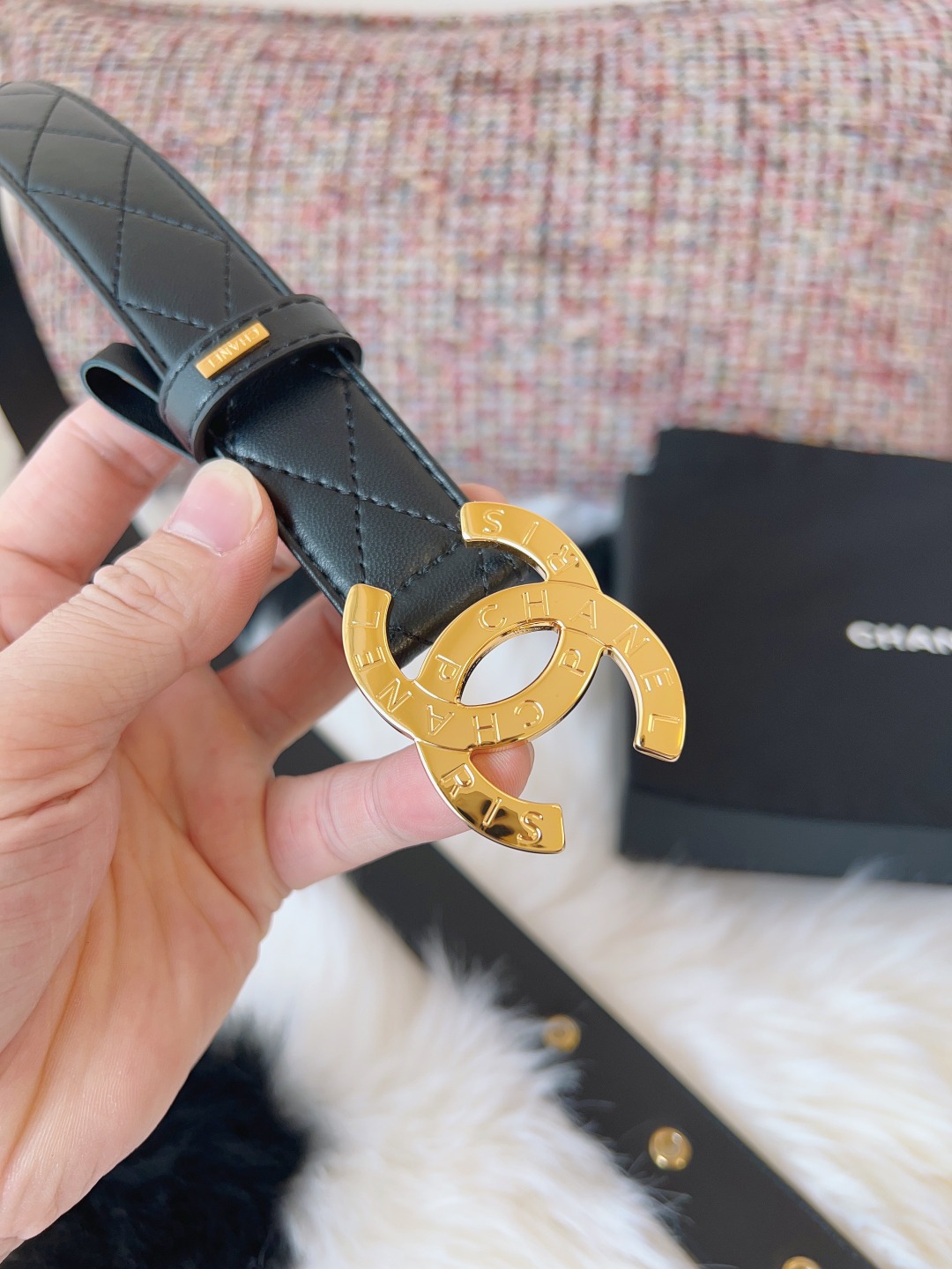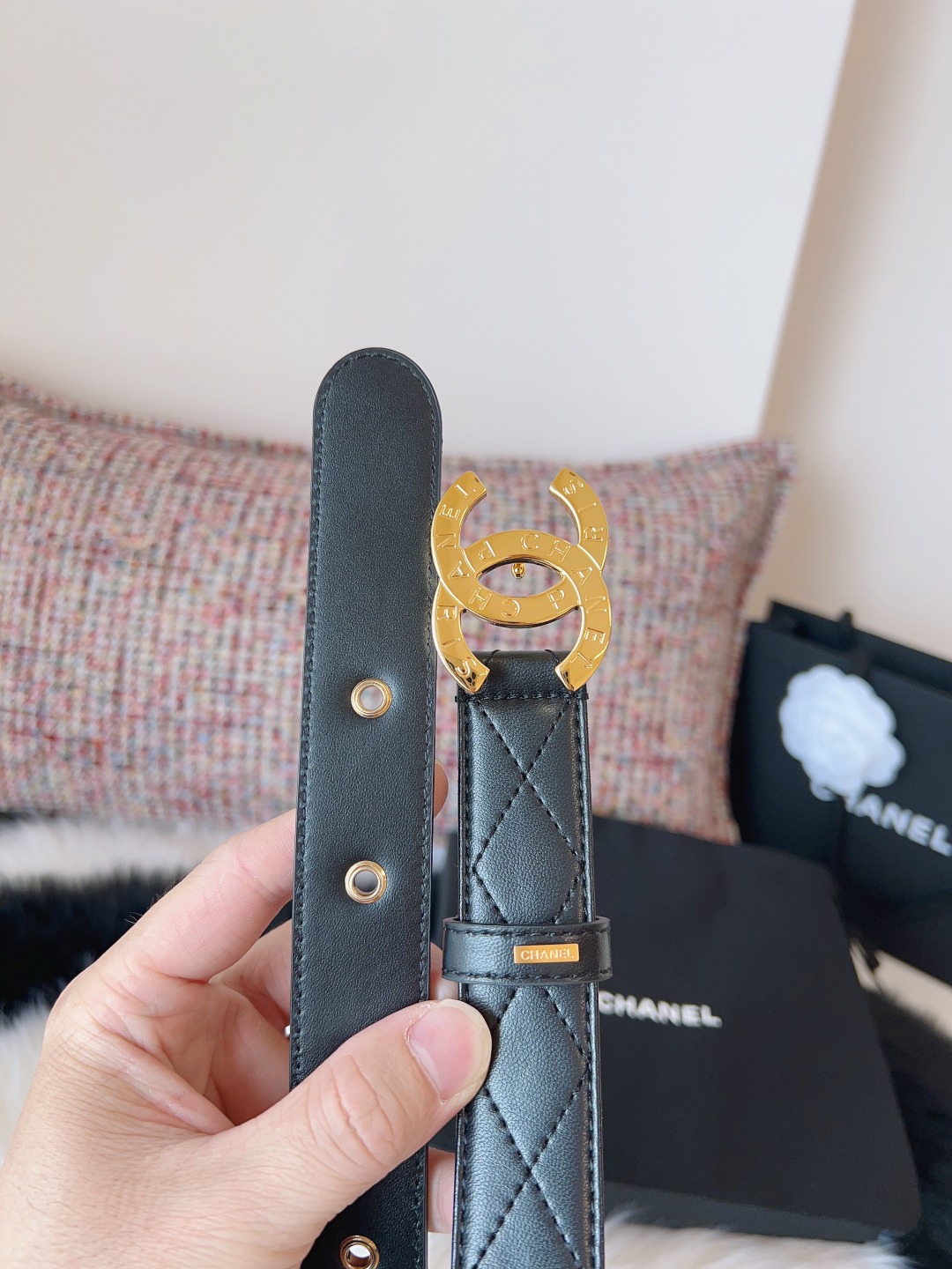 这款皮带是AAAAA 1:1 质量 (非常棒). 使用了和原版一模一样的材料. 商标部分也保持了和香奈儿/Chanel一样. 图片拍摄是实物皮带拍摄, 您所收到的实物保证和我们图片一模一样.
