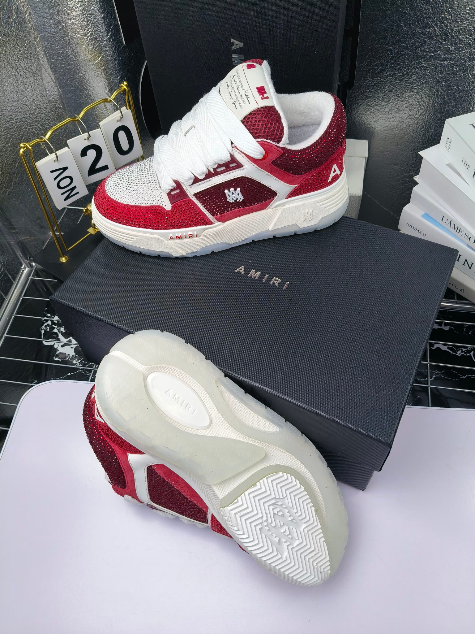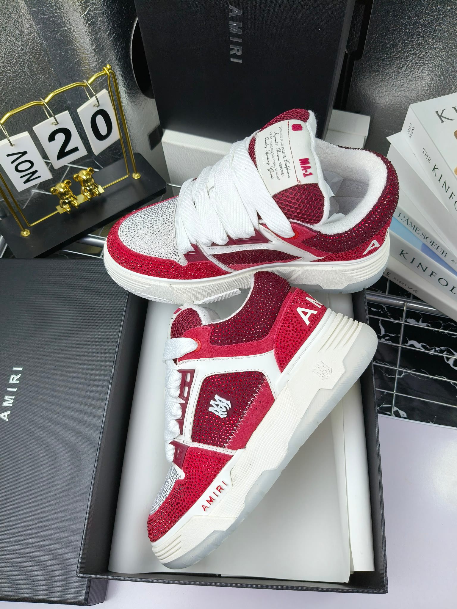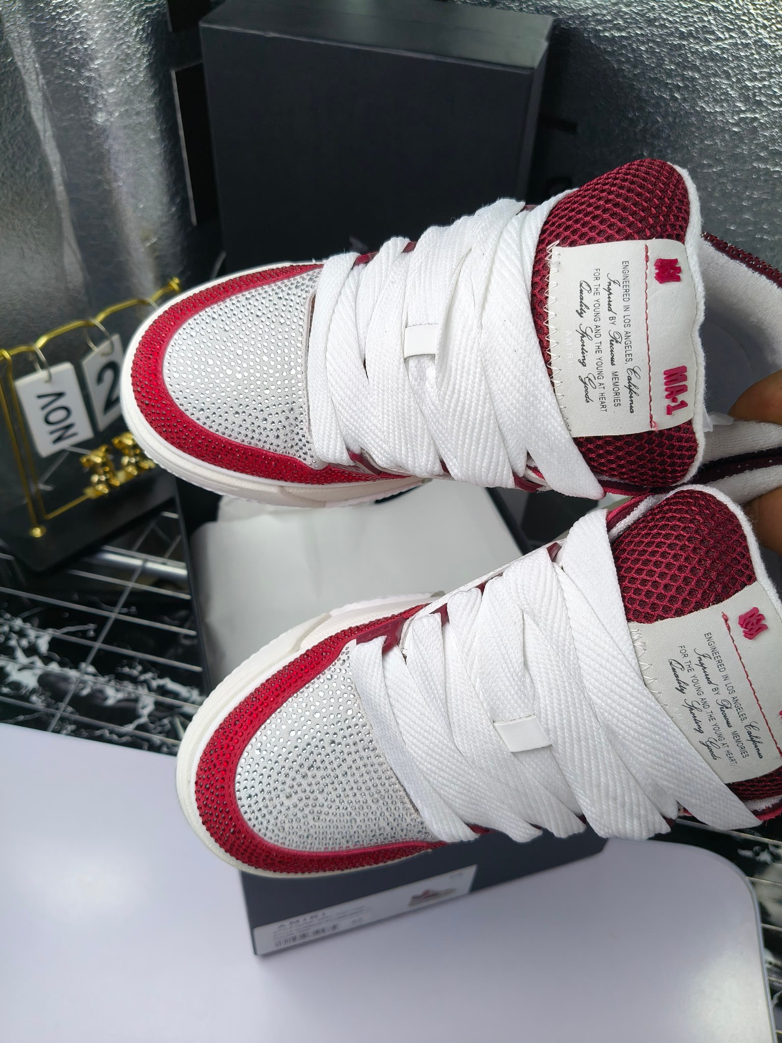 这款鞋子是AAAAA 1:1 质量 (非常棒). 使用了和原版一模一样的材料. 商标部分也保持了和AMIRI一样. 图片拍摄是实物鞋子拍摄, 您所收到的实物保证和我们图片一模一样.