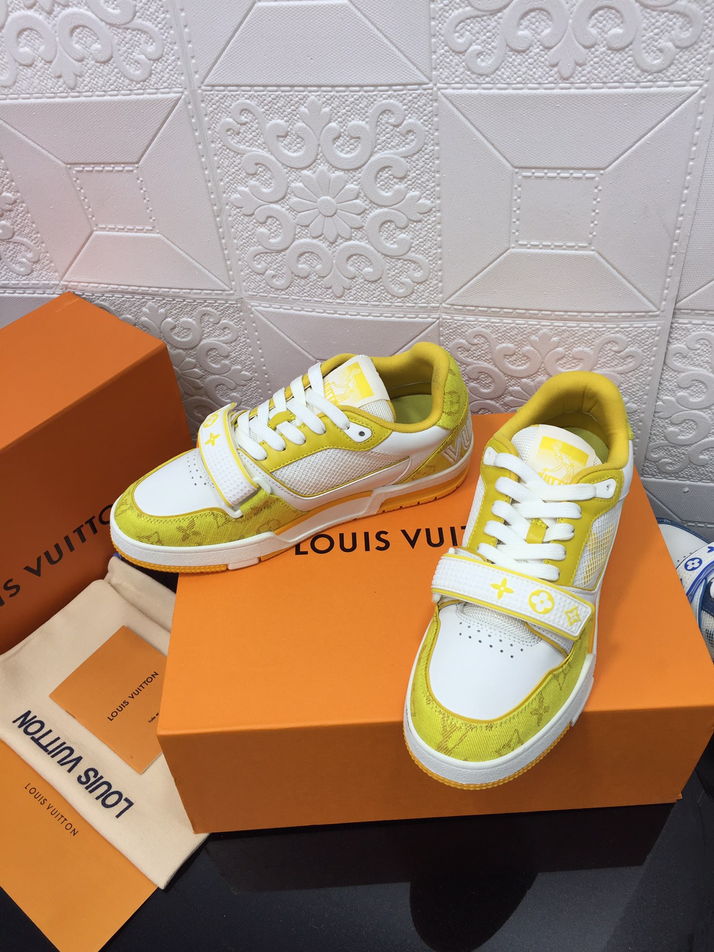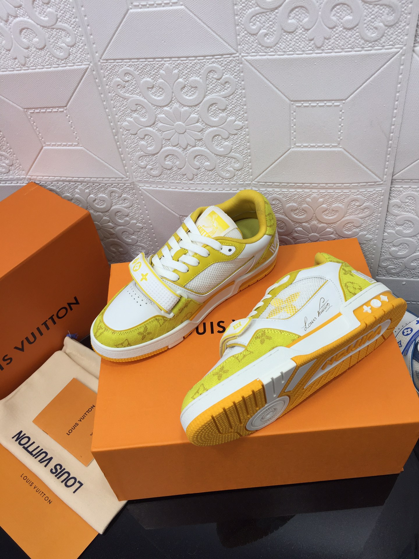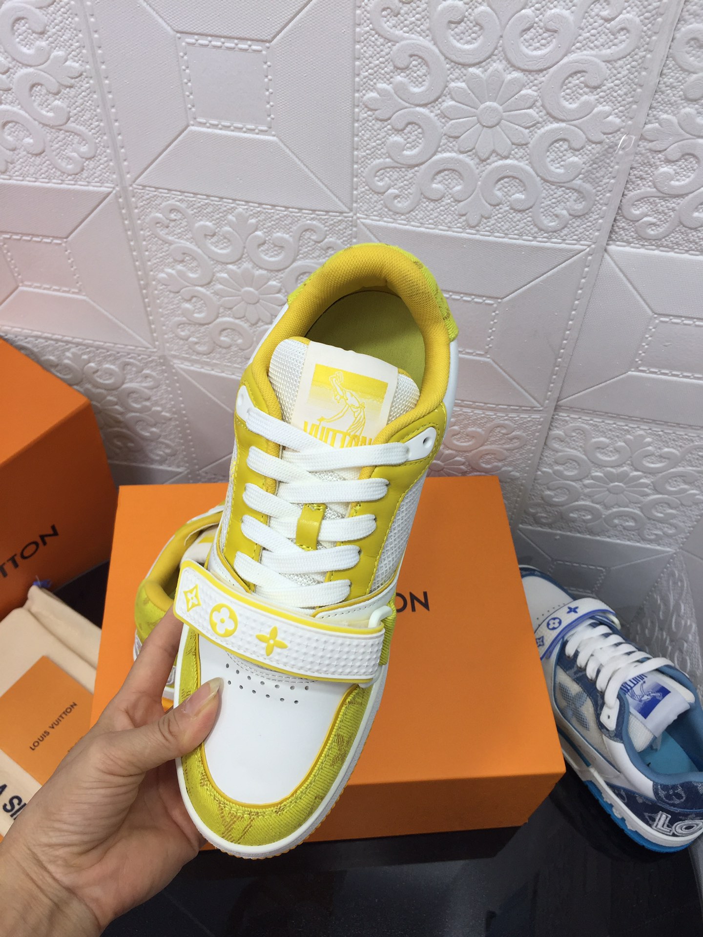 这款鞋子是AAAAA 1:1 质量 (非常棒). 使用了和原版一模一样的材料. 商标部分也保持了和路易威登/Louis Vuitton一样. 图片拍摄是实物鞋子拍摄, 您所收到的实物保证和我们图片一模一样.