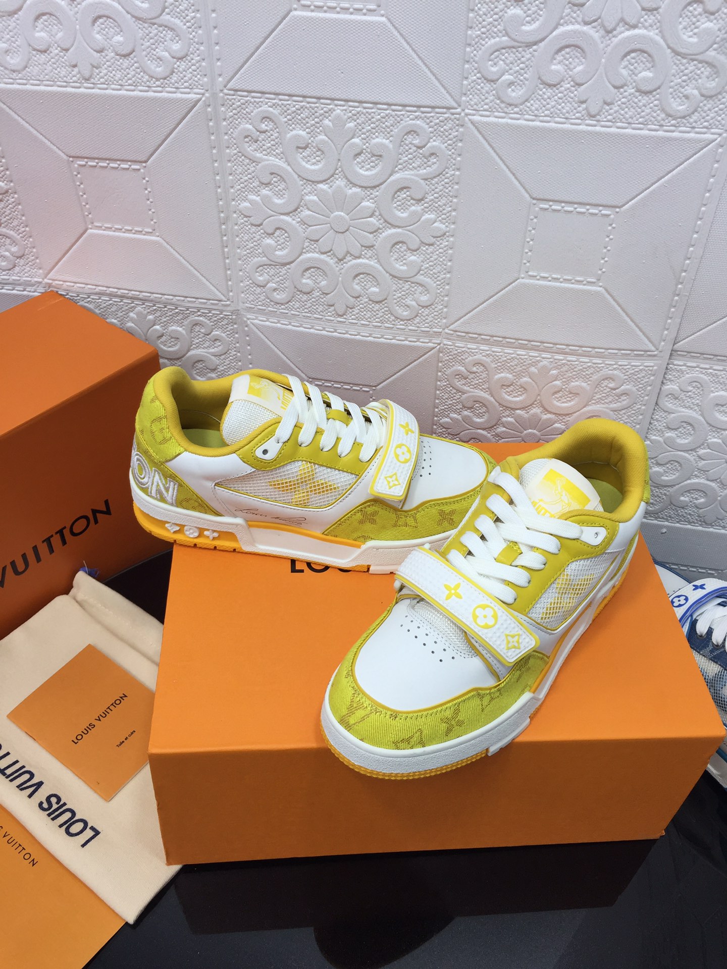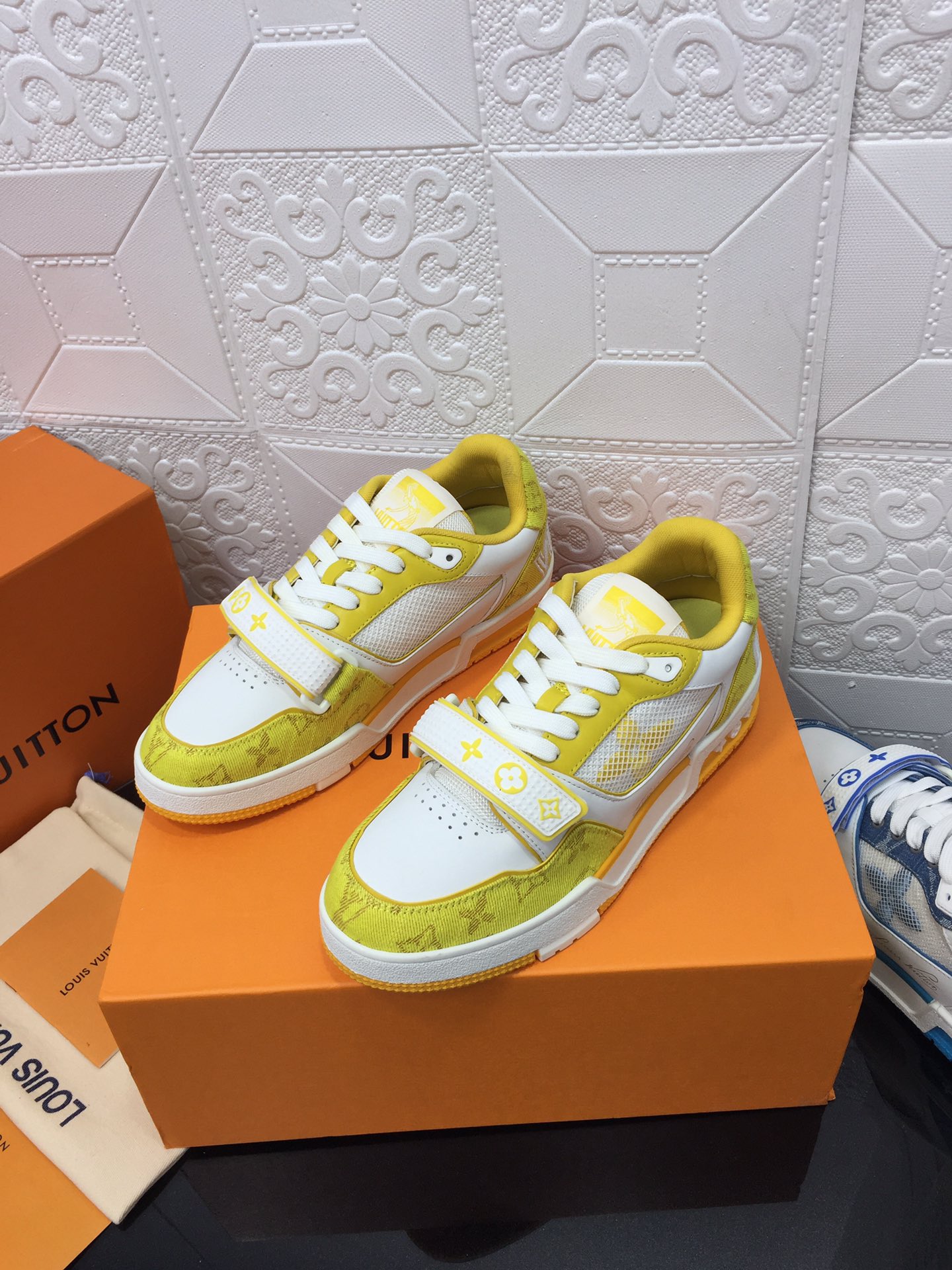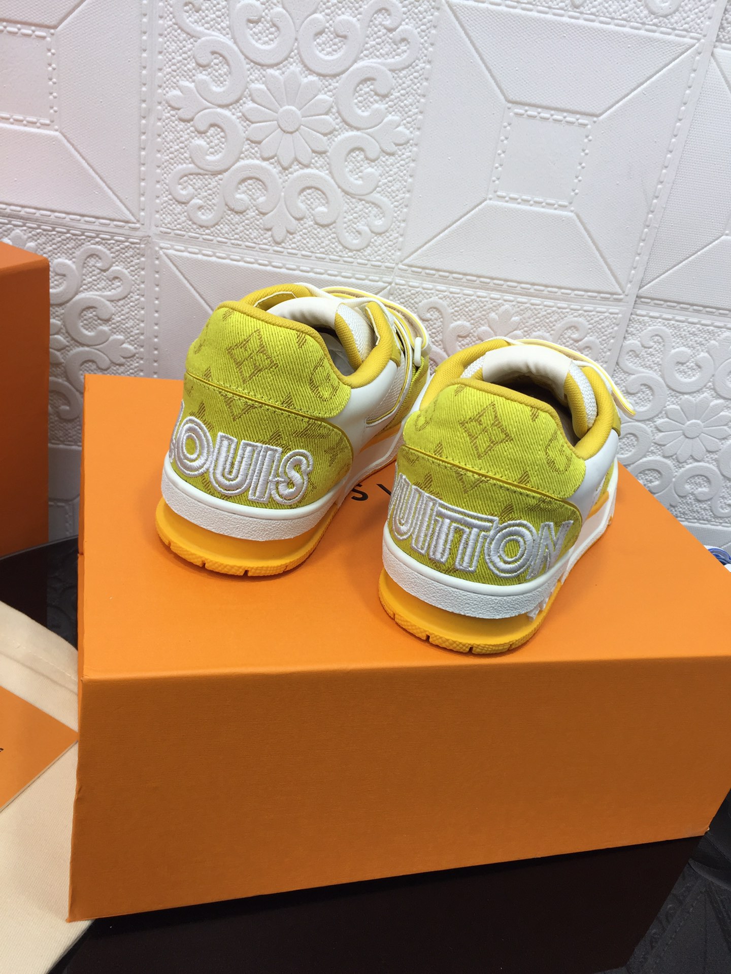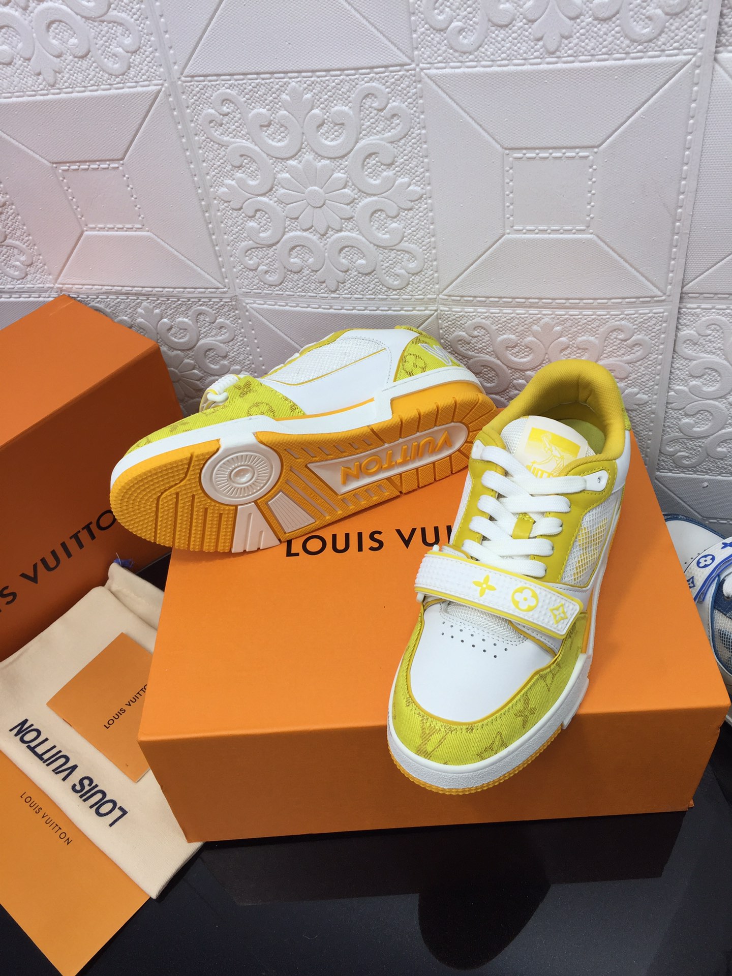 这款鞋子是AAAAA 1:1 质量 (非常棒). 使用了和原版一模一样的材料. 商标部分也保持了和路易威登/Louis Vuitton一样. 图片拍摄是实物鞋子拍摄, 您所收到的实物保证和我们图片一模一样.