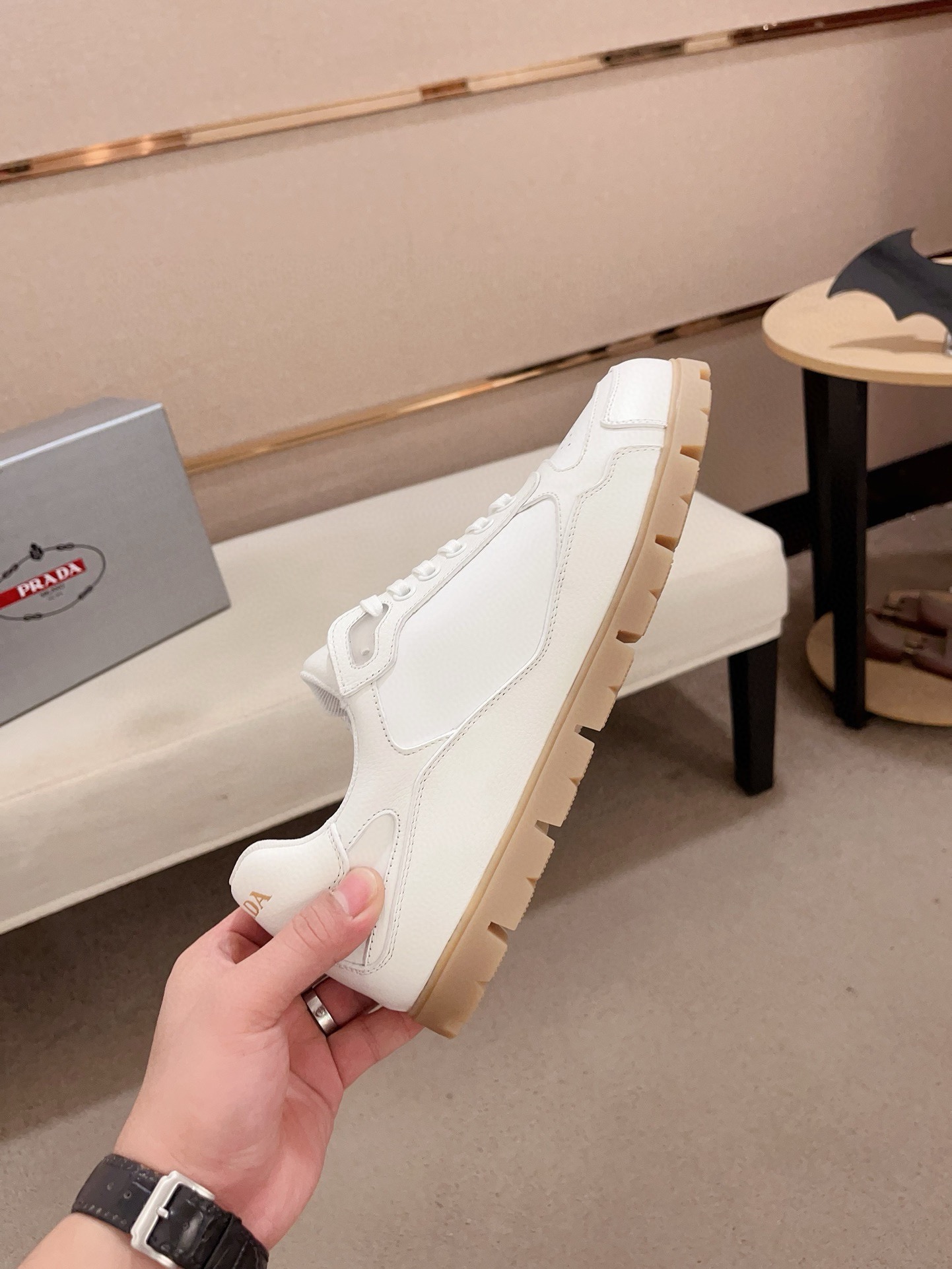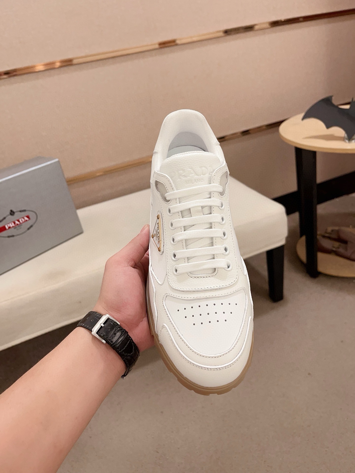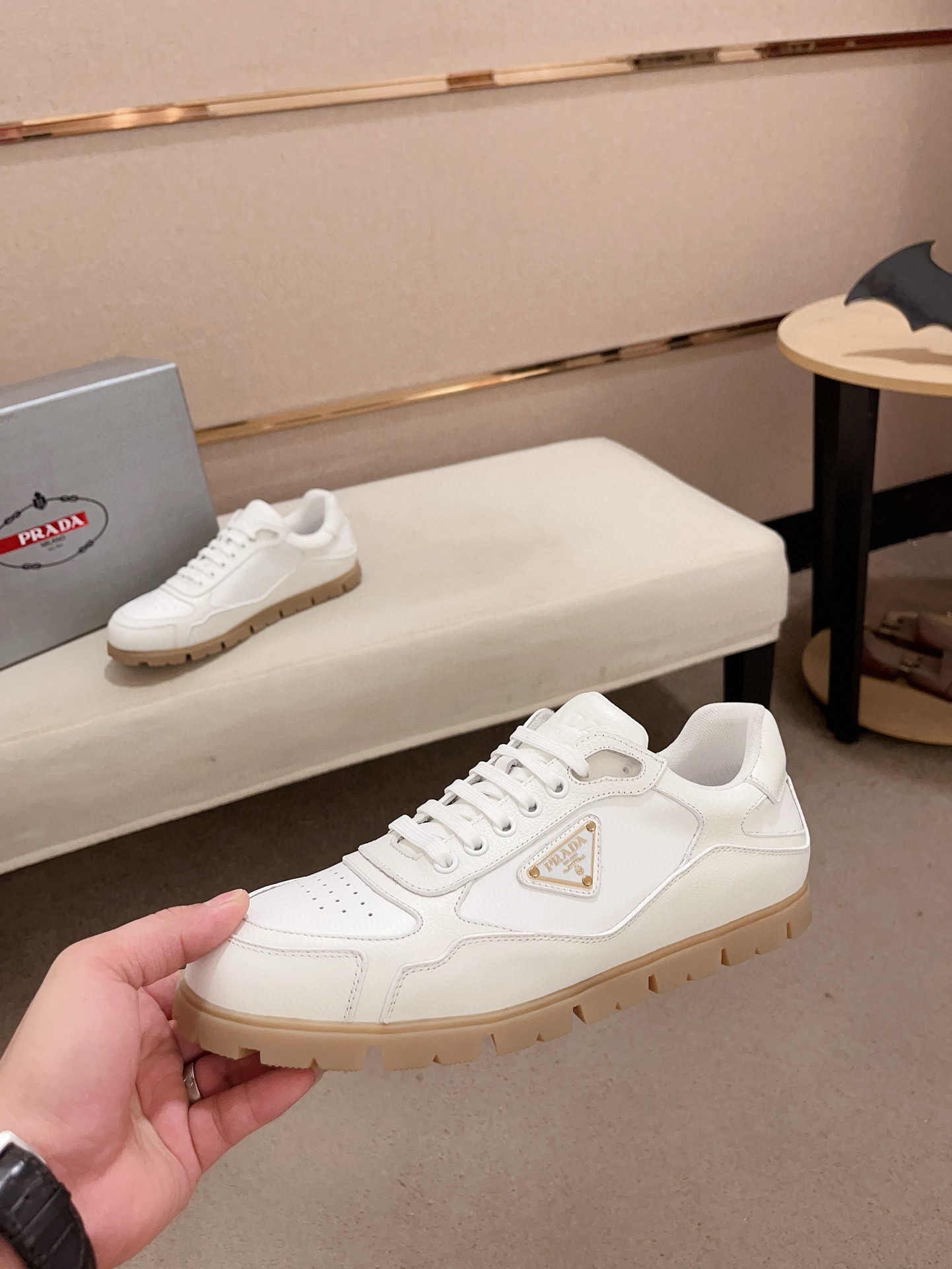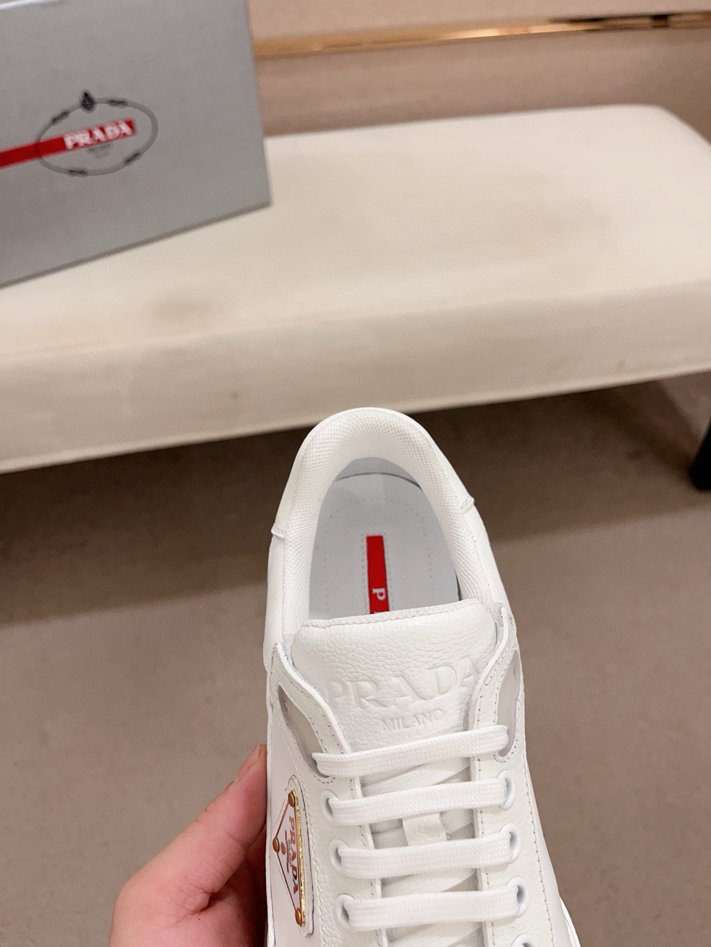 这款鞋子是AAAAA 1:1 质量 (非常棒). 使用了和原版一模一样的材料. 商标部分也保持了和普拉达/Prada一样. 图片拍摄是实物鞋子拍摄, 您所收到的实物保证和我们图片一模一样.