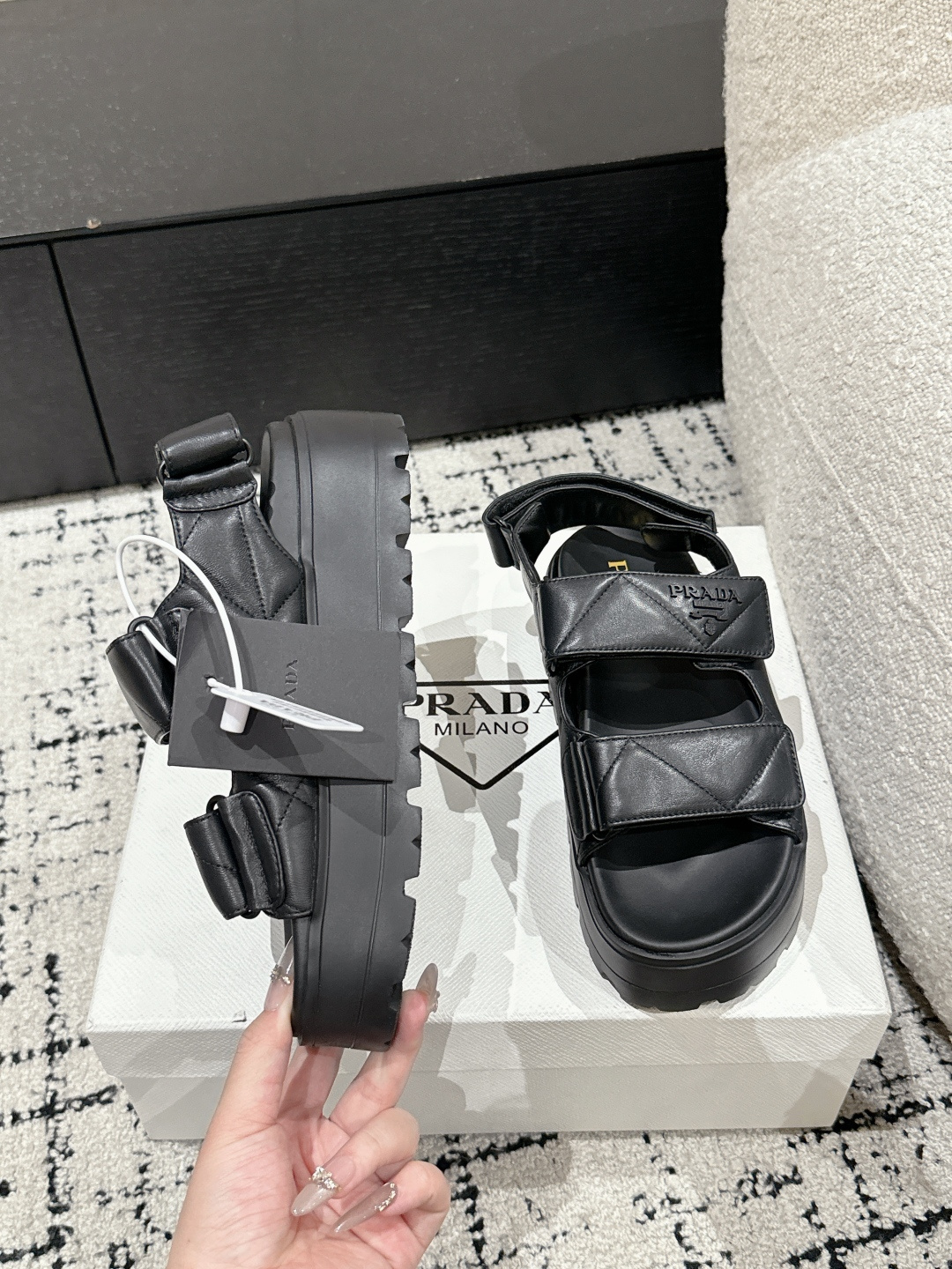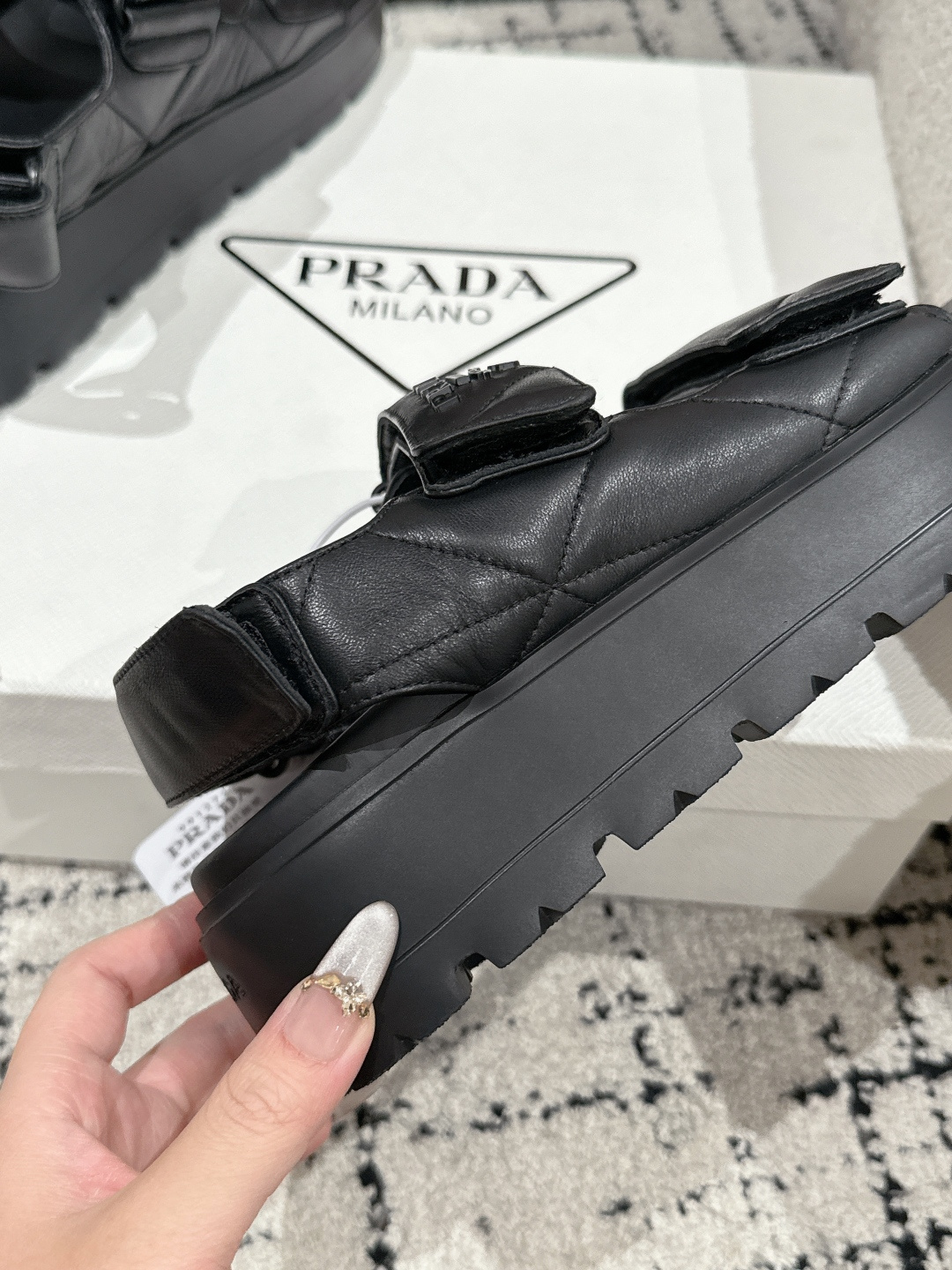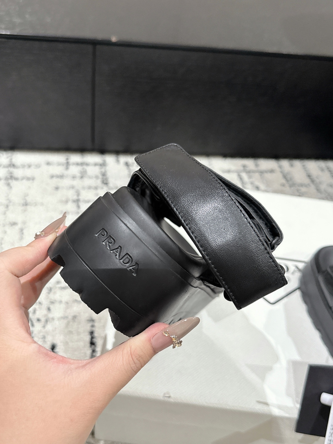 这款鞋子是AAAAA 1:1 质量 (非常棒). 使用了和原版一模一样的材料. 商标部分也保持了和普拉达/Prada一样. 图片拍摄是实物鞋子拍摄, 您所收到的实物保证和我们图片一模一样.