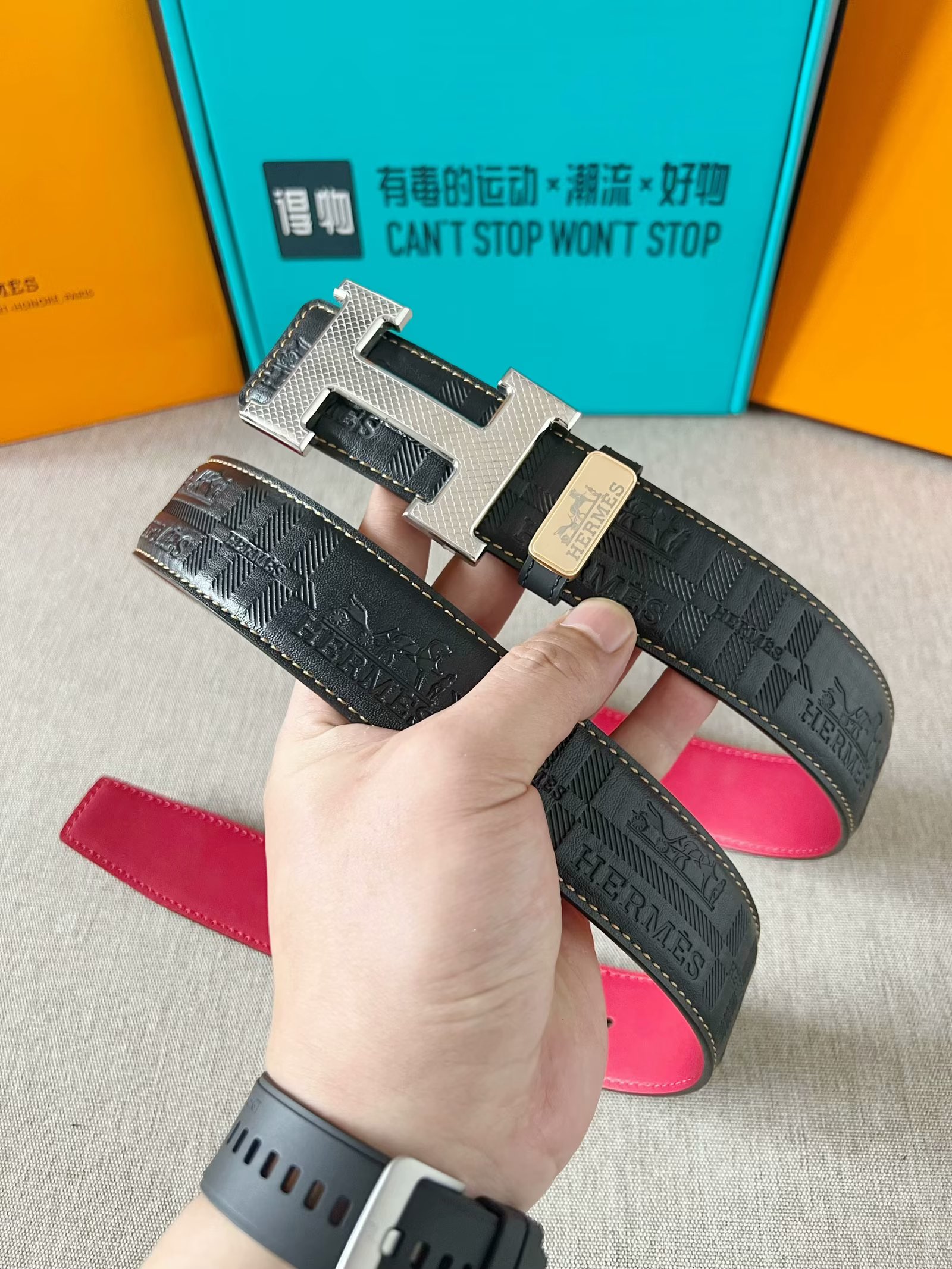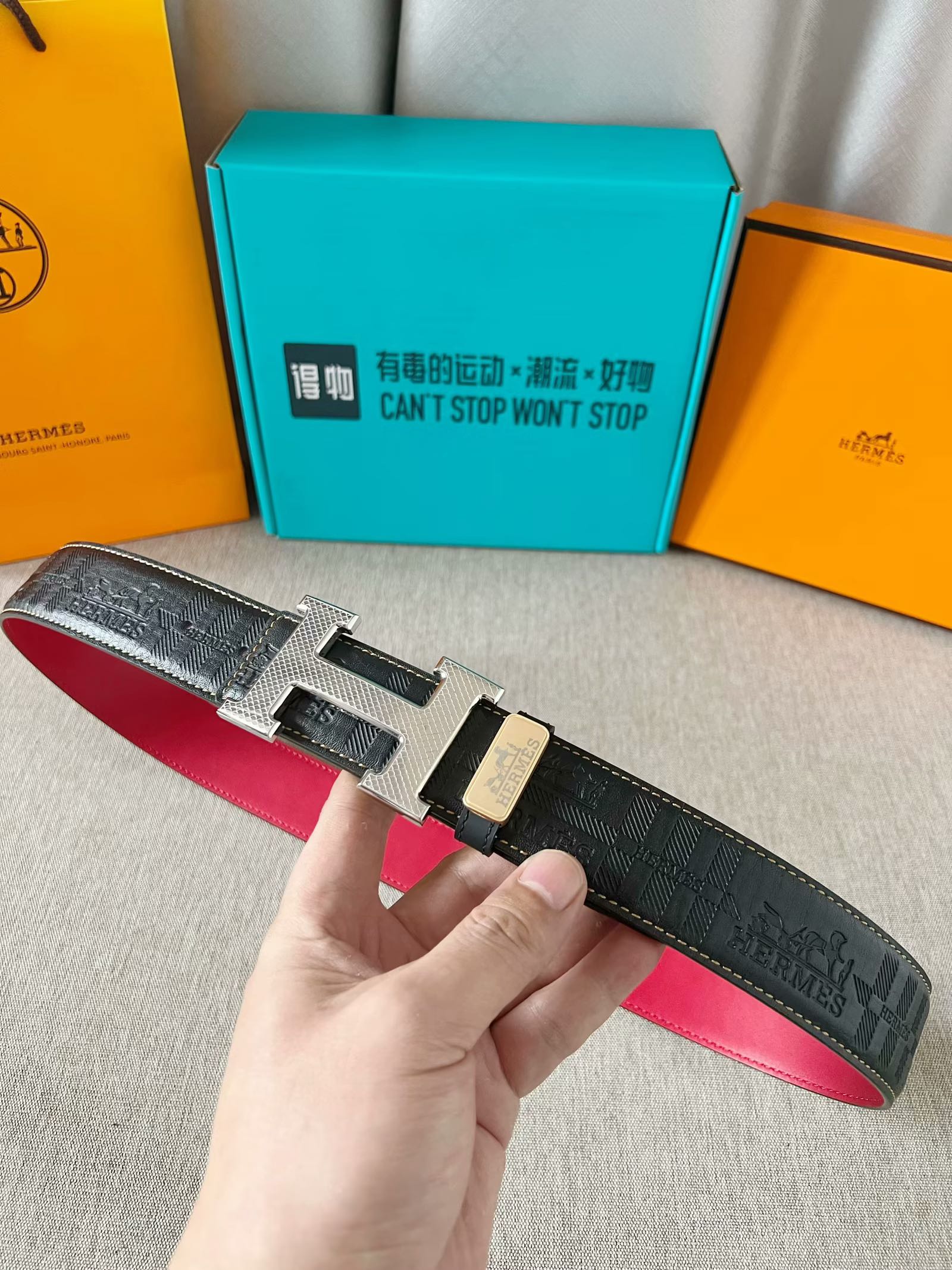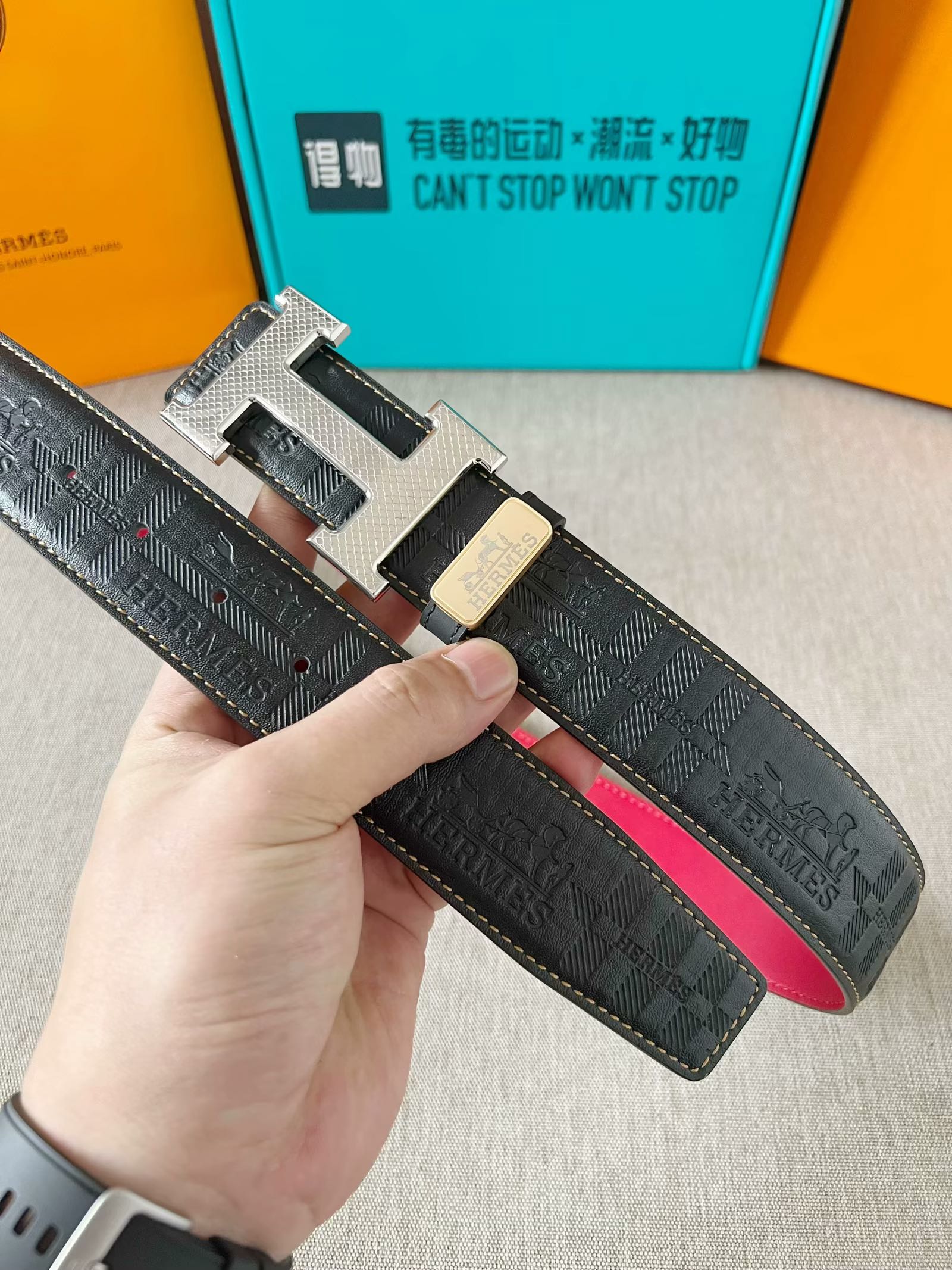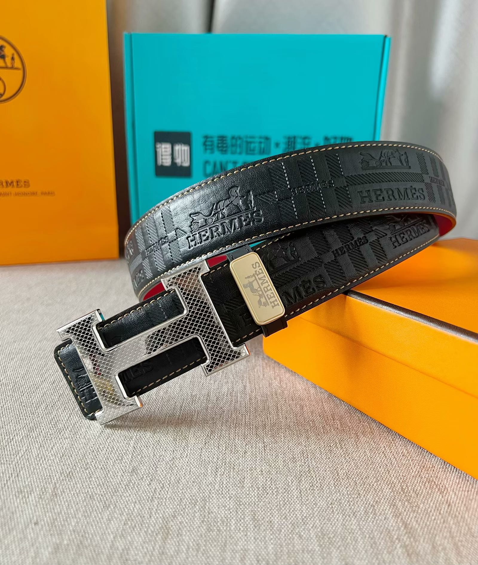 这款皮带是AAAAA 1:1 质量 (非常棒). 使用了和原版一模一样的材料. 商标部分也保持了和爱马仕/Hermes一样. 图片拍摄是实物皮带拍摄, 您所收到的实物保证和我们图片一模一样.