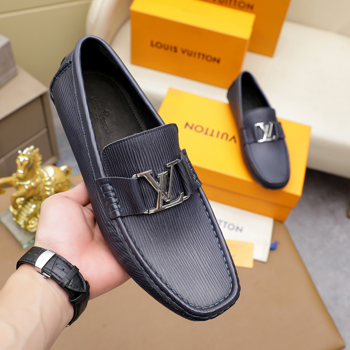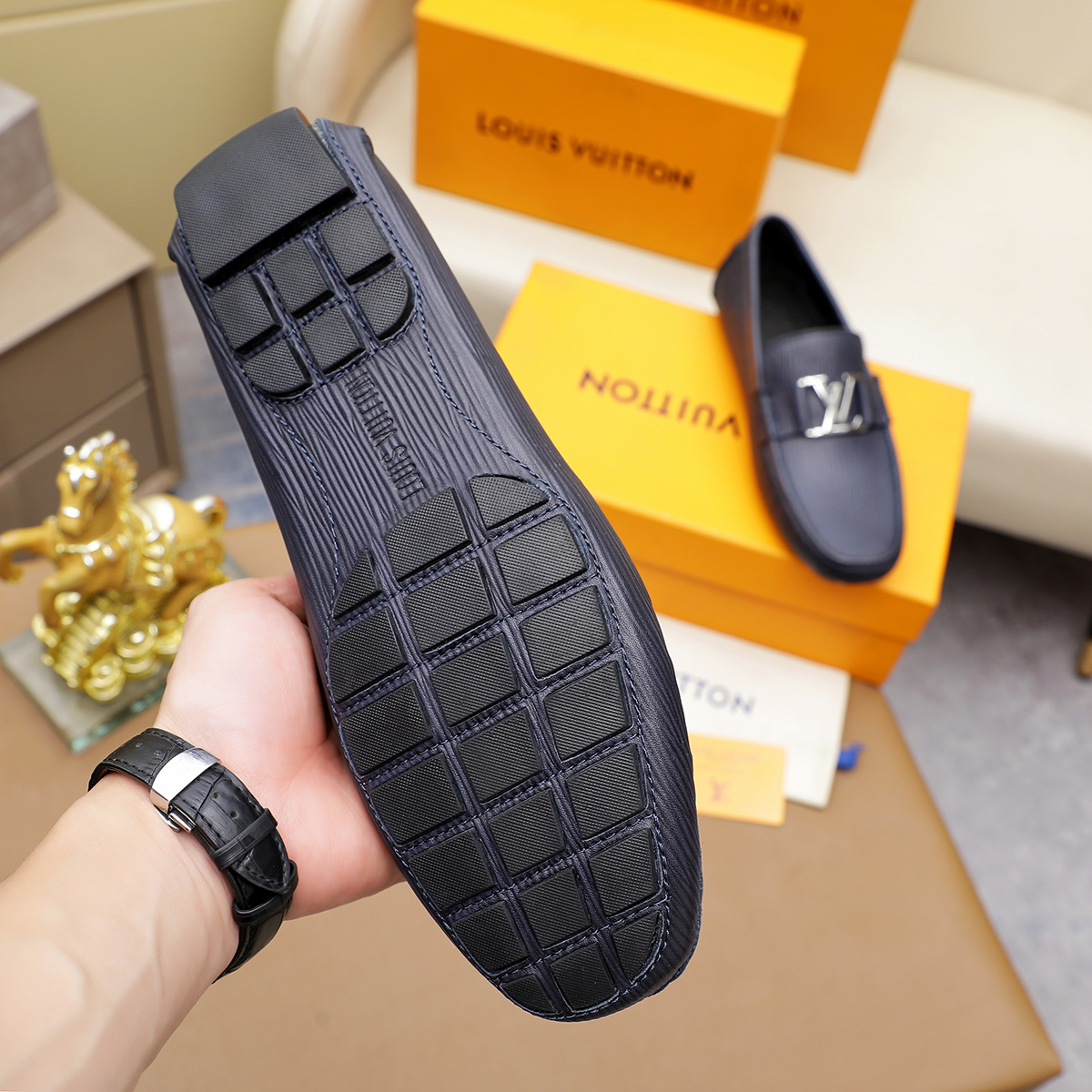 这款鞋子是AAAAA 1:1 质量 (非常棒). 使用了和原版一模一样的材料. 商标部分也保持了和路易威登/Louis Vuitton一样. 图片拍摄是实物鞋子拍摄, 您所收到的实物保证和我们图片一模一样.