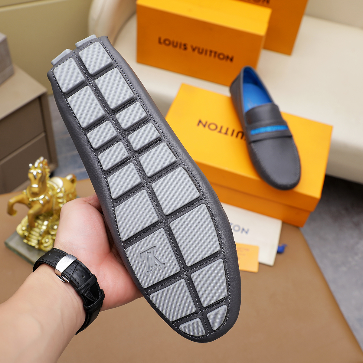这款鞋子是AAAAA 1:1 质量 (非常棒). 使用了和原版一模一样的材料. 商标部分也保持了和路易威登/Louis Vuitton一样. 图片拍摄是实物鞋子拍摄, 您所收到的实物保证和我们图片一模一样.