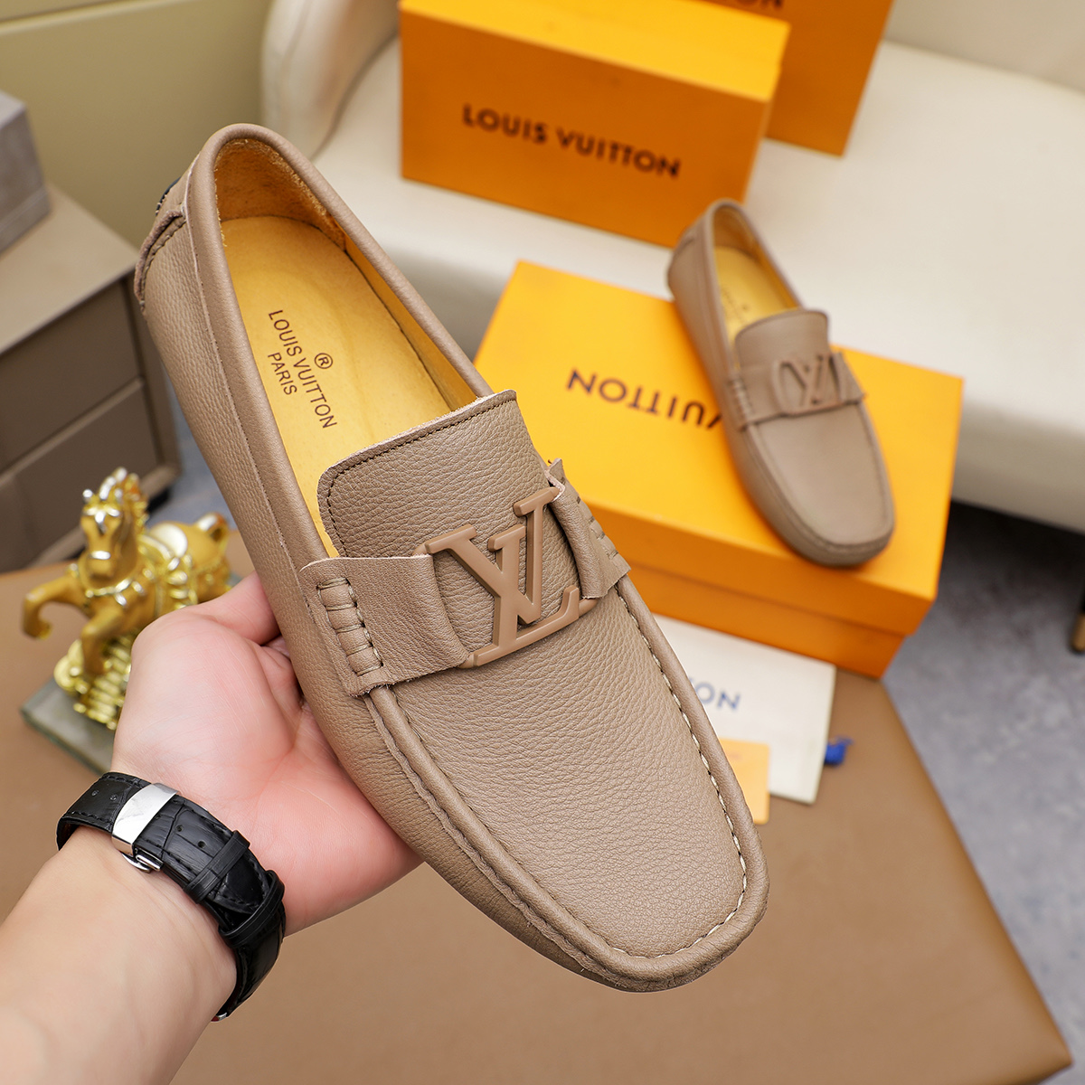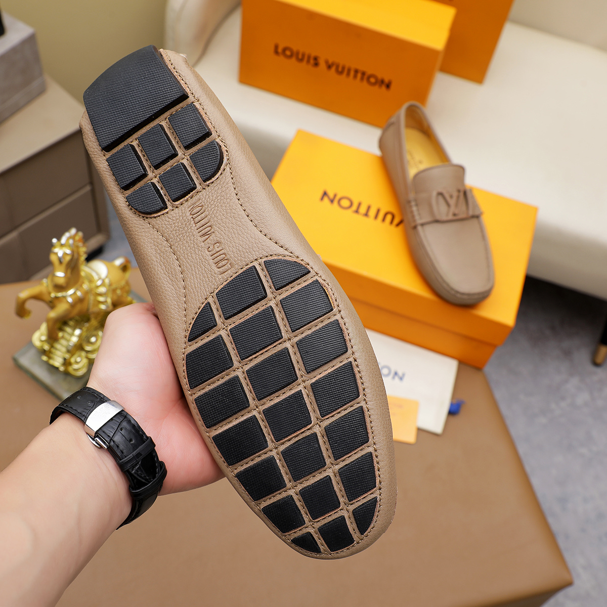 这款鞋子是AAAAA 1:1 质量 (非常棒). 使用了和原版一模一样的材料. 商标部分也保持了和路易威登/Louis Vuitton一样. 图片拍摄是实物鞋子拍摄, 您所收到的实物保证和我们图片一模一样.