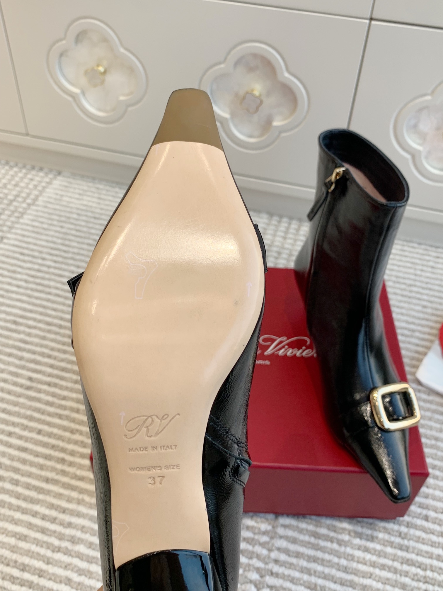 这款鞋子是AAAAA 1:1 质量 (非常棒). 使用了和原版一模一样的材料. 商标部分也保持了和罗杰维维耶/Roger Vivier一样. 图片拍摄是实物鞋子拍摄, 您所收到的实物保证和我们图片一模一样.