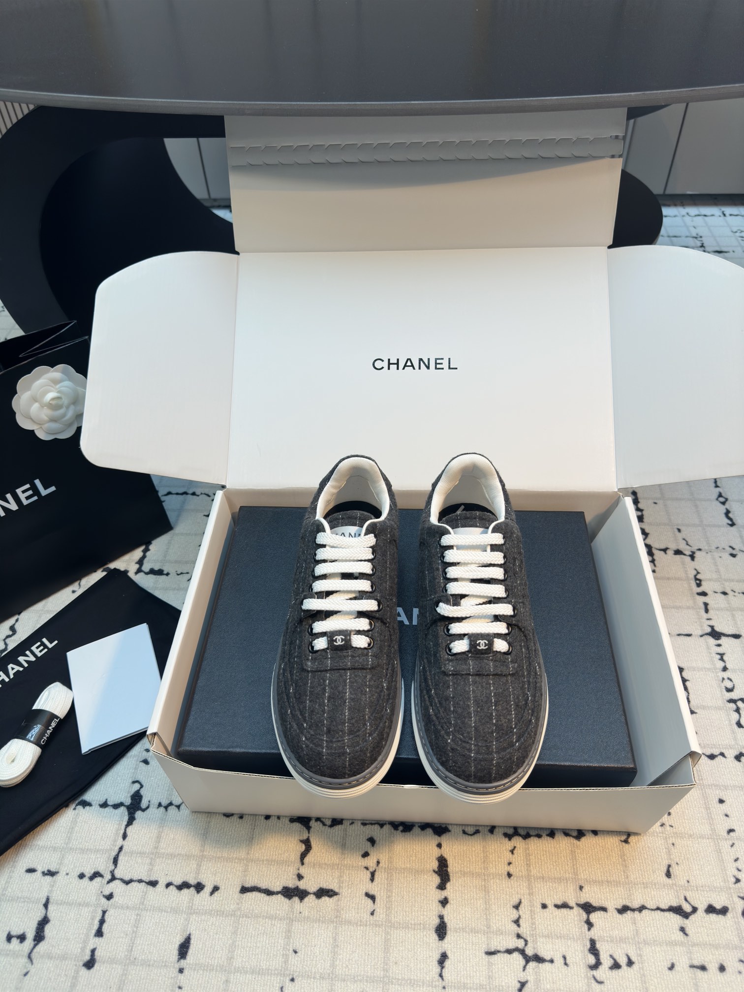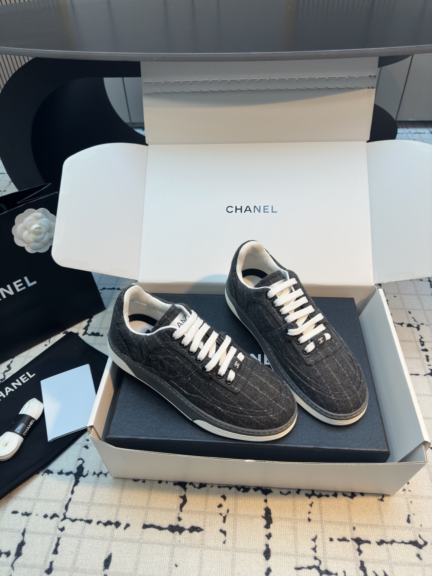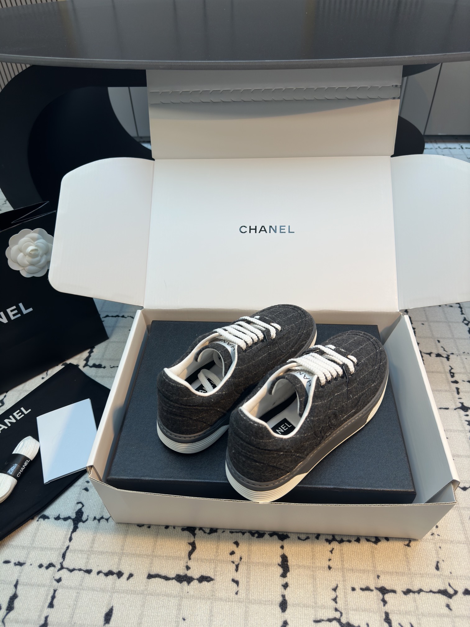 这款鞋子是AAAAA 1:1 质量 (非常棒). 使用了和原版一模一样的材料. 商标部分也保持了和香奈儿/Chanel一样. 图片拍摄是实物鞋子拍摄, 您所收到的实物保证和我们图片一模一样.
