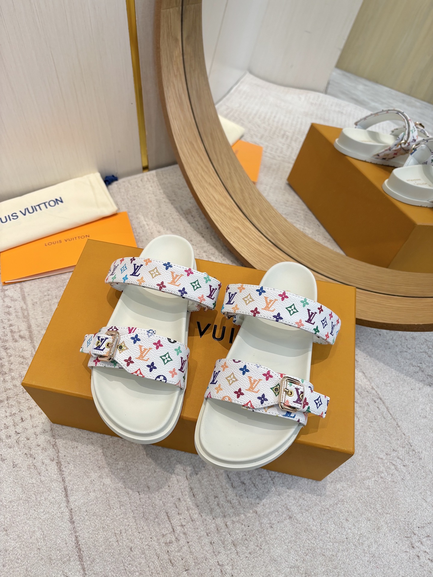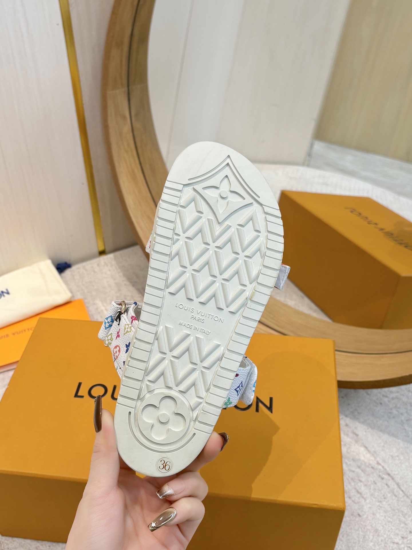 这款鞋子是AAAAA 1:1 质量 (非常棒). 使用了和原版一模一样的材料. 商标部分也保持了和路易威登/Louis Vuitton一样. 图片拍摄是实物鞋子拍摄, 您所收到的实物保证和我们图片一模一样.