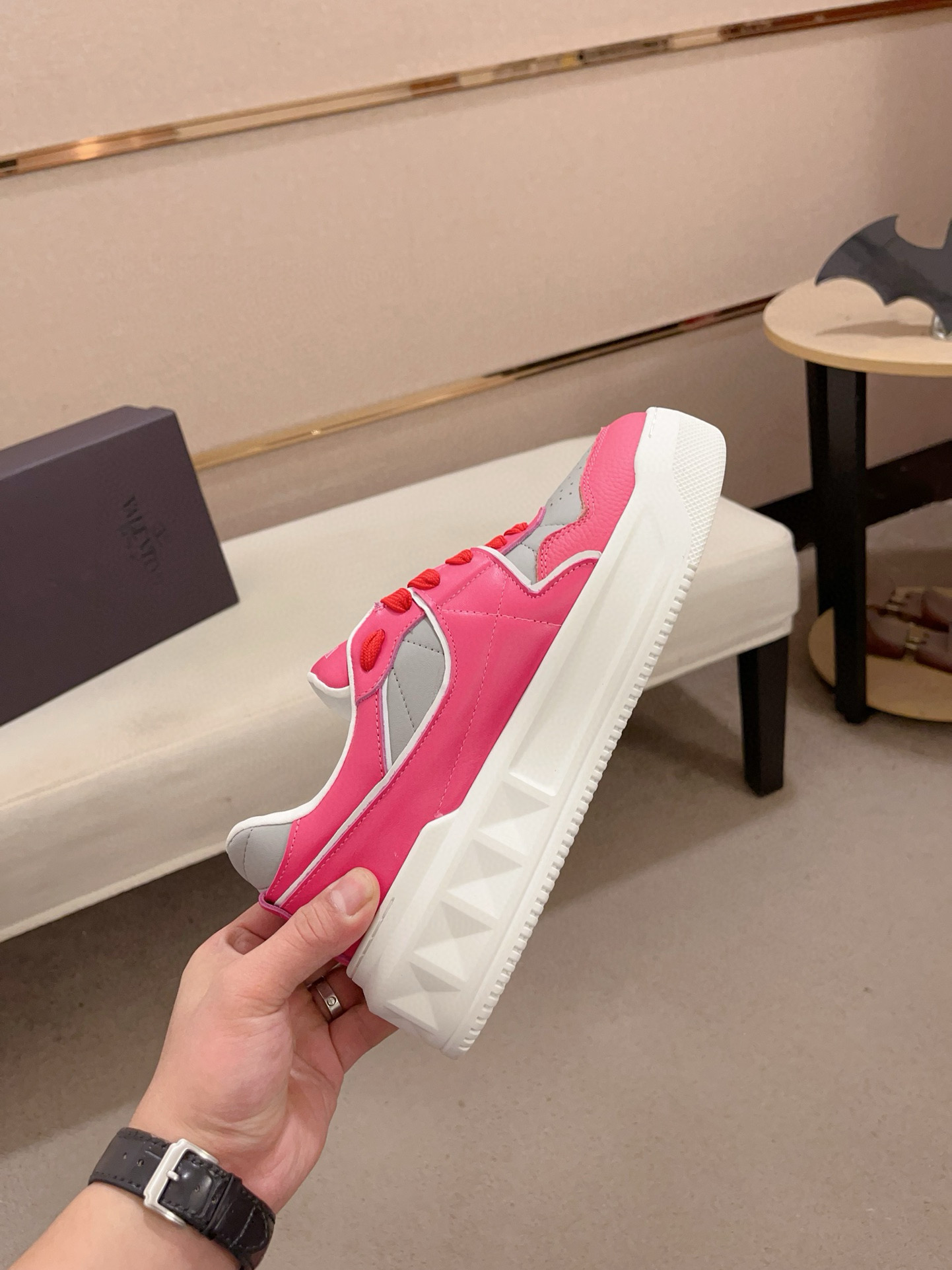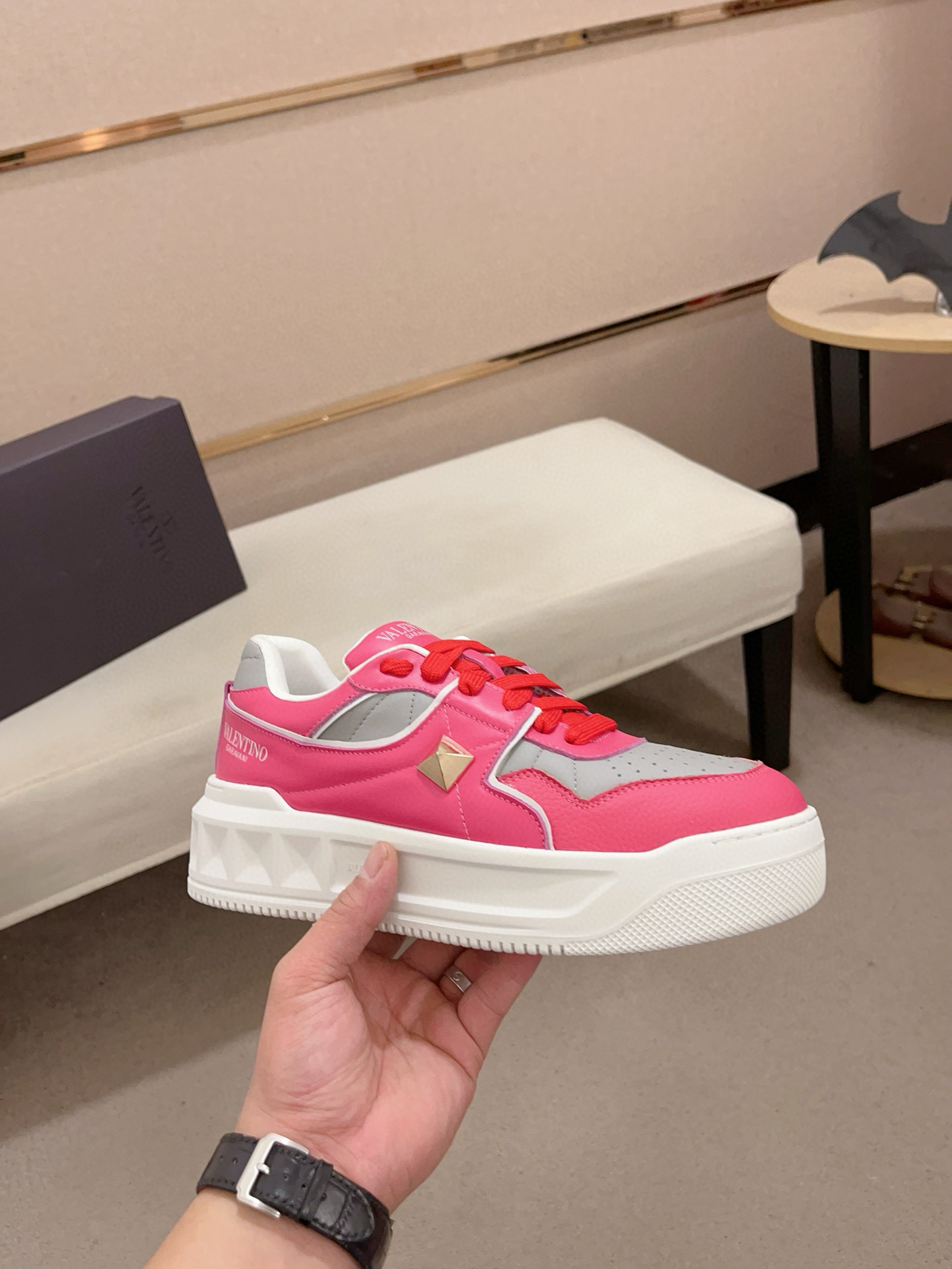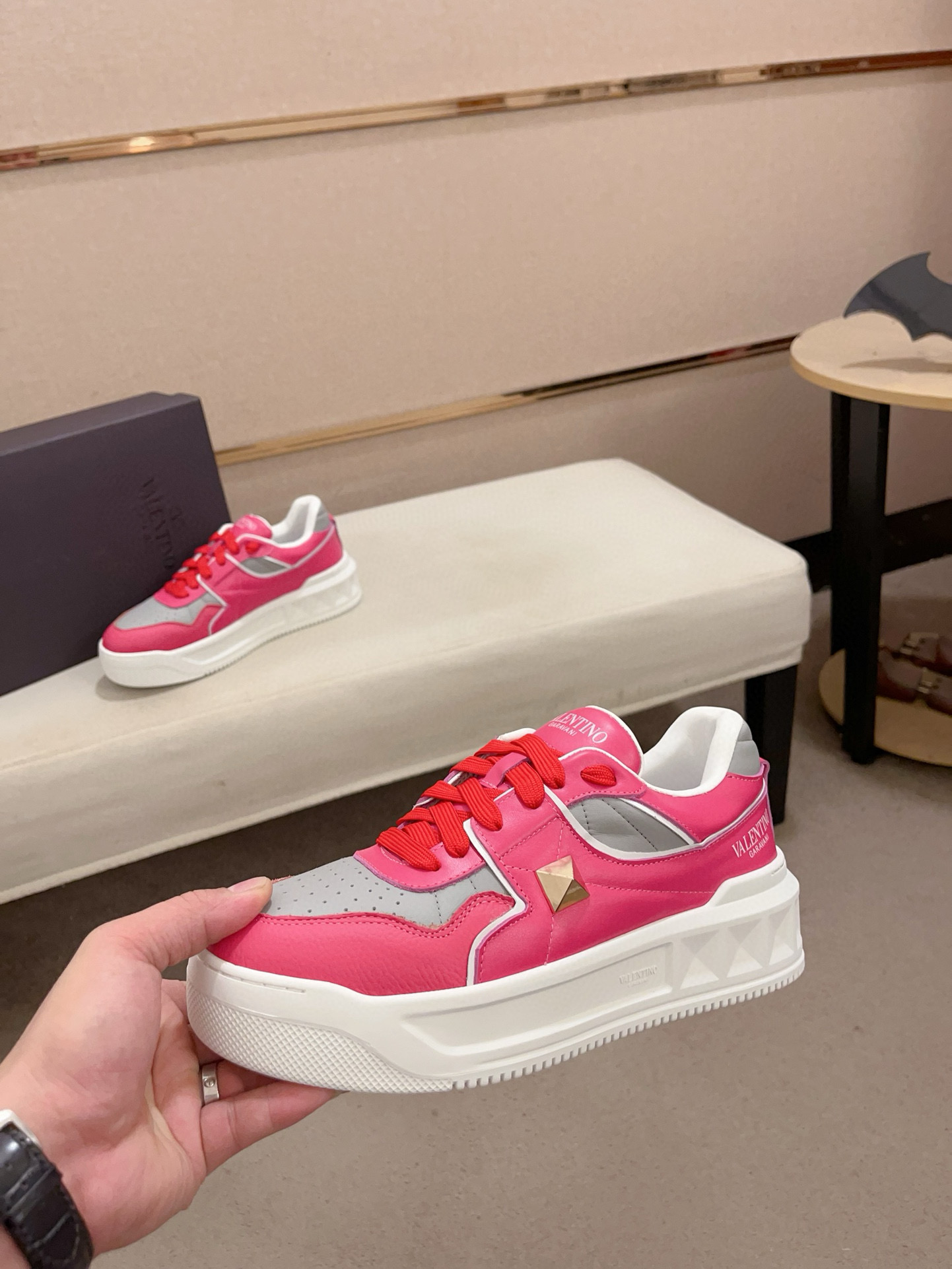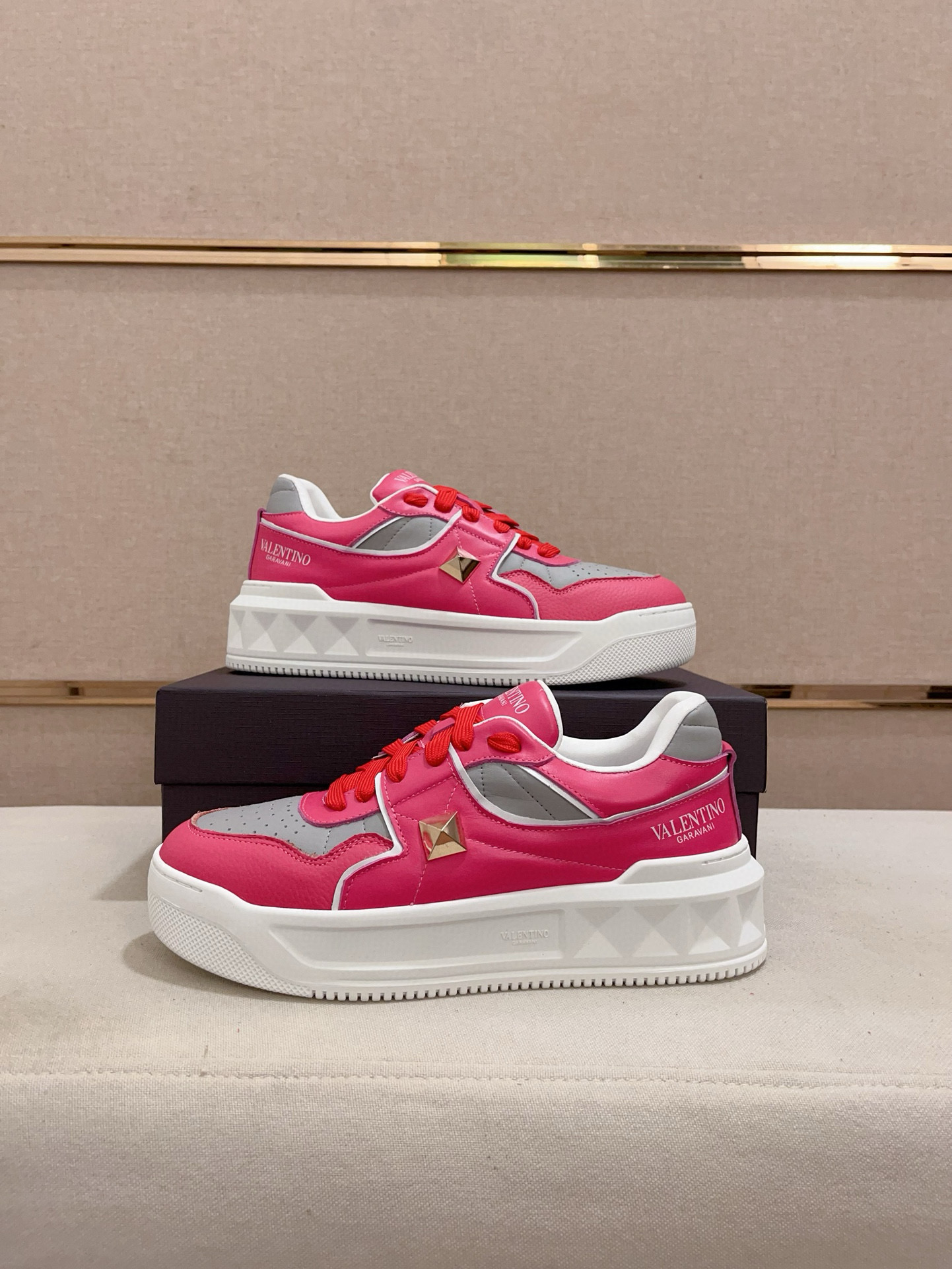 这款鞋子是AAAAA 1:1 质量 (非常棒). 使用了和原版一模一样的材料. 商标部分也保持了和华伦天奴/Valentino一样. 图片拍摄是实物鞋子拍摄, 您所收到的实物保证和我们图片一模一样.