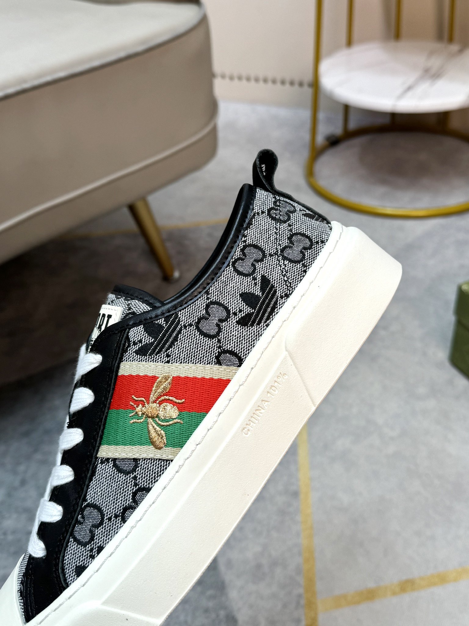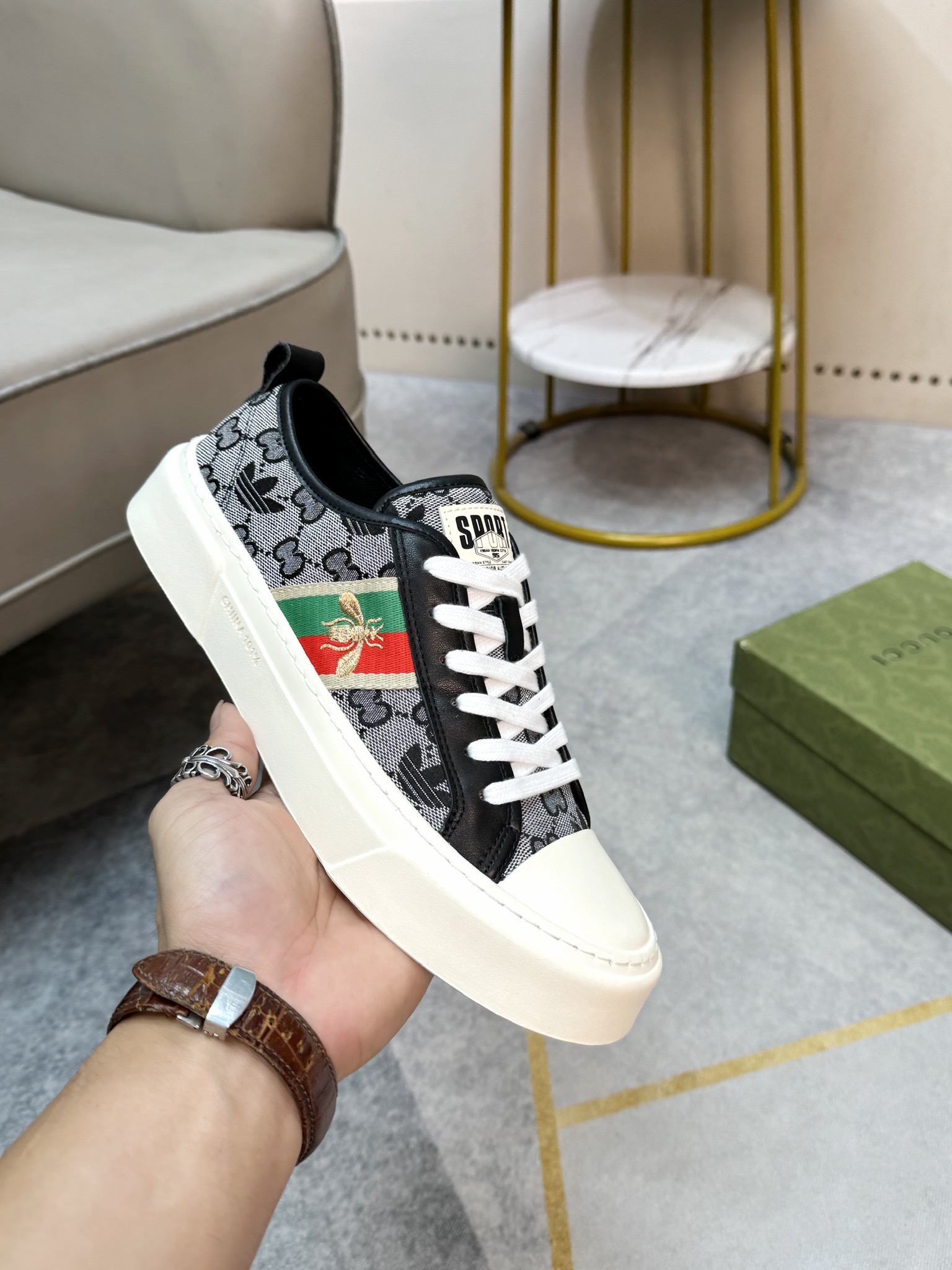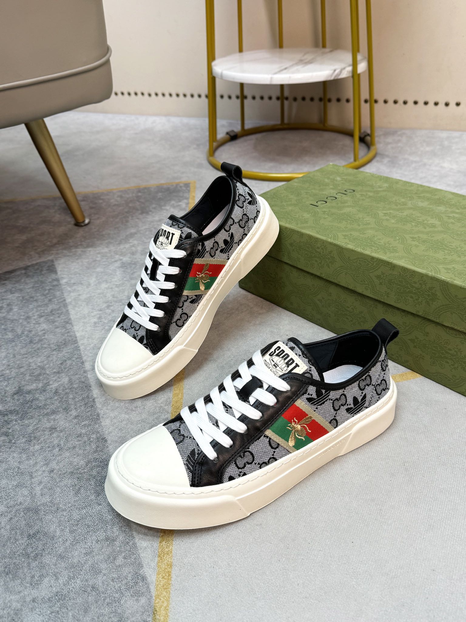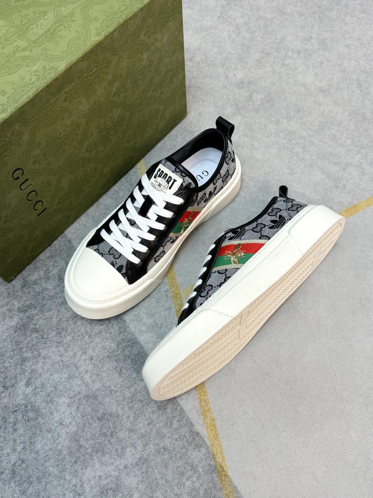 这款鞋子是AAAAA 1:1 质量 (非常棒). 使用了和原版一模一样的材料. 商标部分也保持了和古奇/Gucci一样. 图片拍摄是实物鞋子拍摄, 您所收到的实物保证和我们图片一模一样.