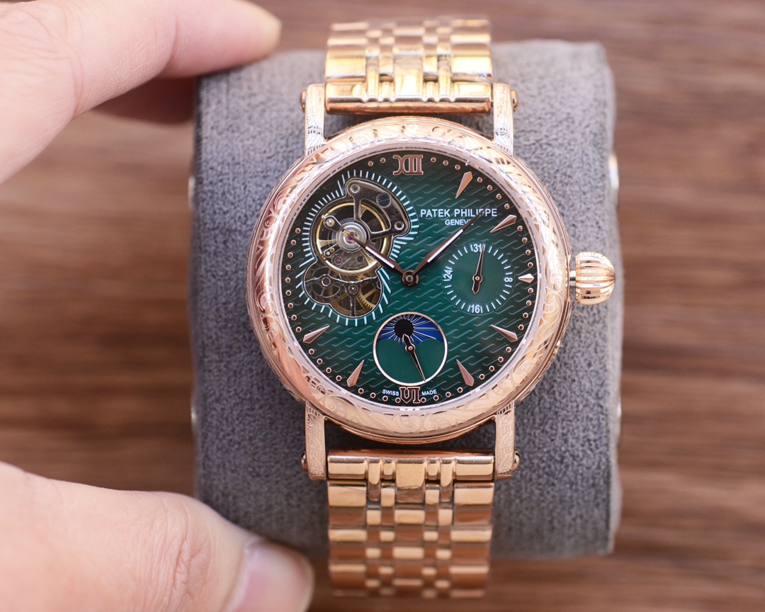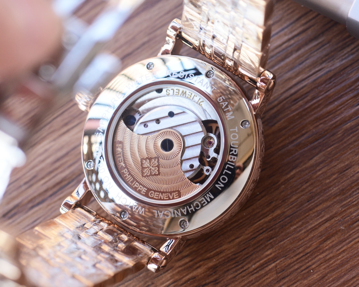 这款手表是AAAAA 1:1 质量 (非常棒). 使用了和原版一模一样的材料. 商标部分也保持了和百达翡丽/Patek Philippe一样. 图片拍摄是实物手表拍摄, 您所收到的实物保证和我们图片一模一样.