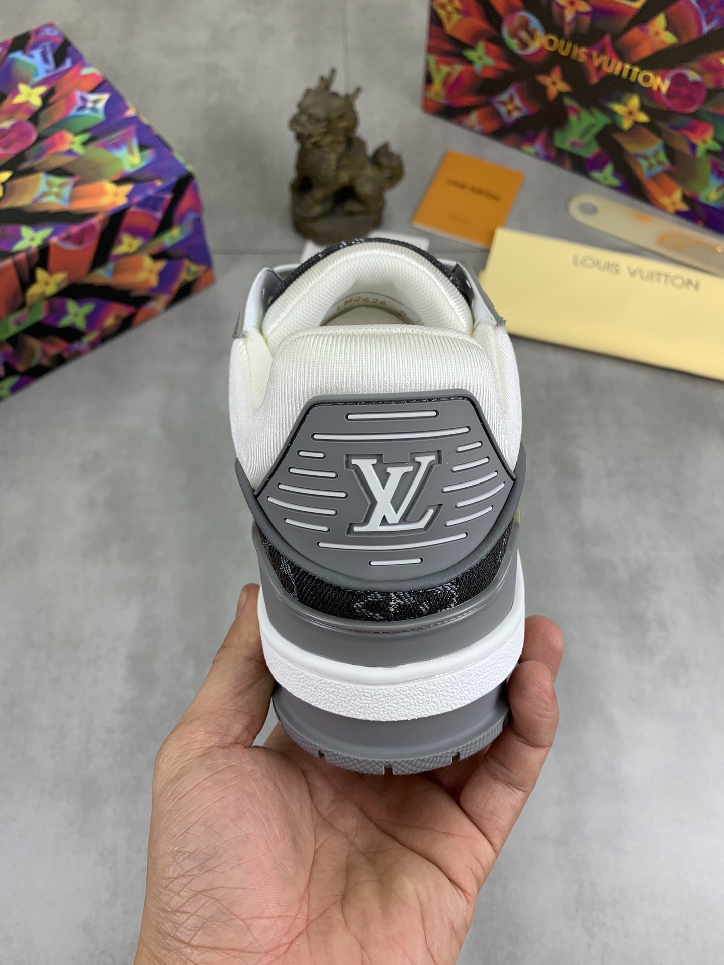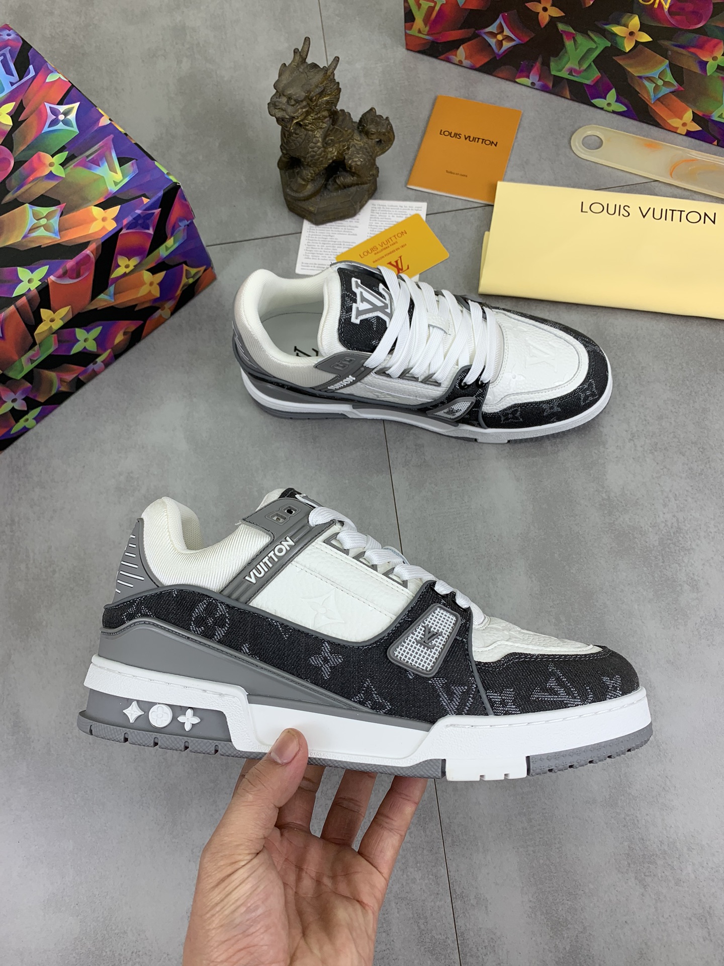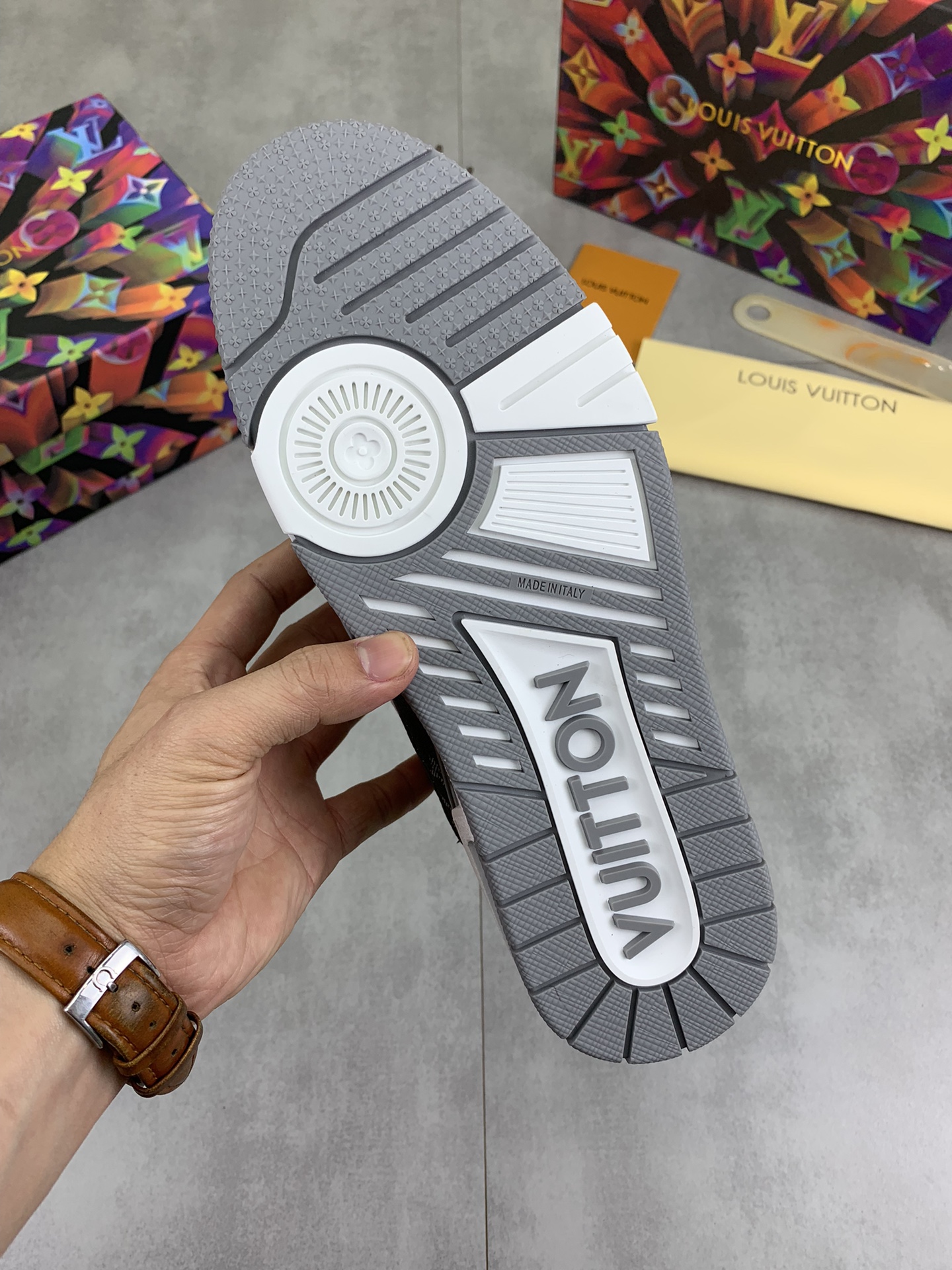 这款鞋子是AAAAA 1:1 质量 (非常棒). 使用了和原版一模一样的材料. 商标部分也保持了和路易威登/Louis Vuitton一样. 图片拍摄是实物鞋子拍摄, 您所收到的实物保证和我们图片一模一样.