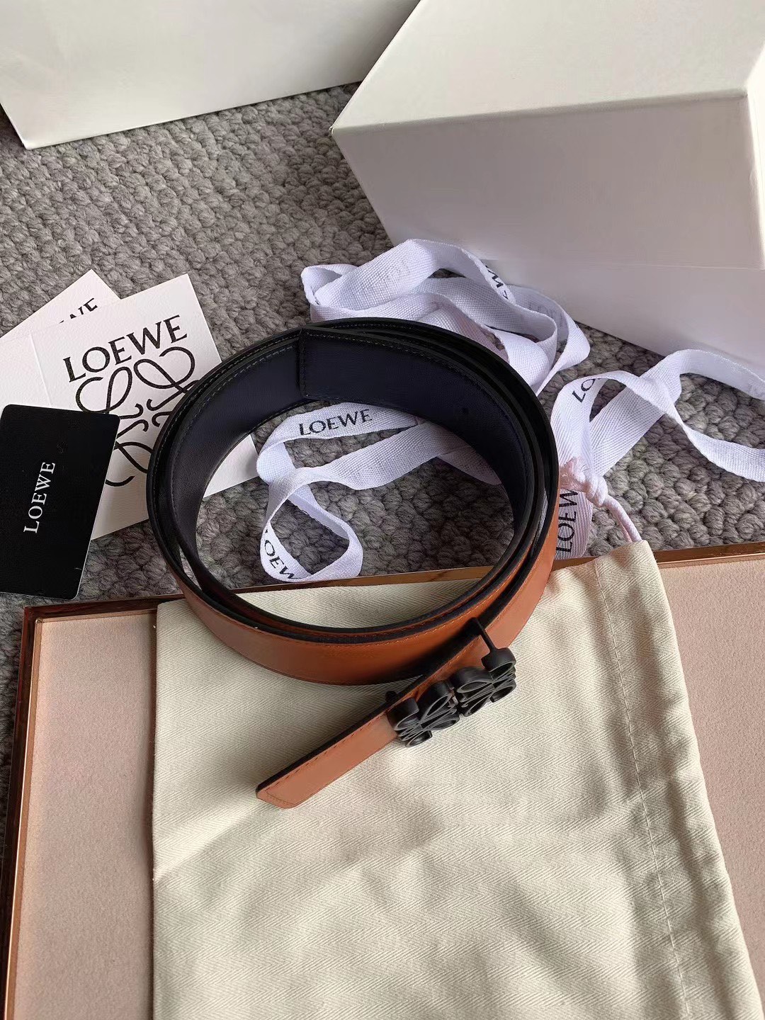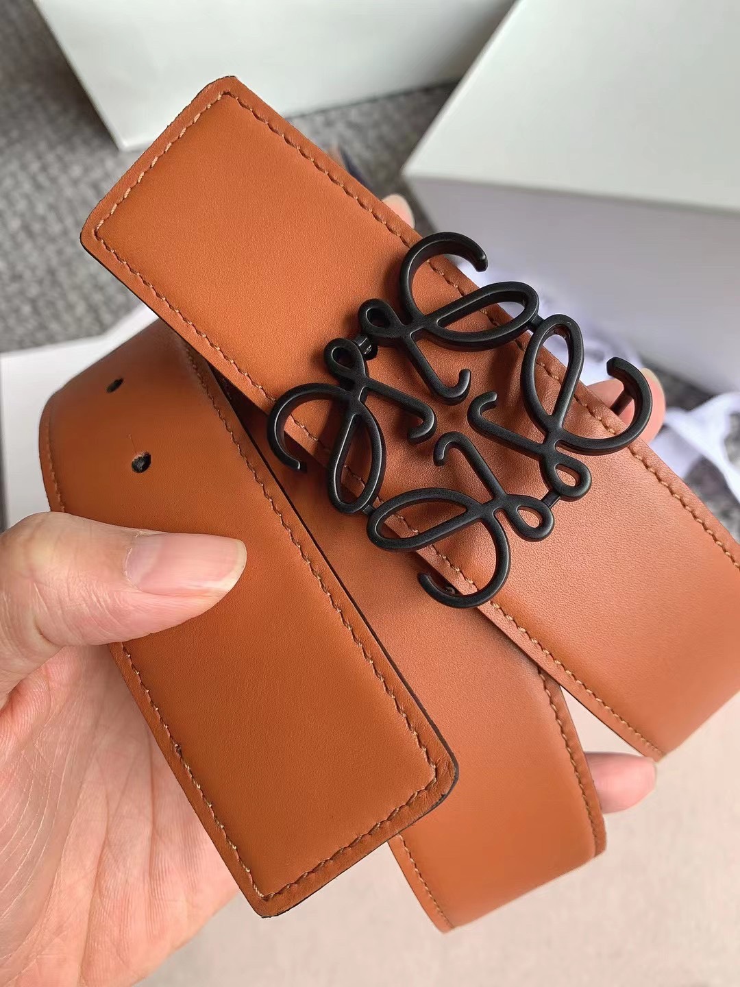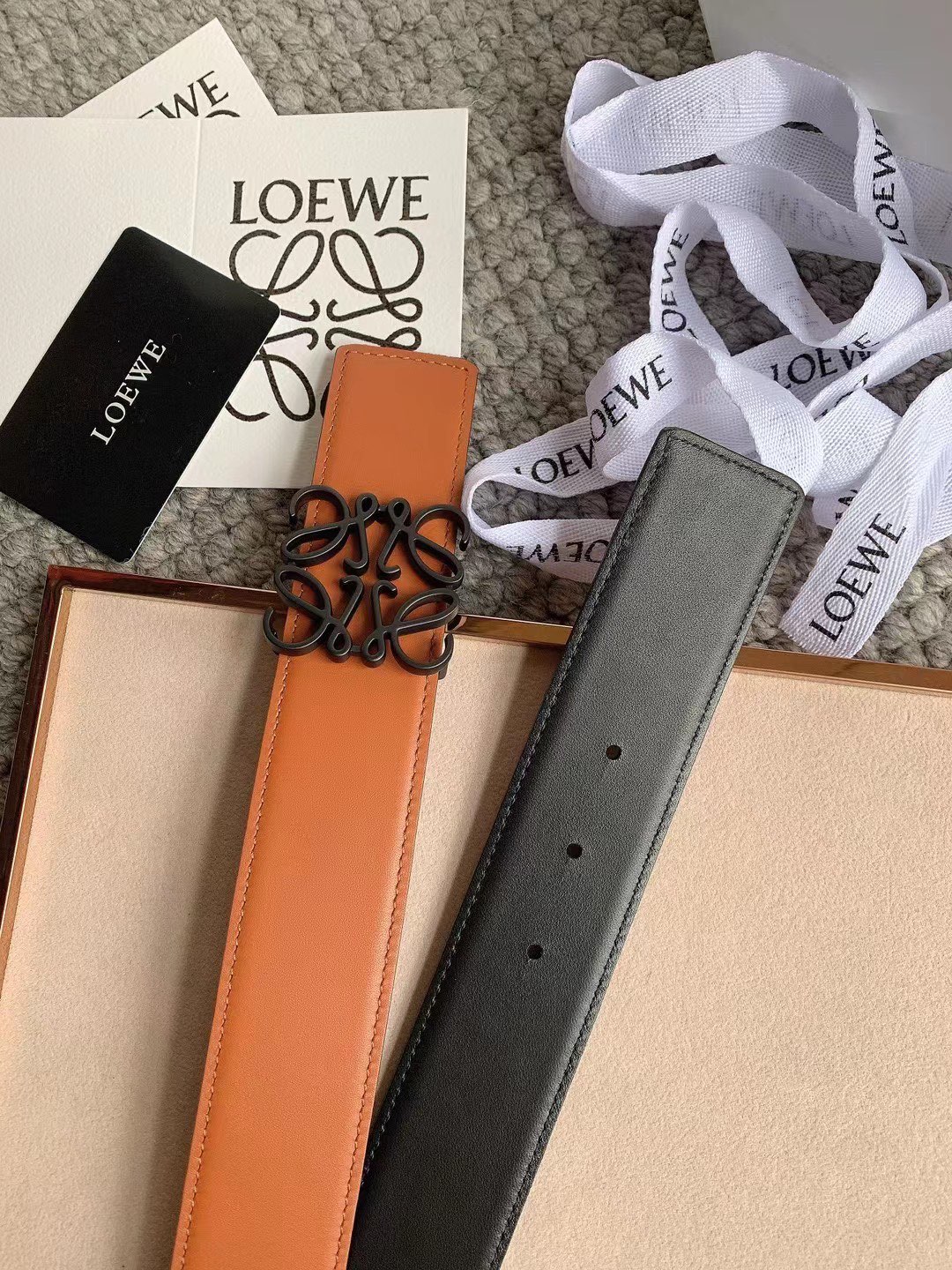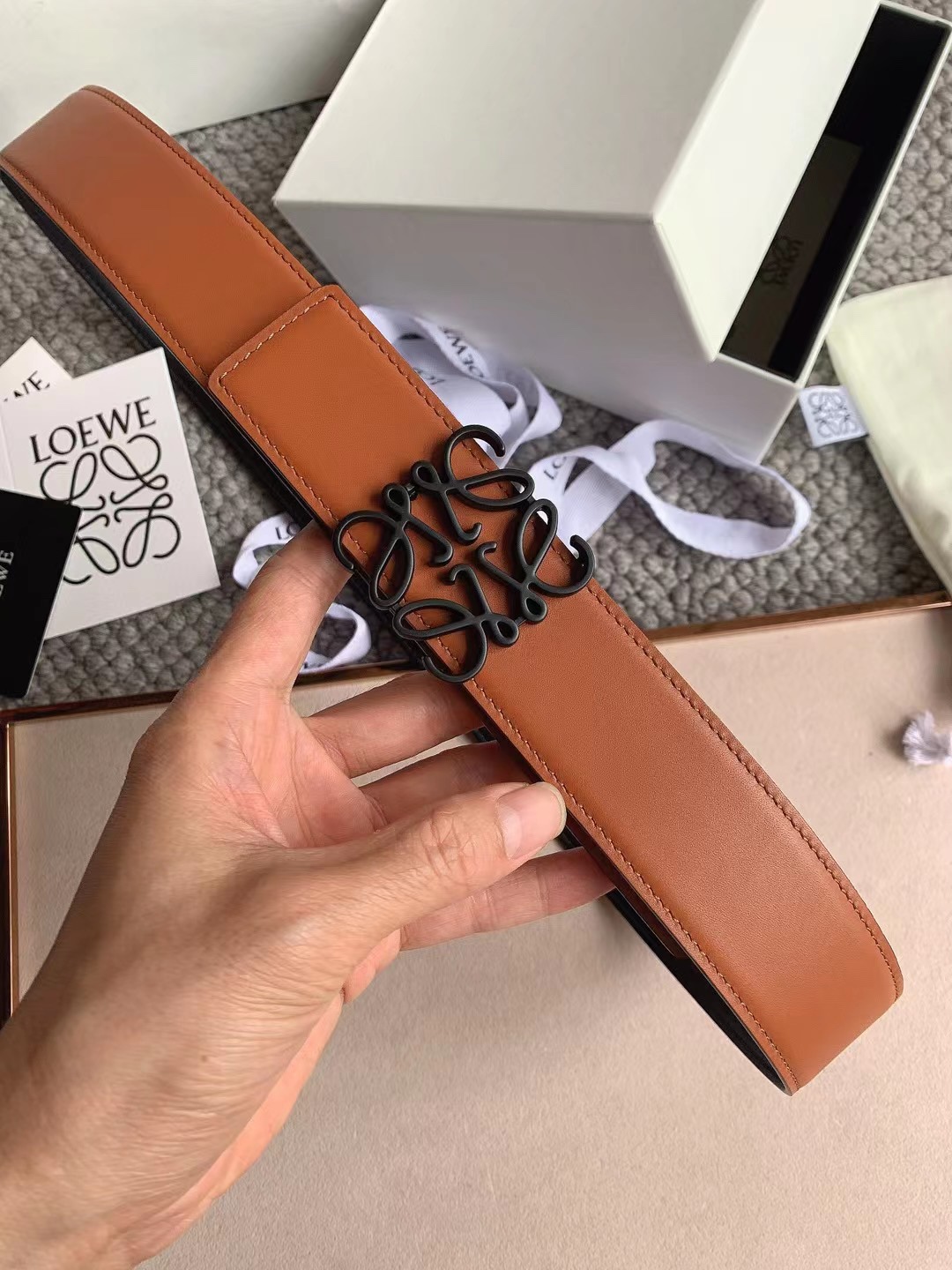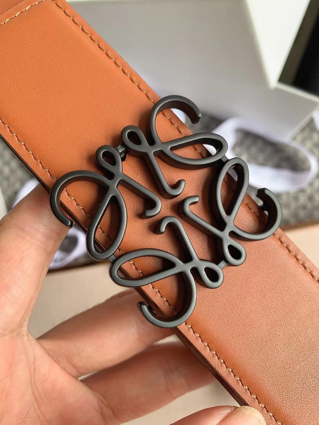 这款皮带是AAAAA 1:1 质量 (非常棒). 使用了和原版一模一样的材料. 商标部分也保持了和罗意威/Loewe一样. 图片拍摄是实物皮带拍摄, 您所收到的实物保证和我们图片一模一样.