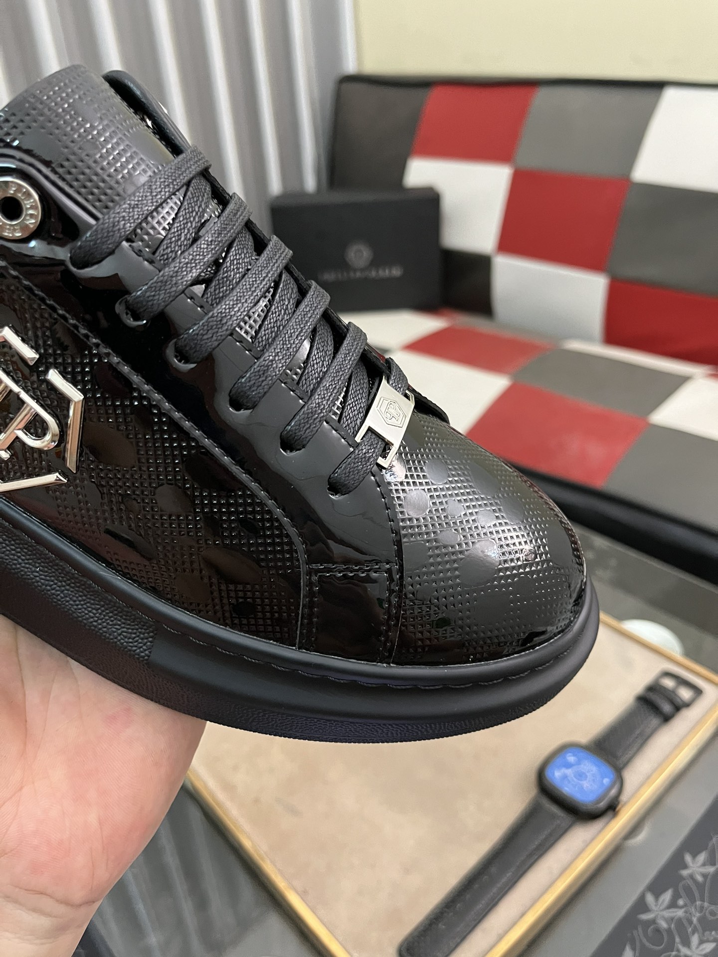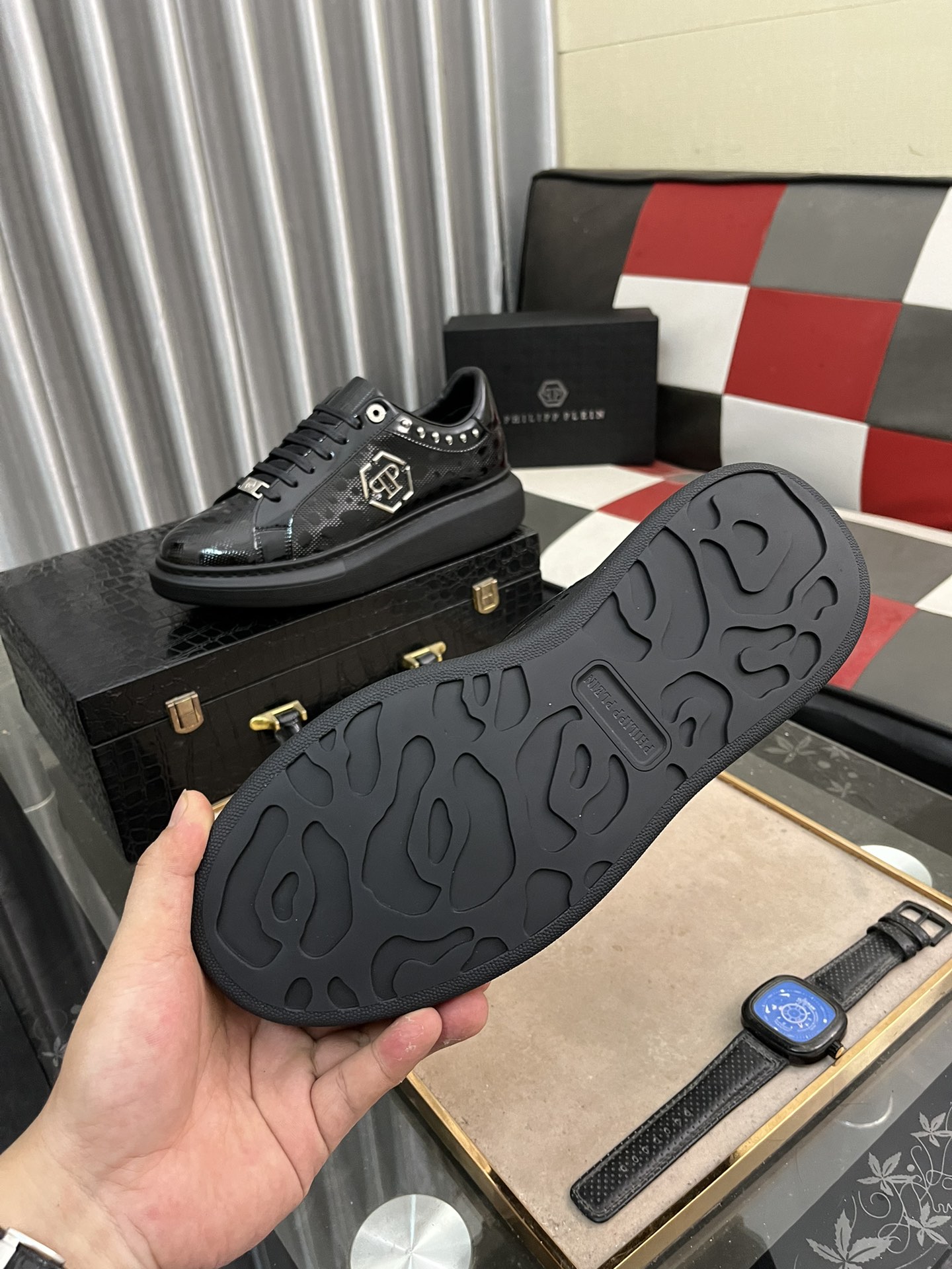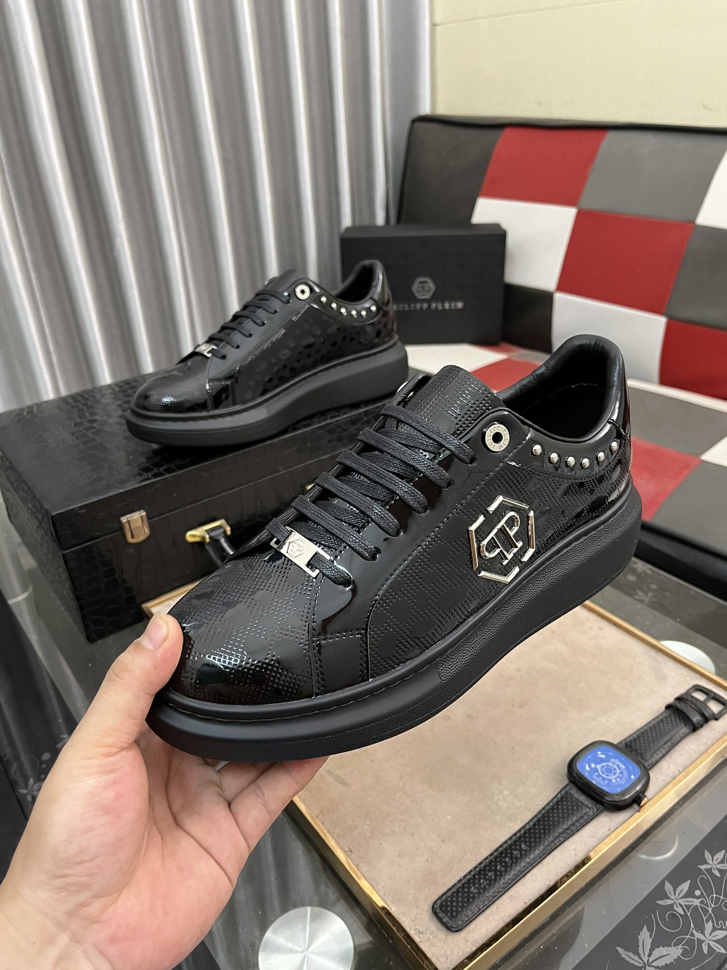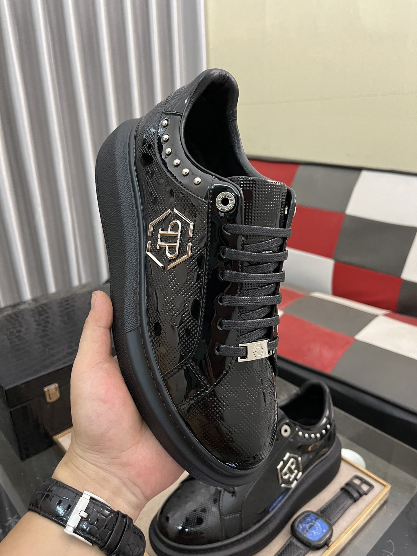 这款鞋子是AAAAA 1:1 质量 (非常棒). 使用了和原版一模一样的材料. 商标部分也保持了和菲利普·普林/Philipp Plein一样. 图片拍摄是实物鞋子拍摄, 您所收到的实物保证和我们图片一模一样.