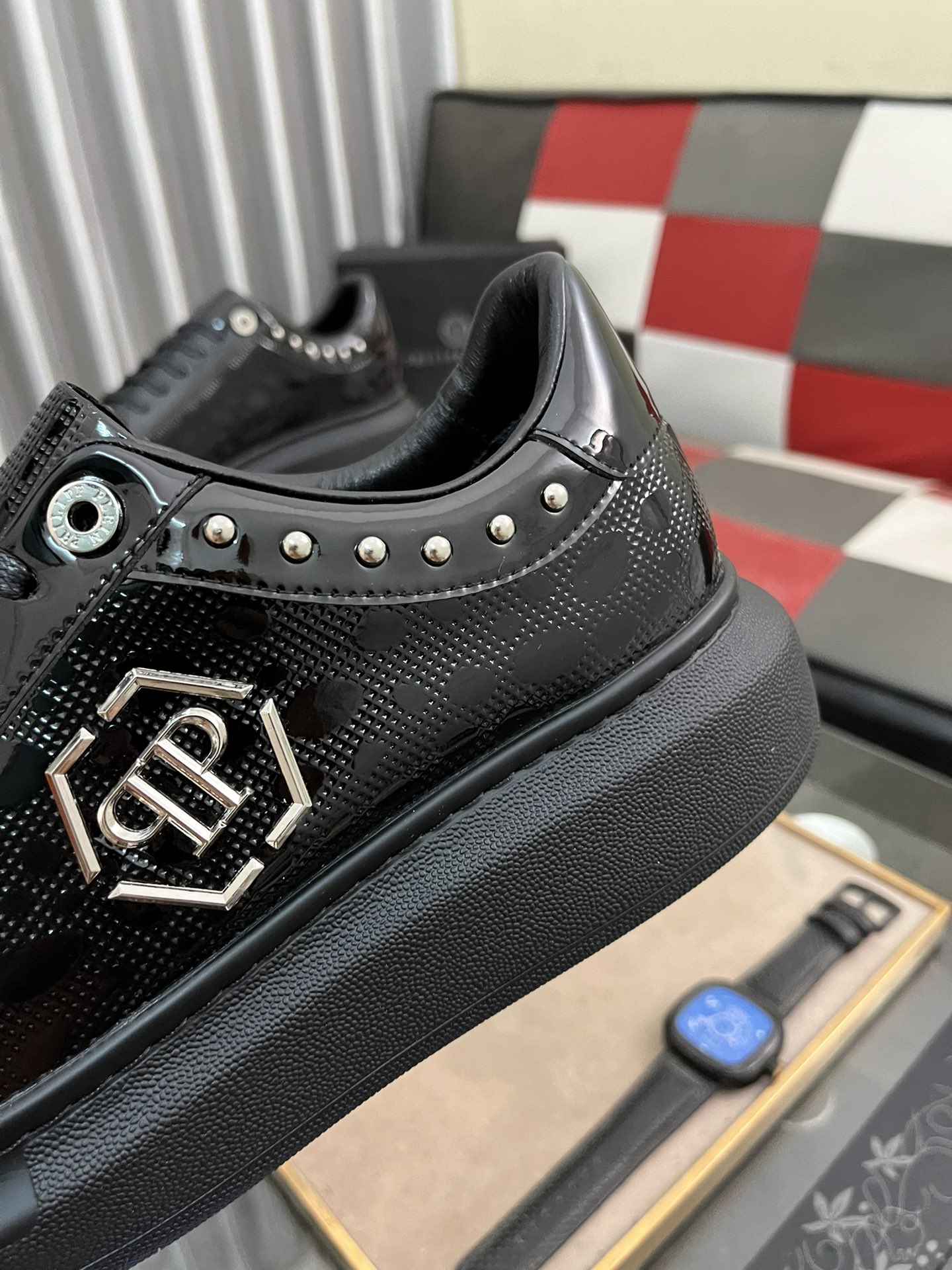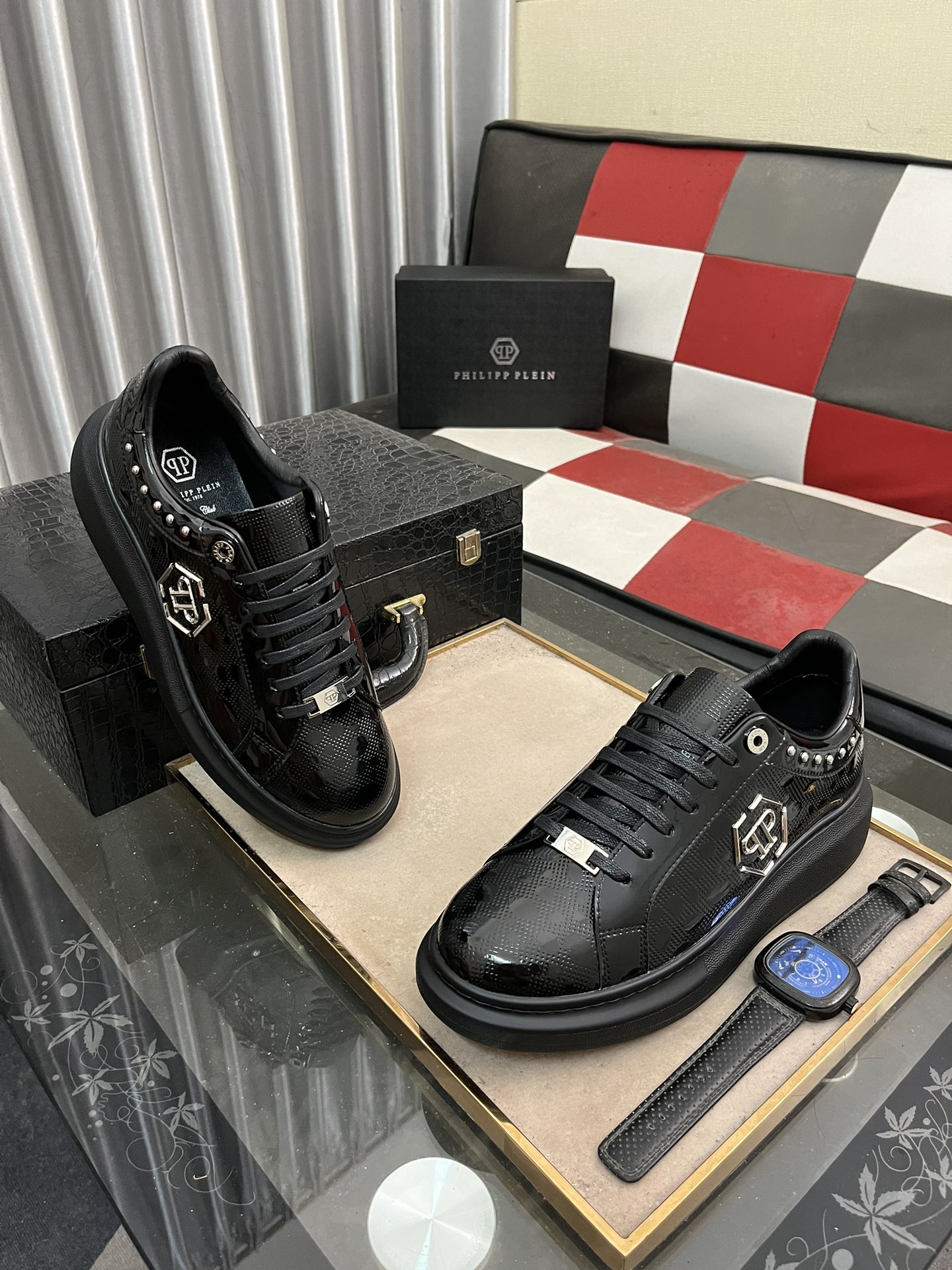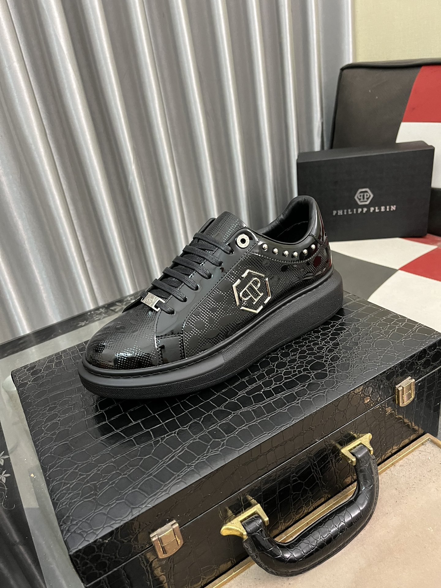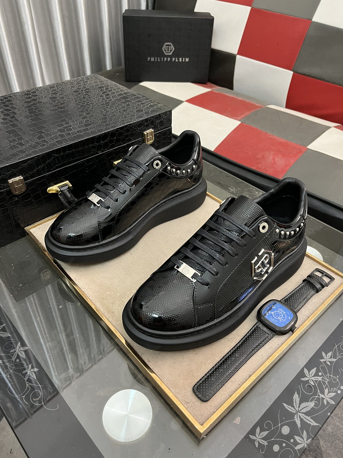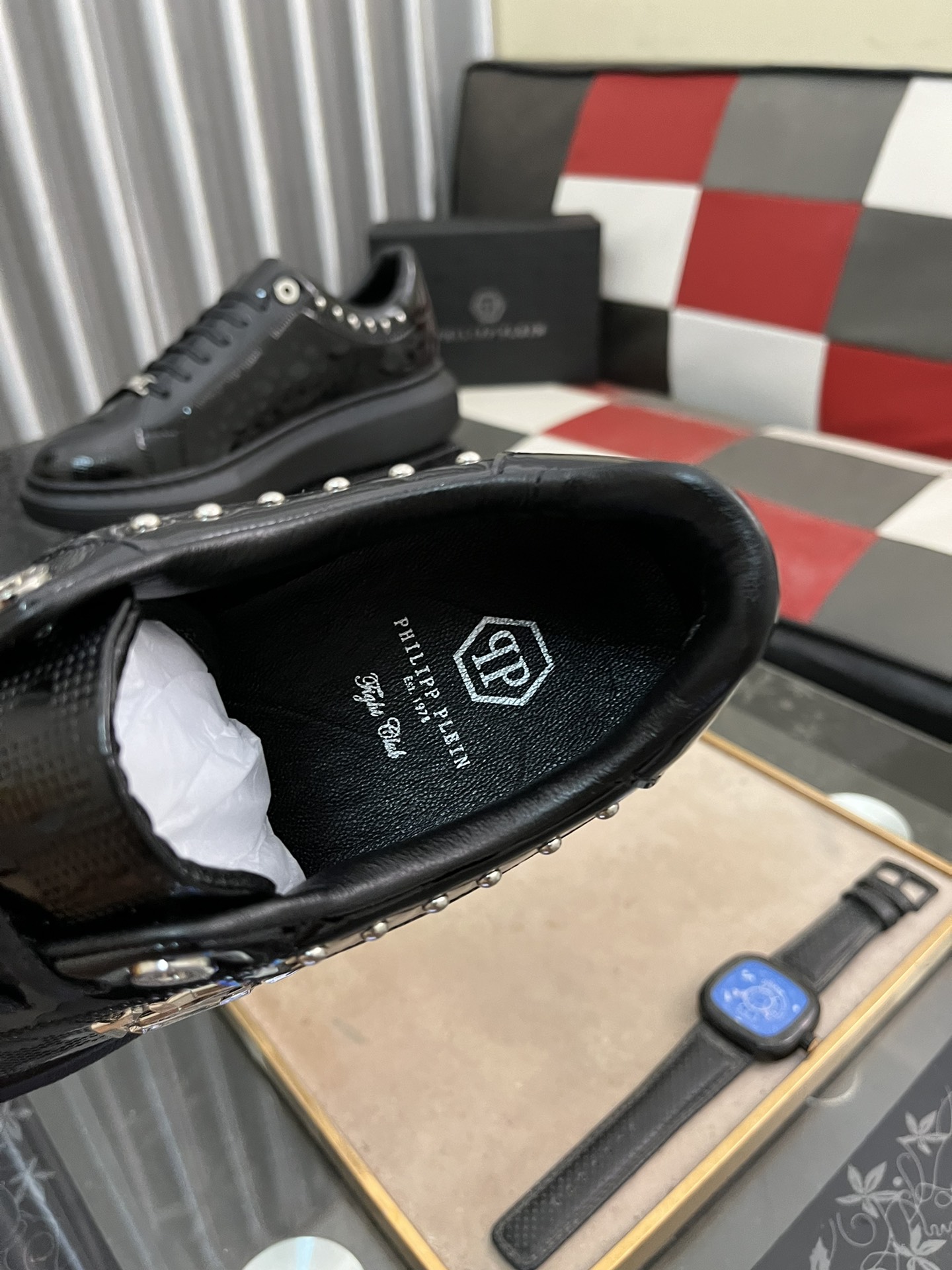 这款鞋子是AAAAA 1:1 质量 (非常棒). 使用了和原版一模一样的材料. 商标部分也保持了和菲利普·普林/Philipp Plein一样. 图片拍摄是实物鞋子拍摄, 您所收到的实物保证和我们图片一模一样.
