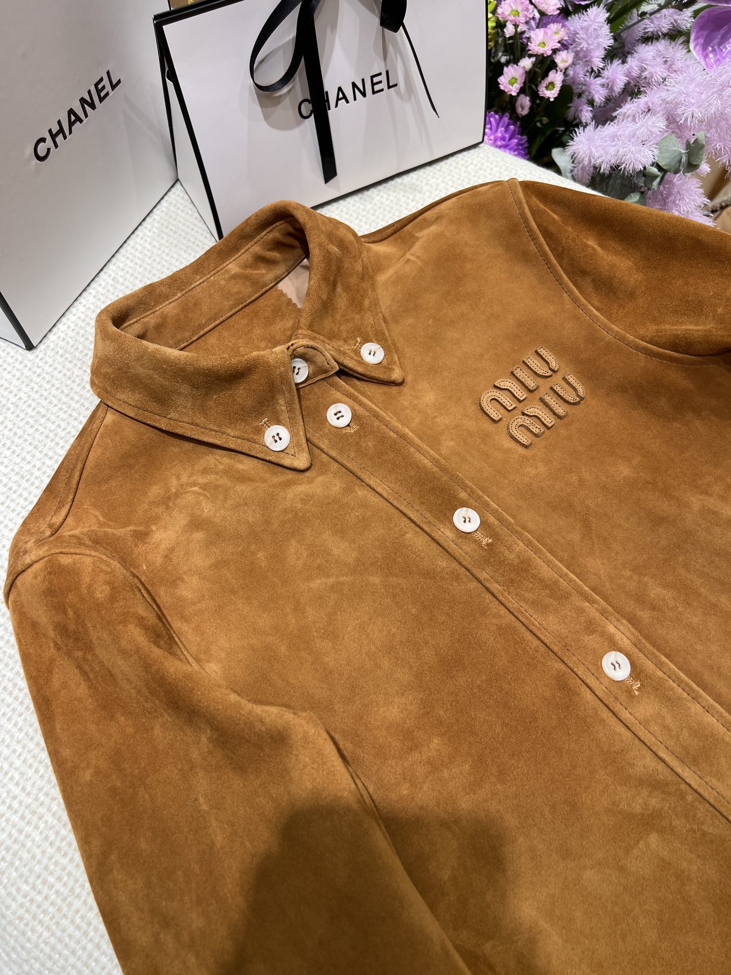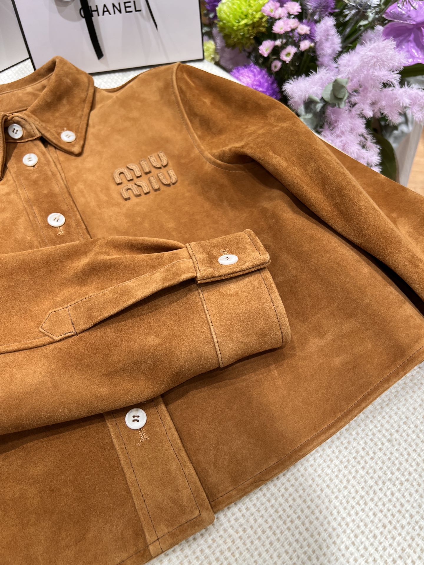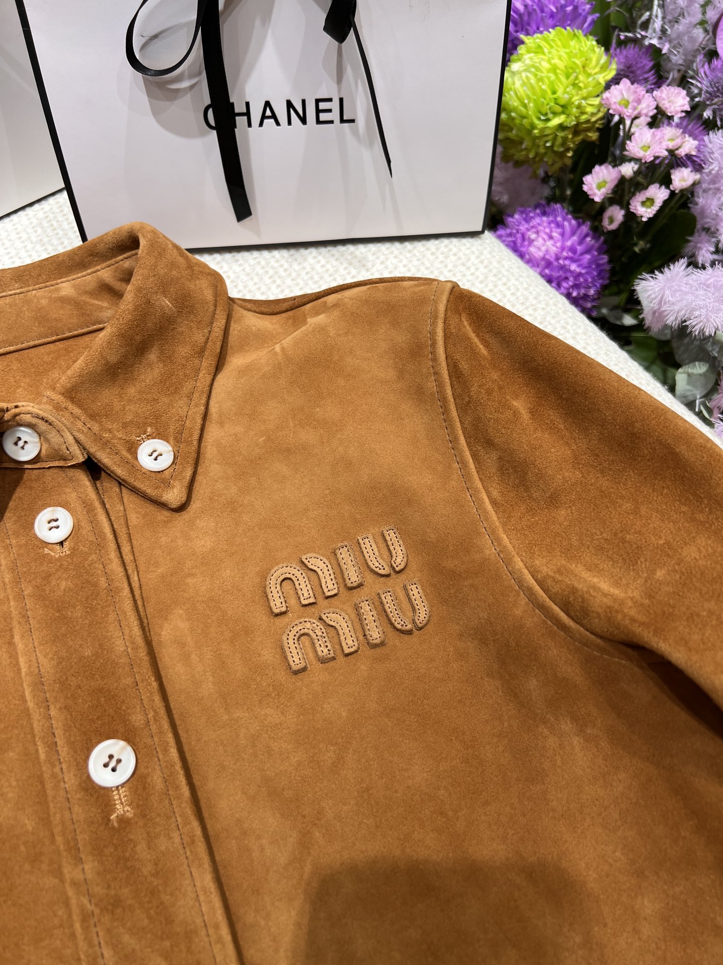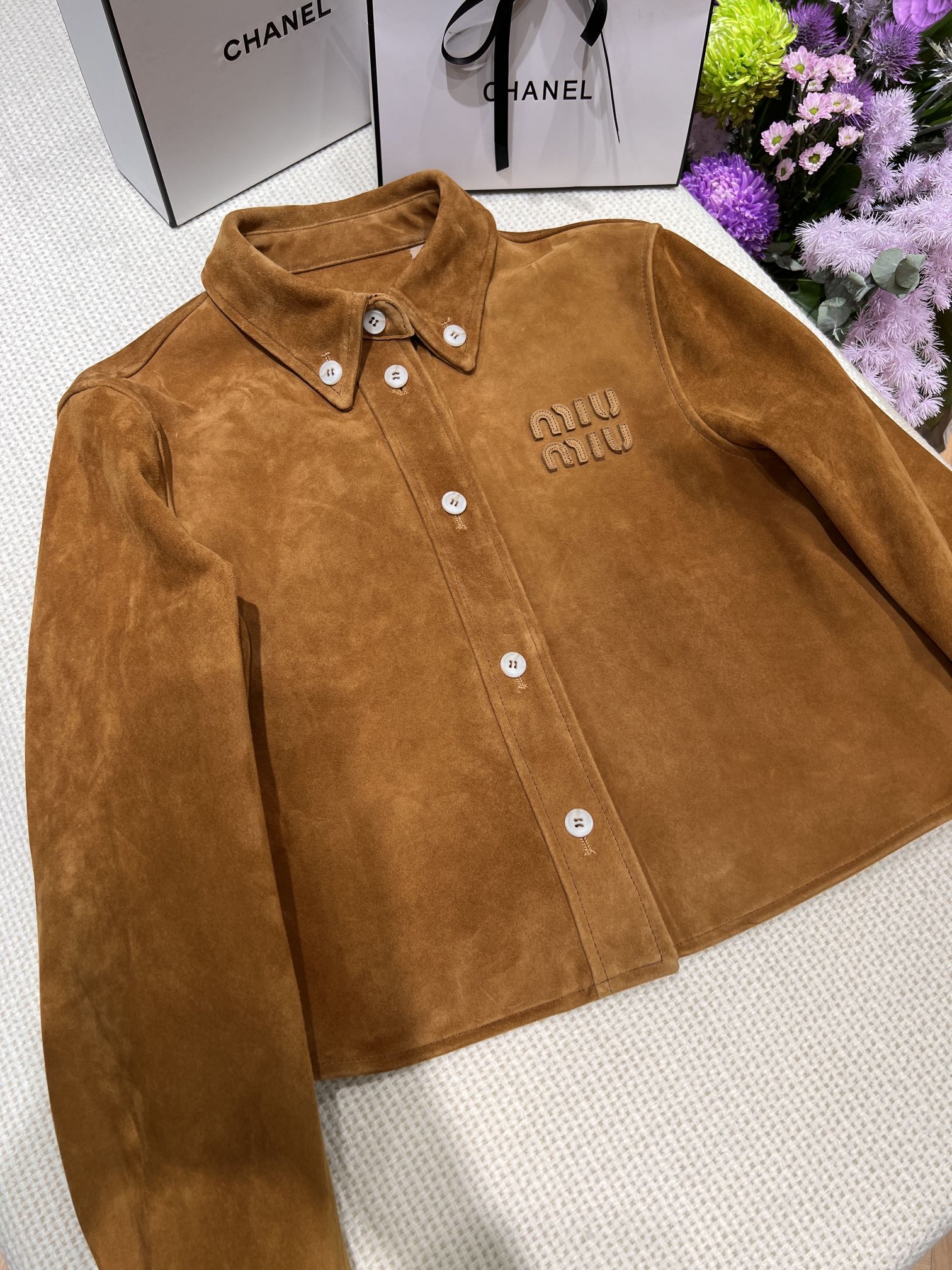 这款衣服是AAAAA 1:1 质量 (非常棒). 使用了和原版一模一样的材料. 商标部分也保持了和缪缪/Miu Miu一样. 图片拍摄是实物衣服拍摄, 您所收到的实物保证和我们图片一模一样.