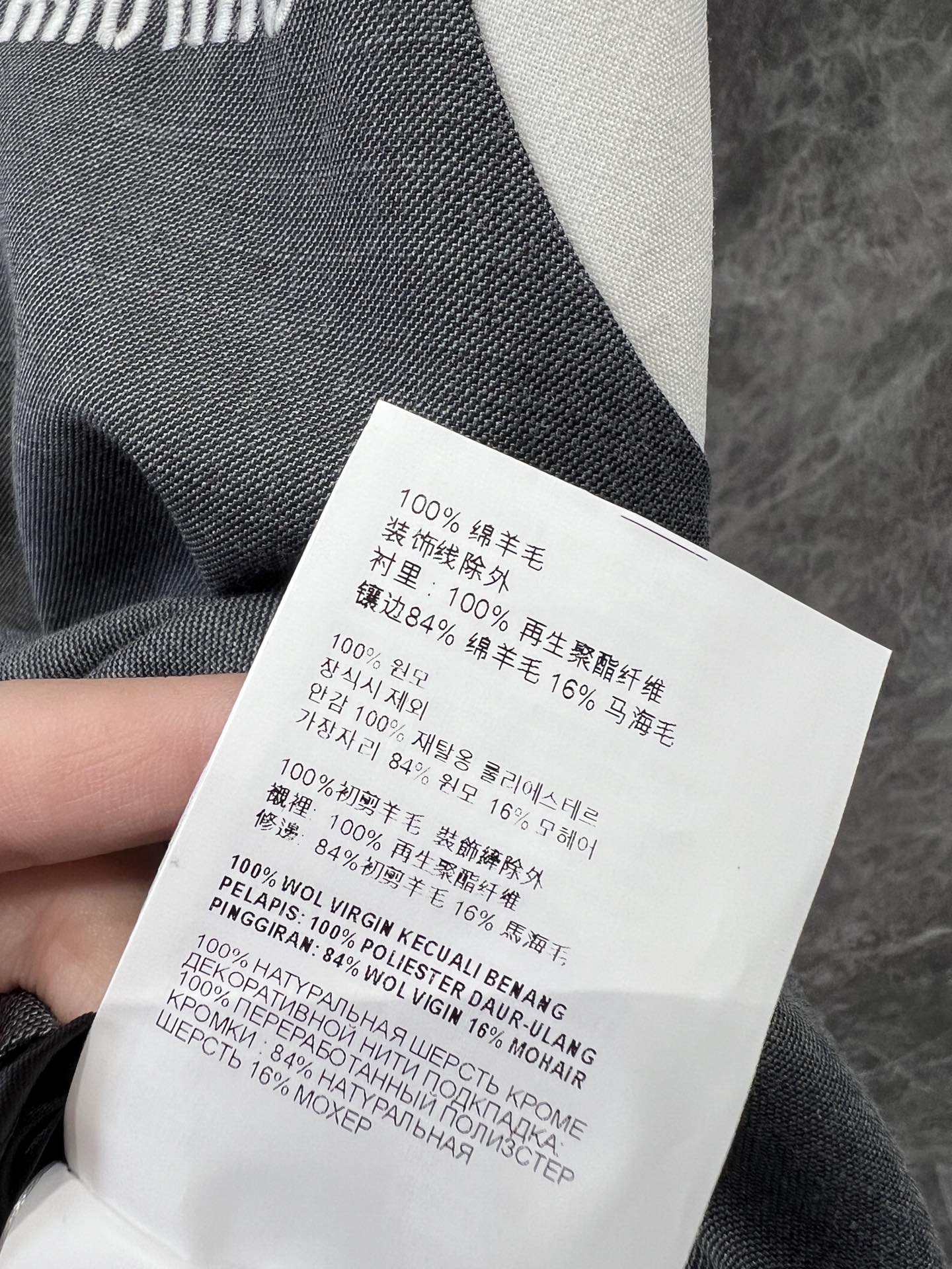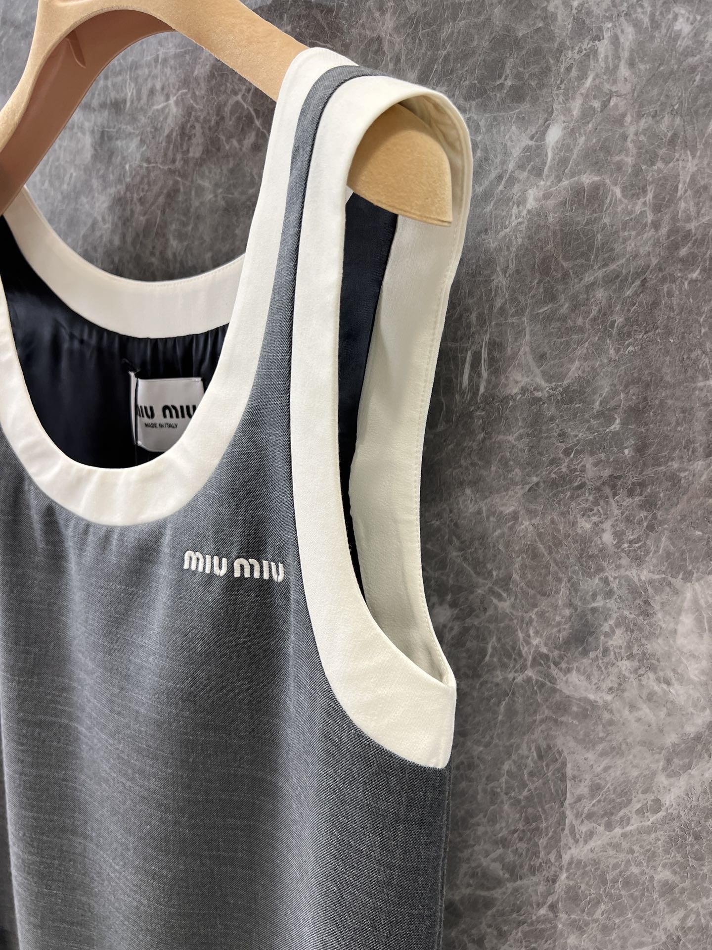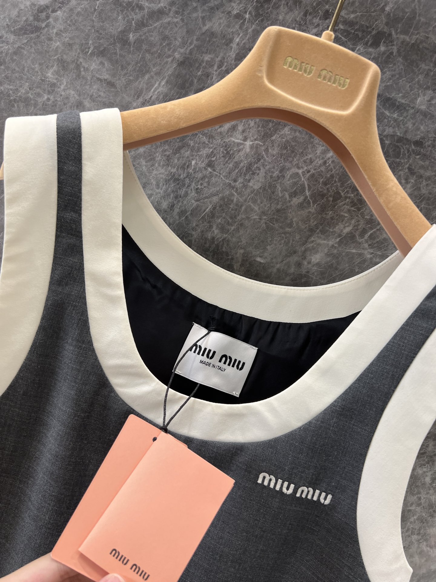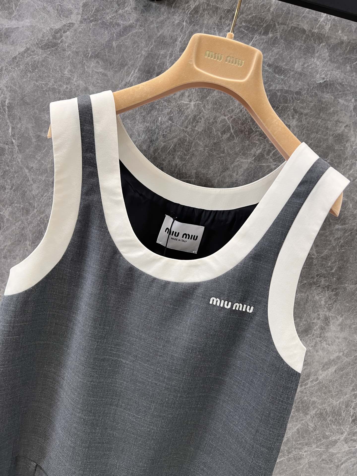 这款衣服是AAAAA 1:1 质量 (非常棒). 使用了和原版一模一样的材料. 商标部分也保持了和缪缪/Miu Miu一样. 图片拍摄是实物衣服拍摄, 您所收到的实物保证和我们图片一模一样.