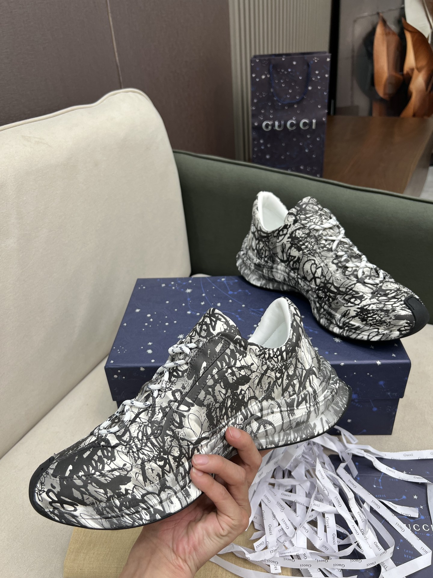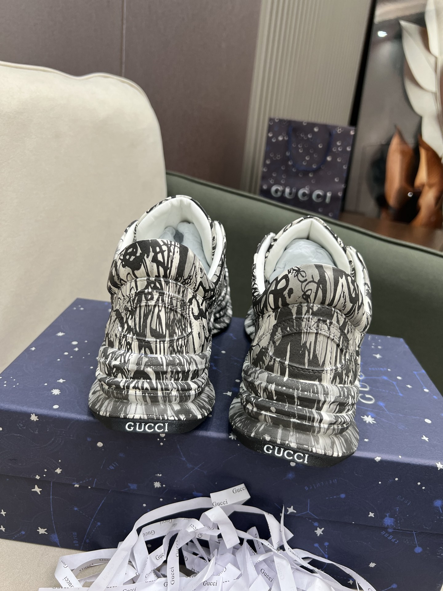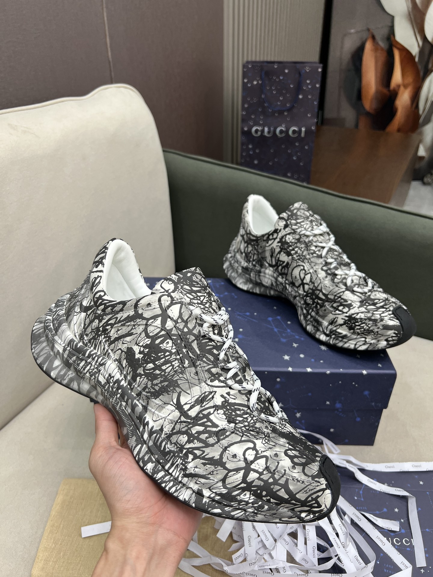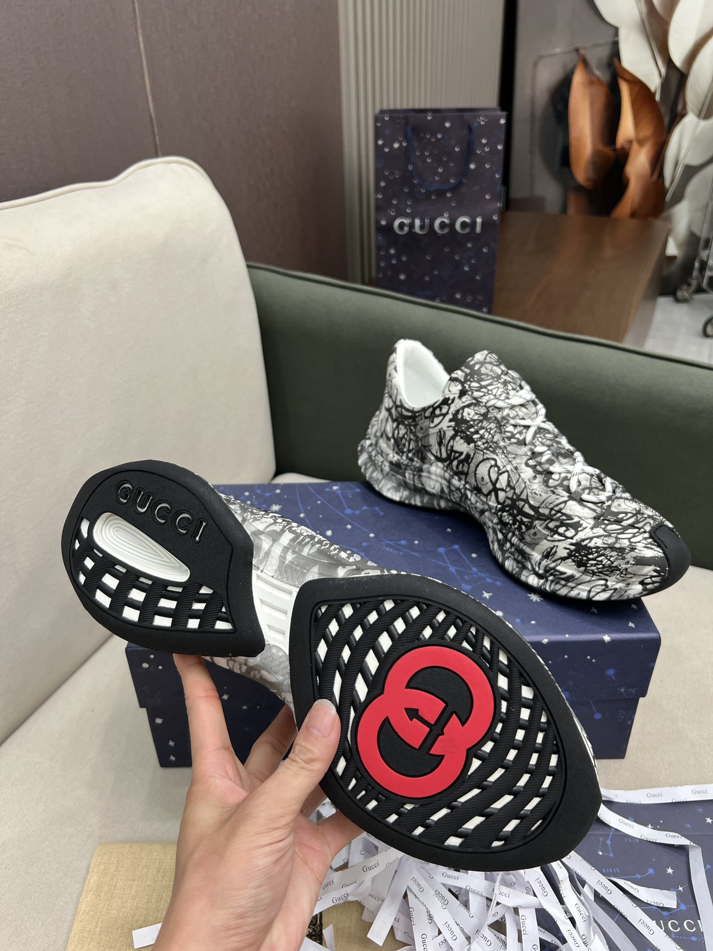 这款鞋子是AAAAA 1:1 质量 (非常棒). 使用了和原版一模一样的材料. 商标部分也保持了和古奇/Gucci一样. 图片拍摄是实物鞋子拍摄, 您所收到的实物保证和我们图片一模一样.