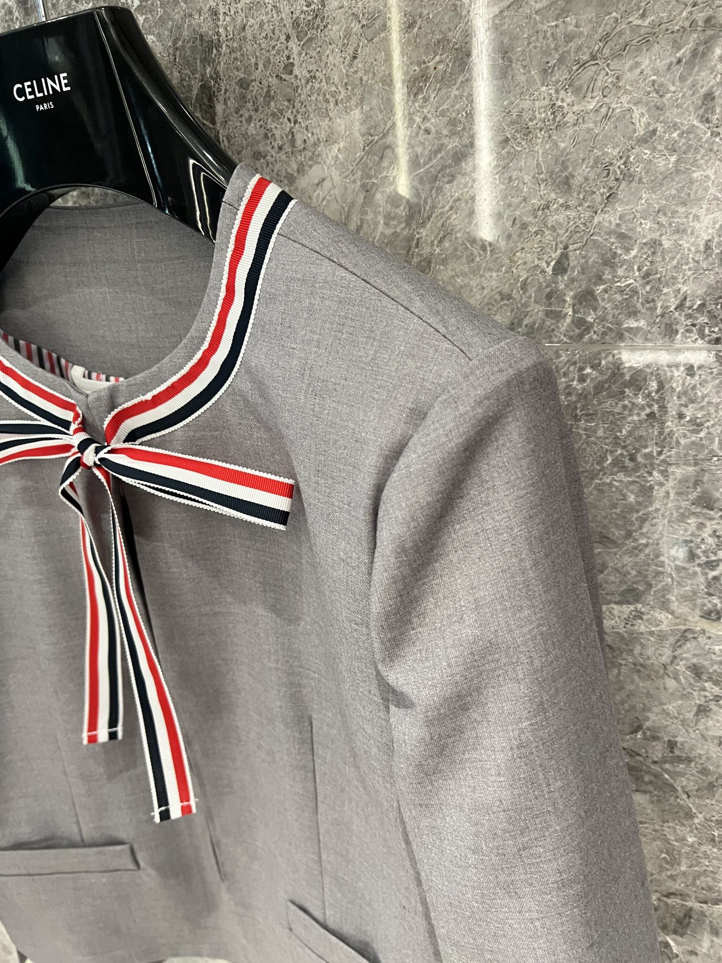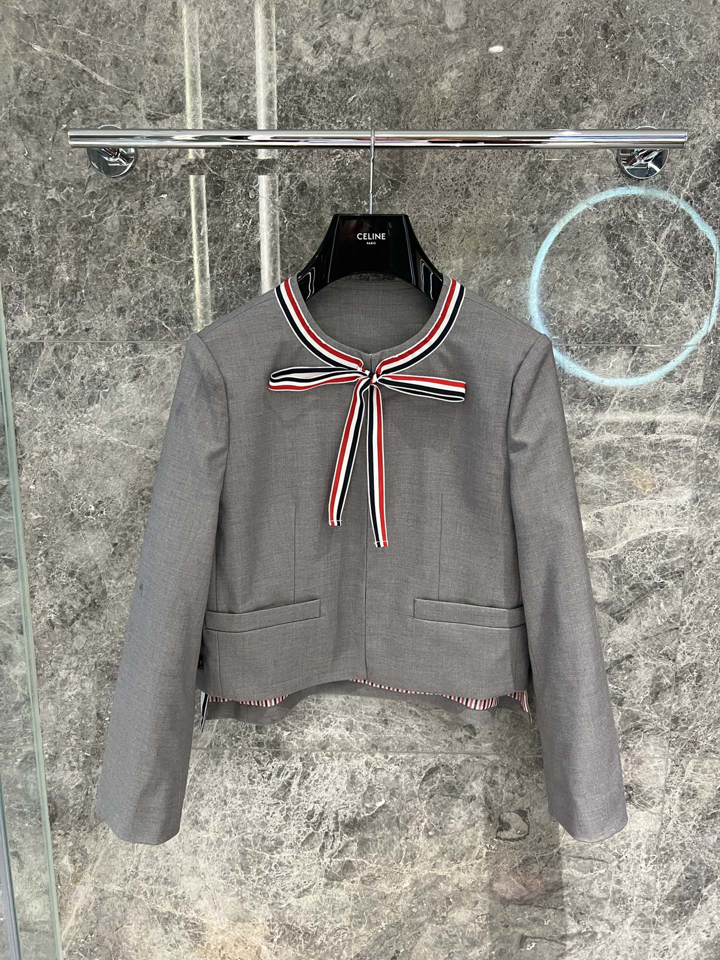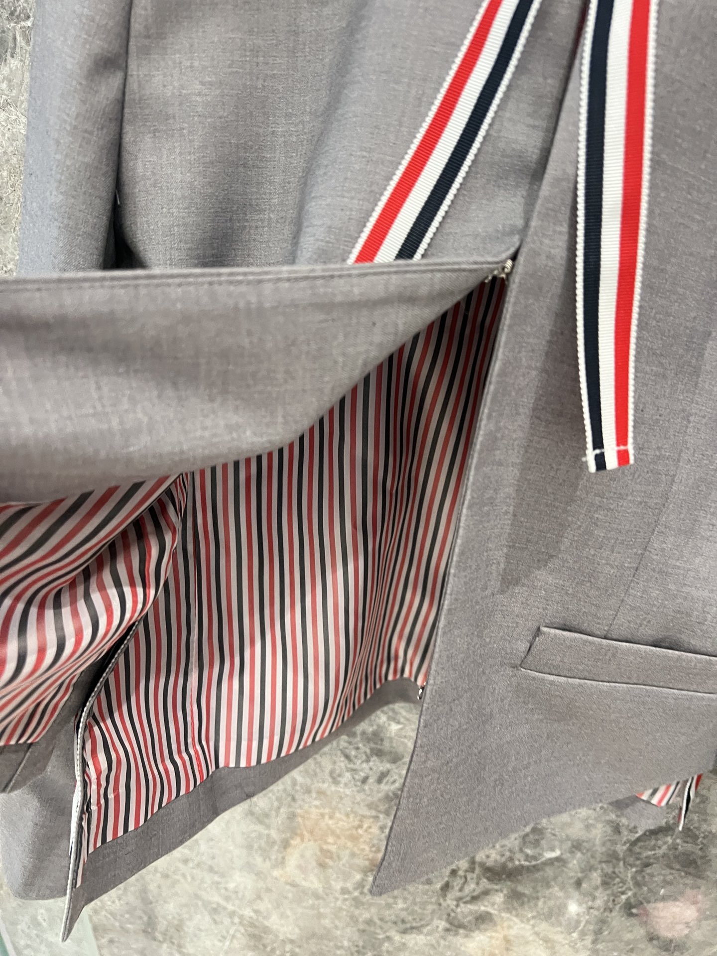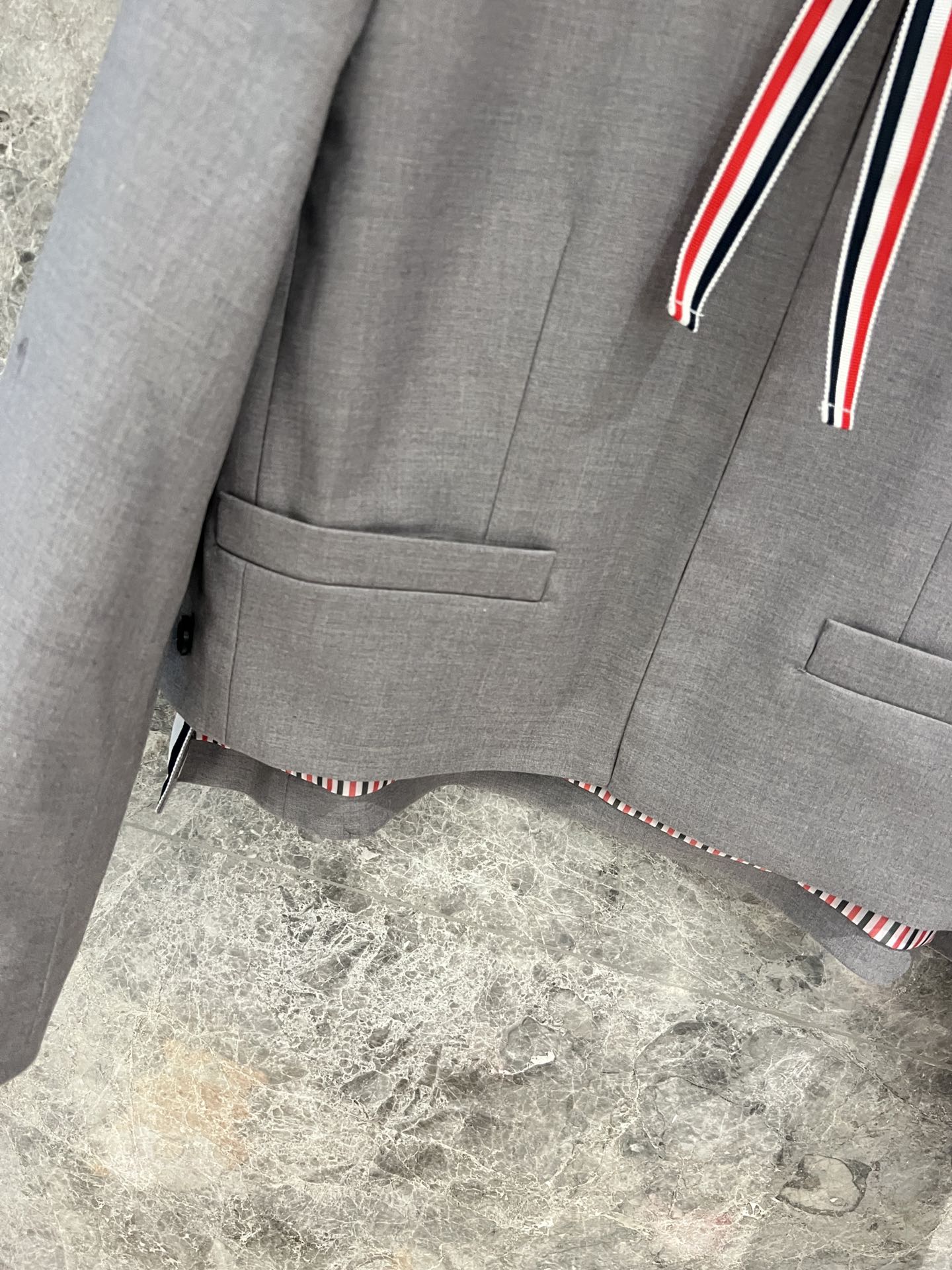 这款衣服是AAAAA 1:1 质量 (非常棒). 使用了和原版一模一样的材料. 商标部分也保持了和汤姆布朗/Thom Browne一样. 图片拍摄是实物衣服拍摄, 您所收到的实物保证和我们图片一模一样.