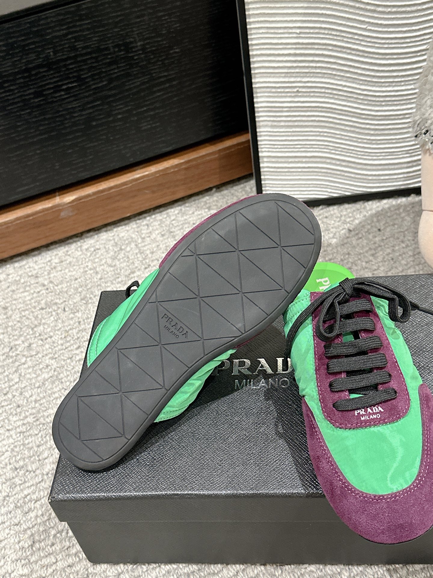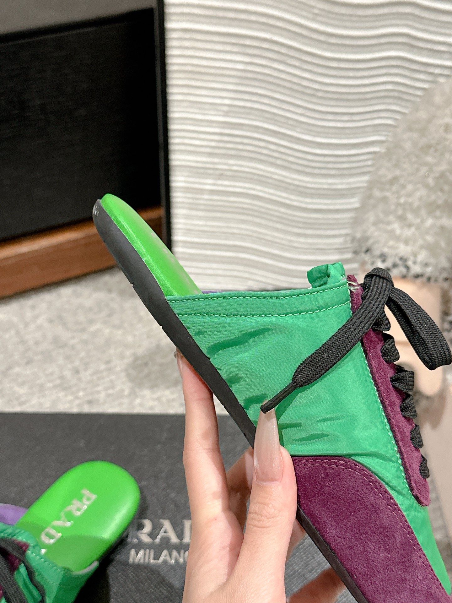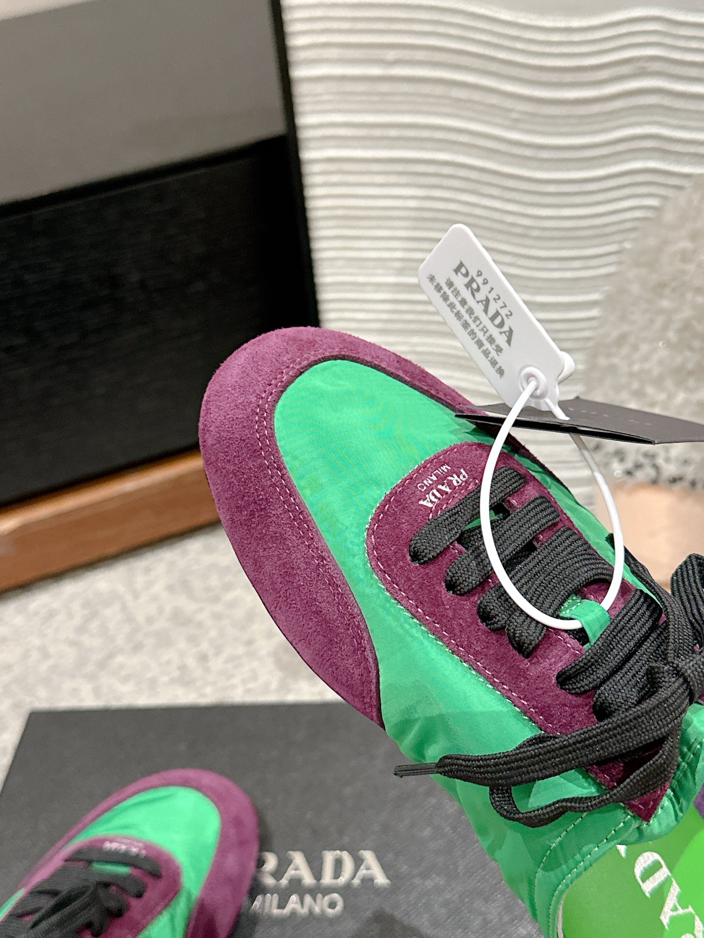 这款鞋子是AAAAA 1:1 质量 (非常棒). 使用了和原版一模一样的材料. 商标部分也保持了和普拉达/Prada一样. 图片拍摄是实物鞋子拍摄, 您所收到的实物保证和我们图片一模一样.