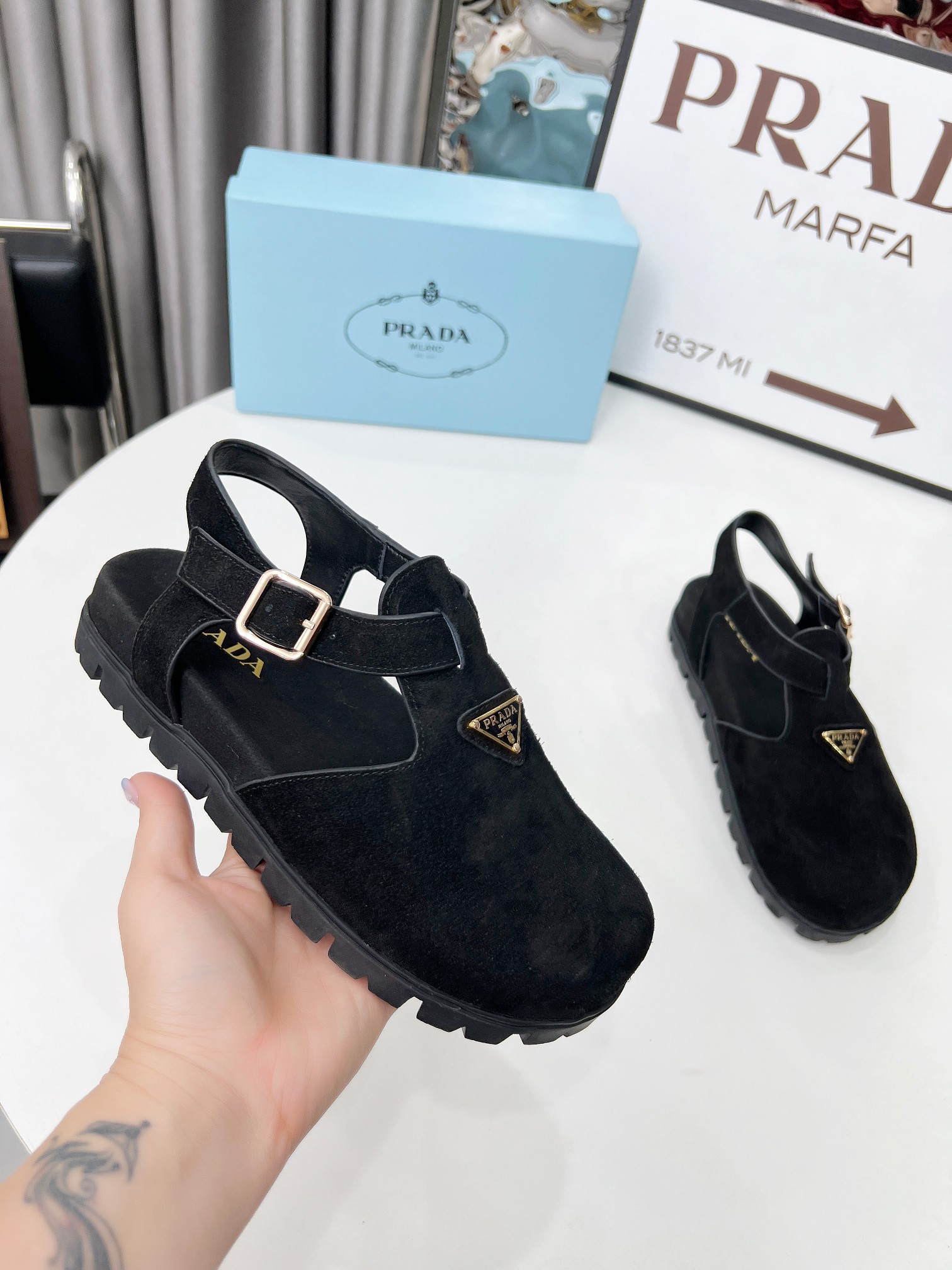 这款鞋子是AAAAA 1:1 质量 (非常棒). 使用了和原版一模一样的材料. 商标部分也保持了和普拉达/Prada一样. 图片拍摄是实物鞋子拍摄, 您所收到的实物保证和我们图片一模一样.