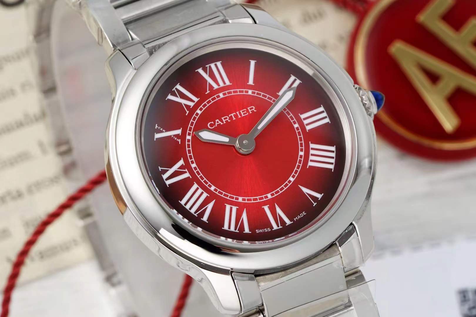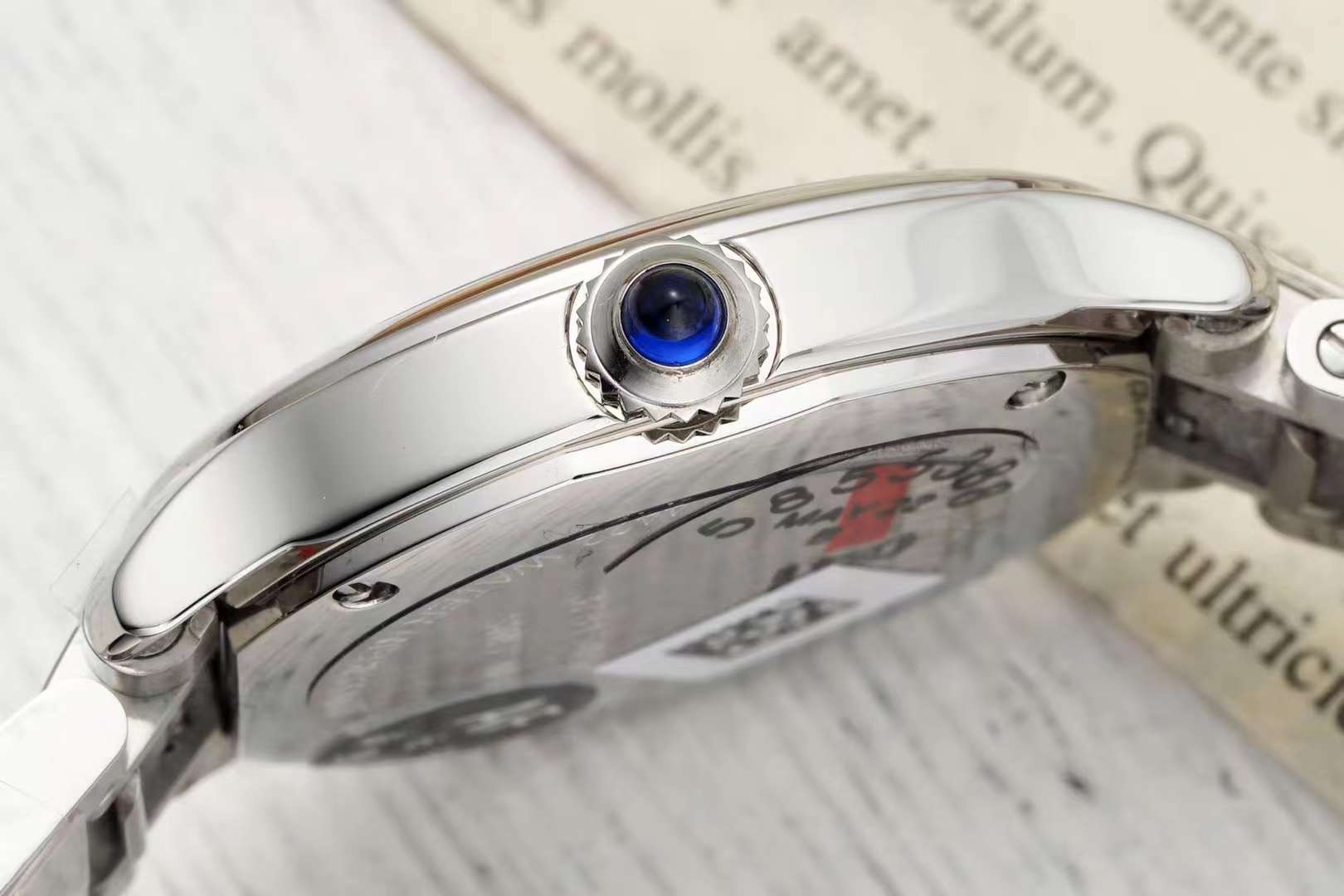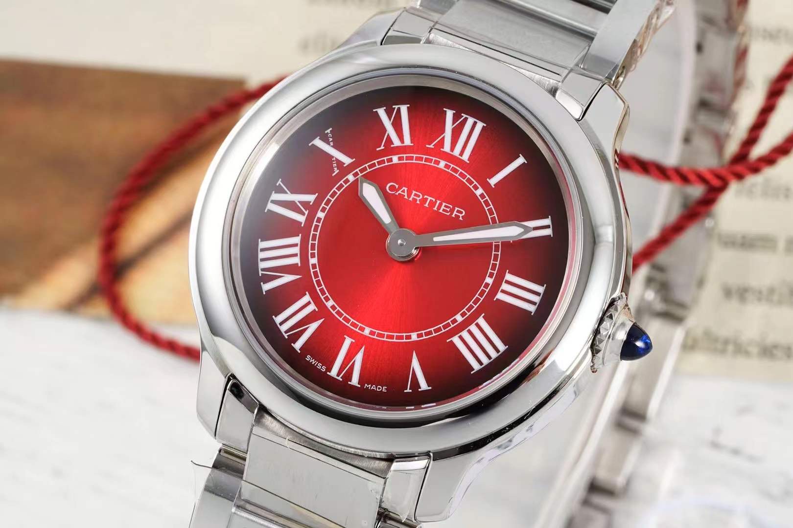 这款手表是AAAAA 1:1 质量 (非常棒). 使用了和原版一模一样的材料. 商标部分也保持了和卡地亚/Cartier一样. 图片拍摄是实物手表拍摄, 您所收到的实物保证和我们图片一模一样.