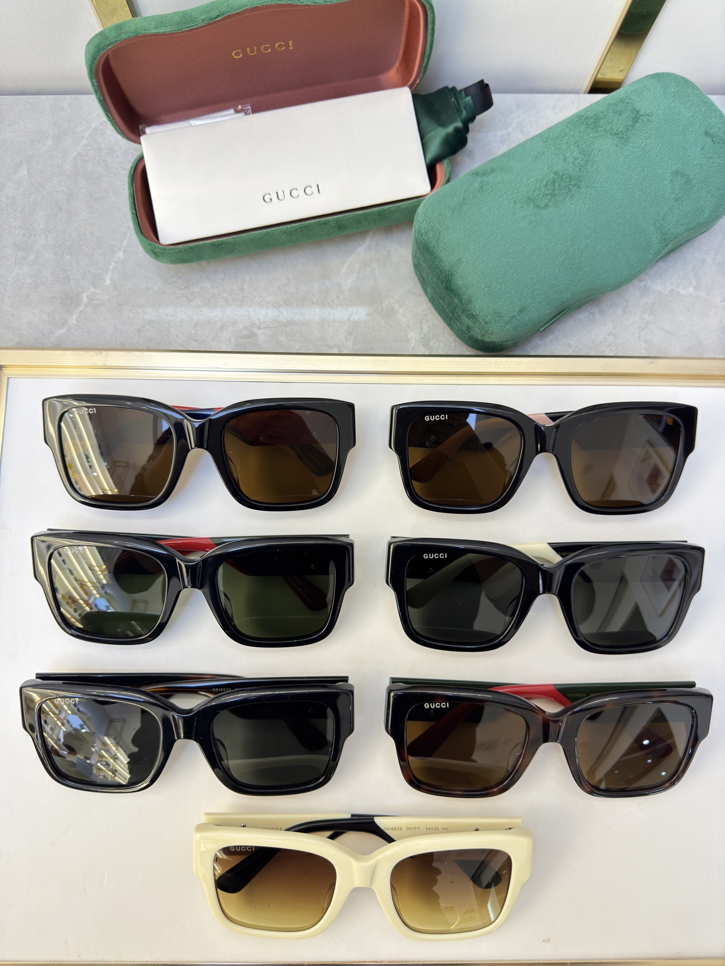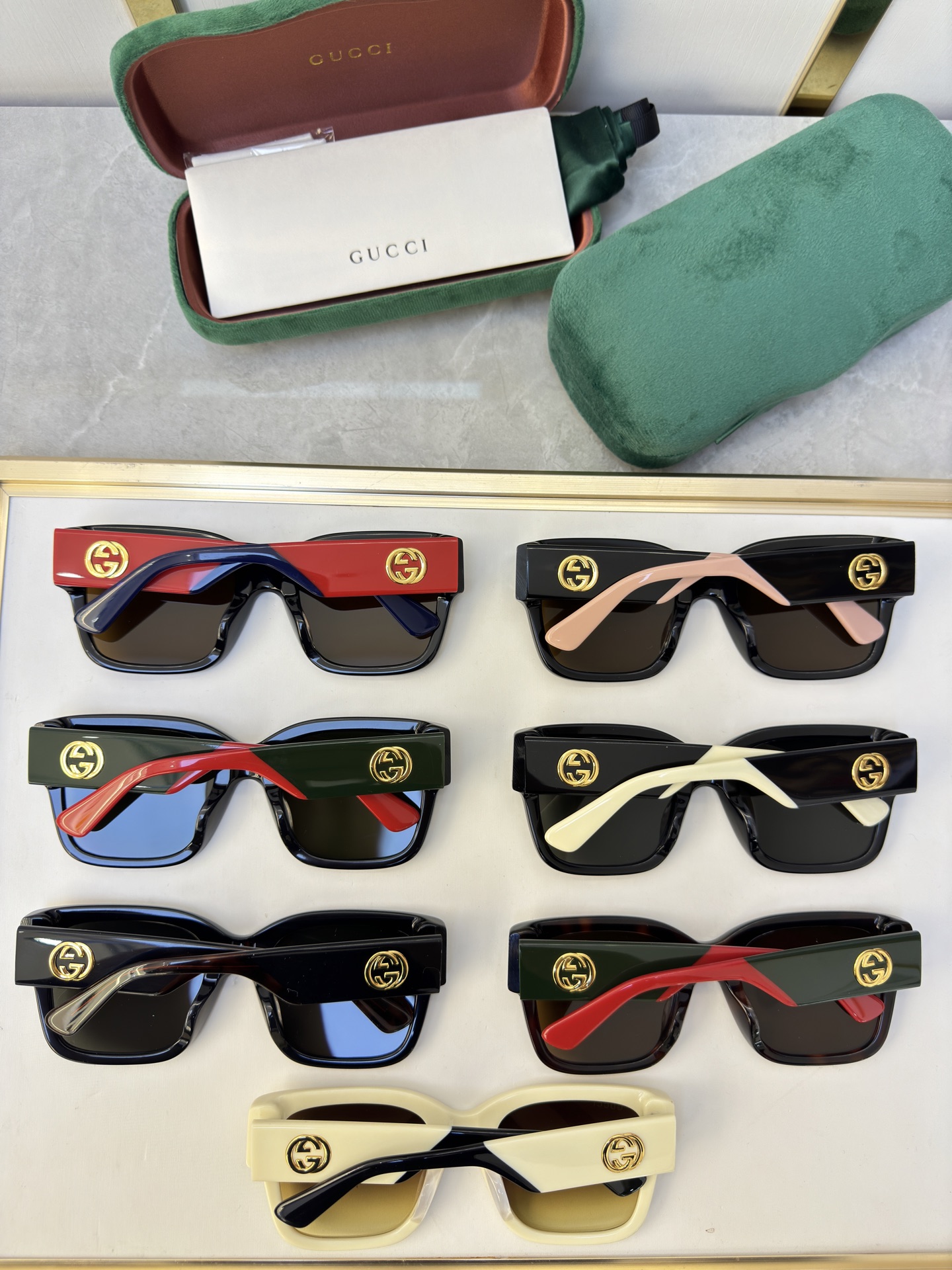 这款太阳眼镜是AAAAA 1:1 质量 (非常棒). 使用了和原版一模一样的材料. 商标部分也保持了和古奇/Gucci一样. 图片拍摄是实物太阳眼镜拍摄, 您所收到的实物保证和我们图片一模一样.