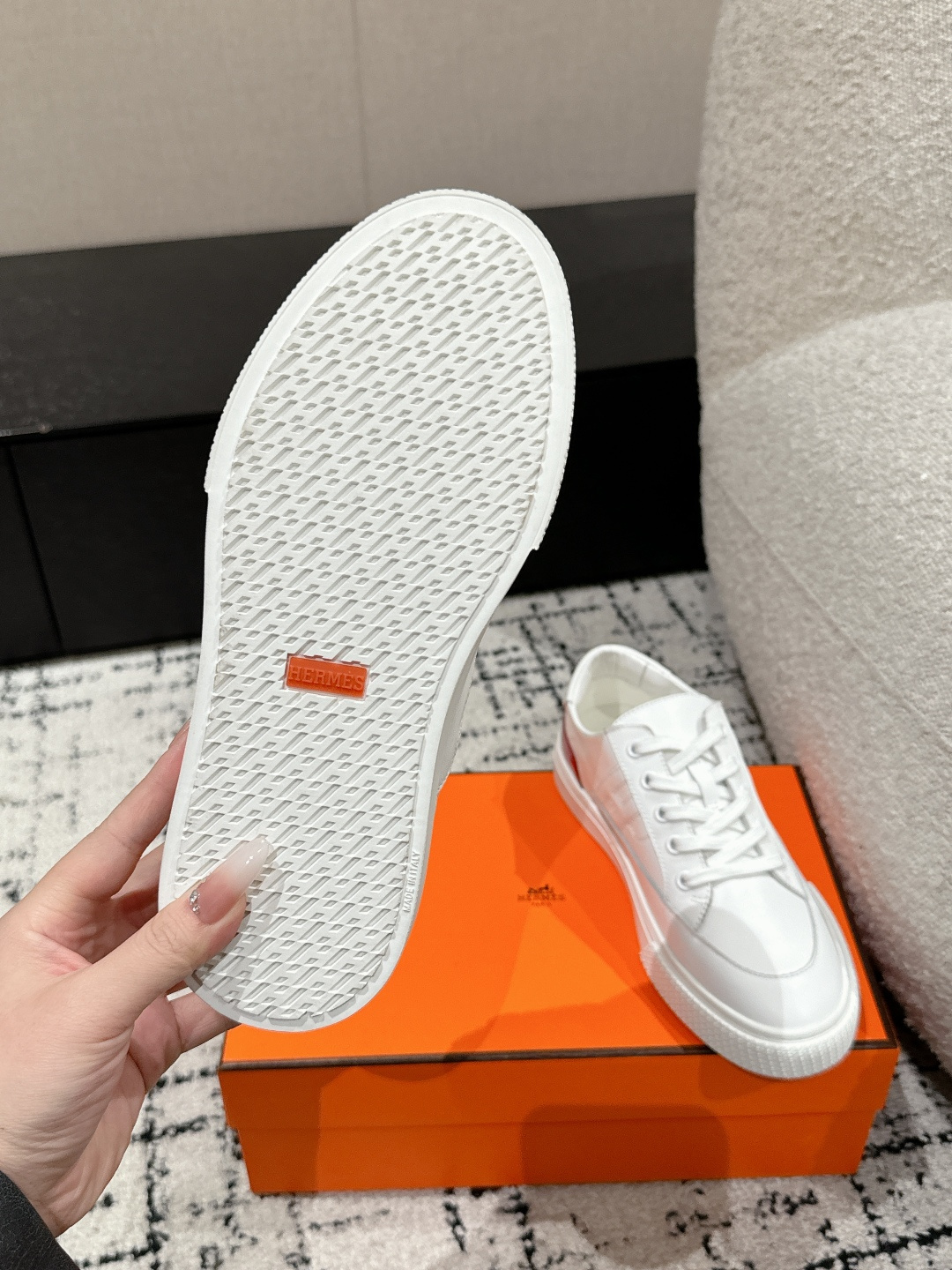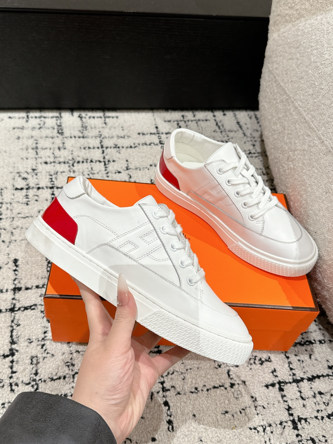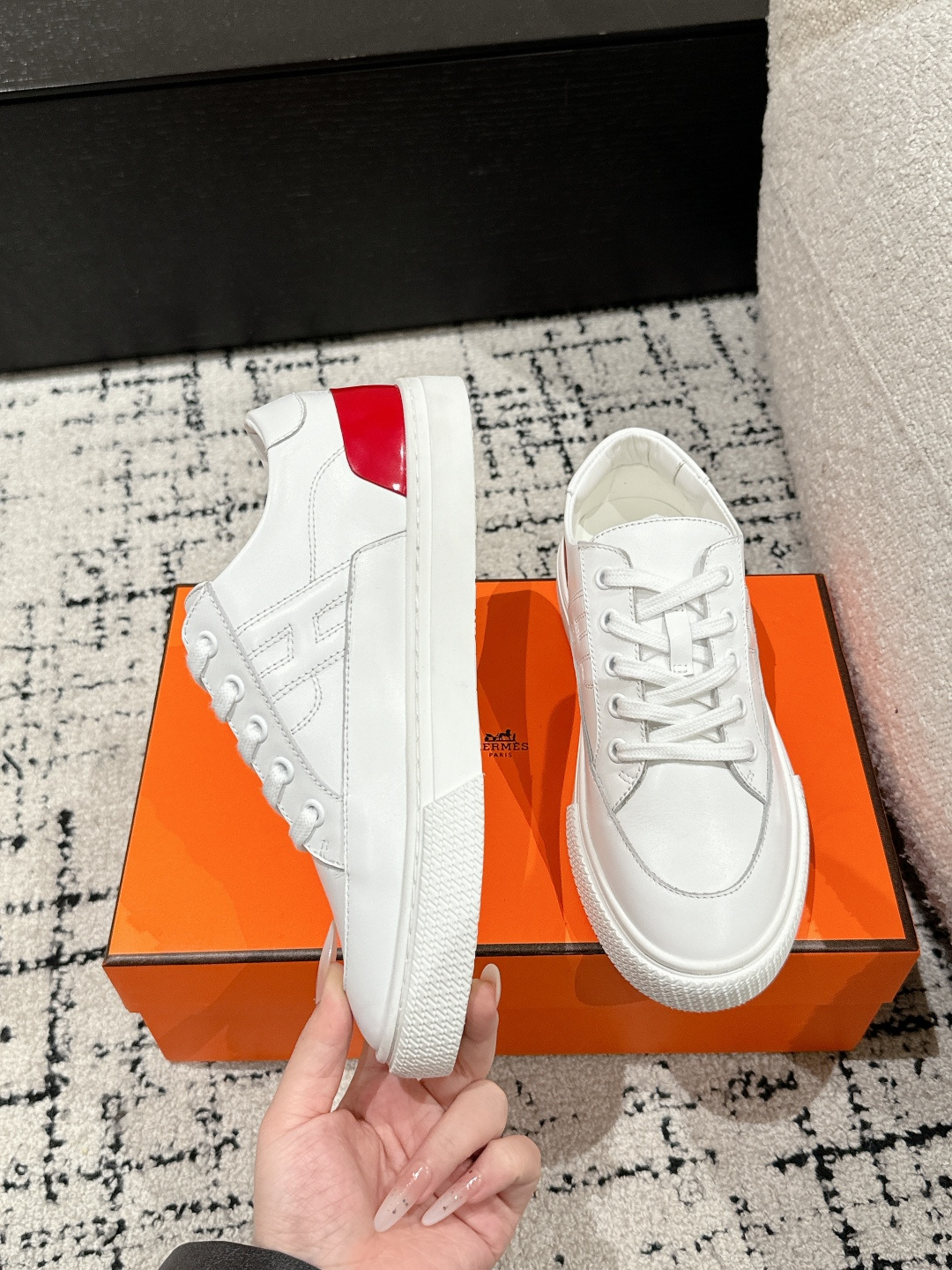 这款鞋子是AAAAA 1:1 质量 (非常棒). 使用了和原版一模一样的材料. 商标部分也保持了和爱马仕/Hermes一样. 图片拍摄是实物鞋子拍摄, 您所收到的实物保证和我们图片一模一样.