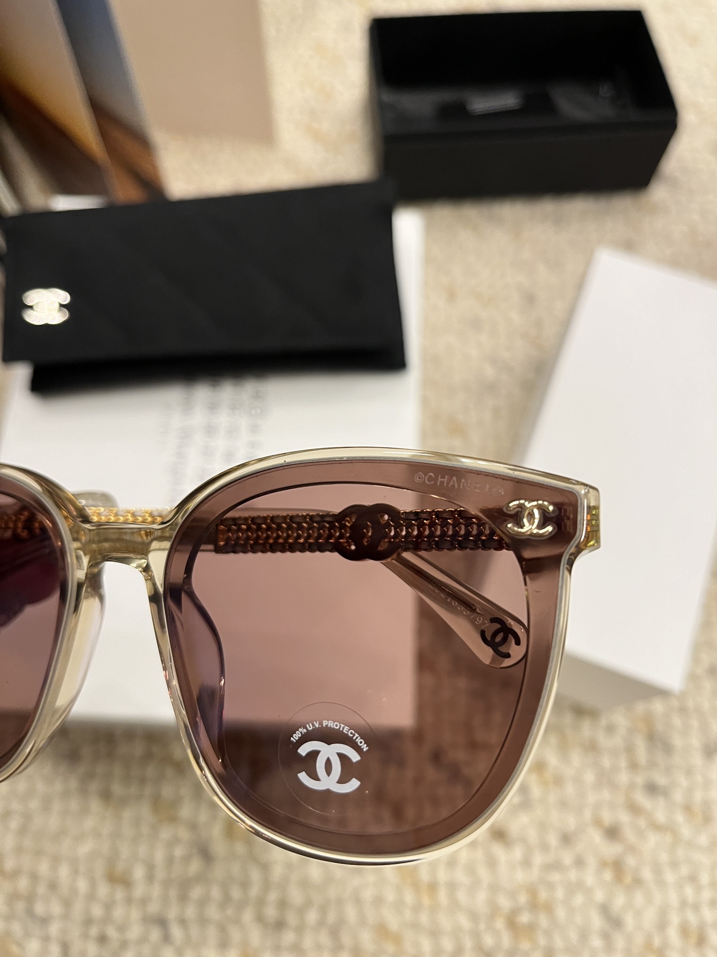 这款太阳眼镜是AAAAA 1:1 质量 (非常棒). 使用了和原版一模一样的材料. 商标部分也保持了和香奈儿/Chanel一样. 图片拍摄是实物太阳眼镜拍摄, 您所收到的实物保证和我们图片一模一样.