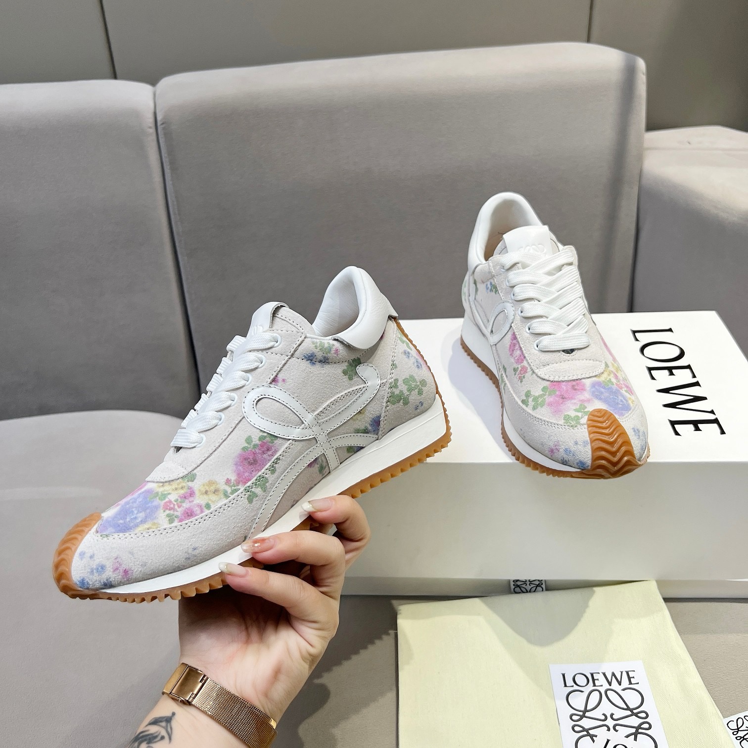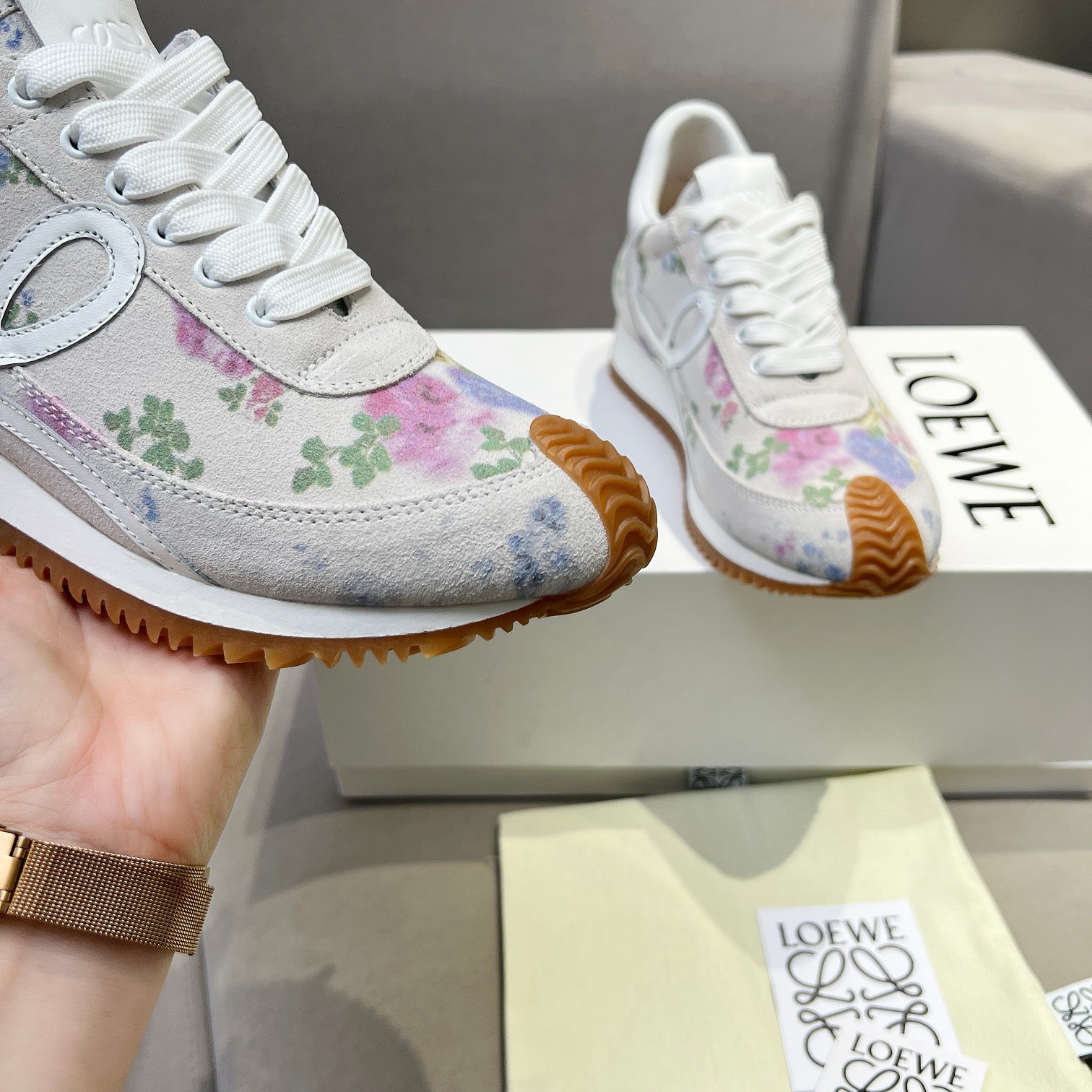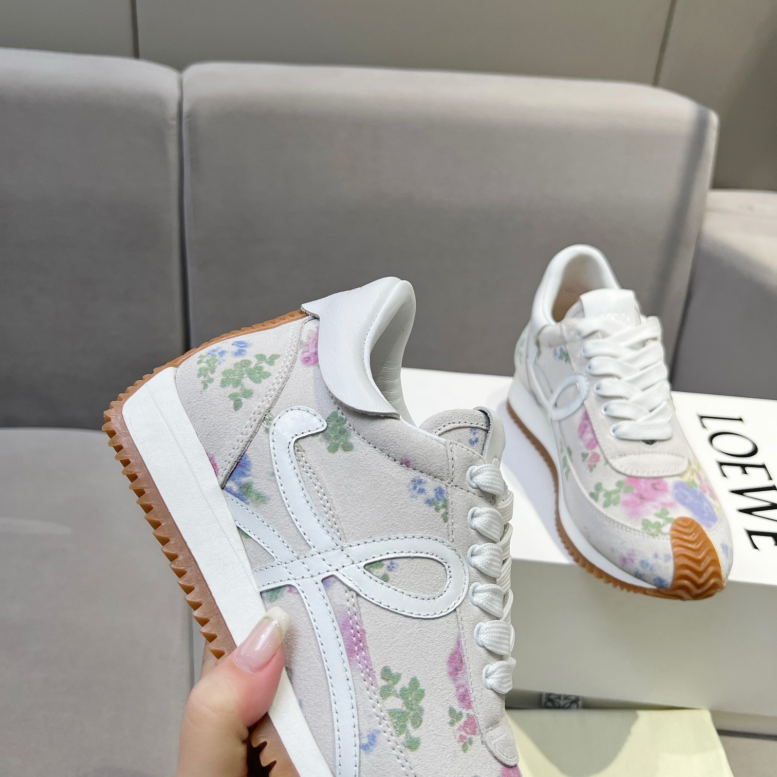 这款鞋子是AAAAA 1:1 质量 (非常棒). 使用了和原版一模一样的材料. 商标部分也保持了和罗意威/Loewe一样. 图片拍摄是实物鞋子拍摄, 您所收到的实物保证和我们图片一模一样.