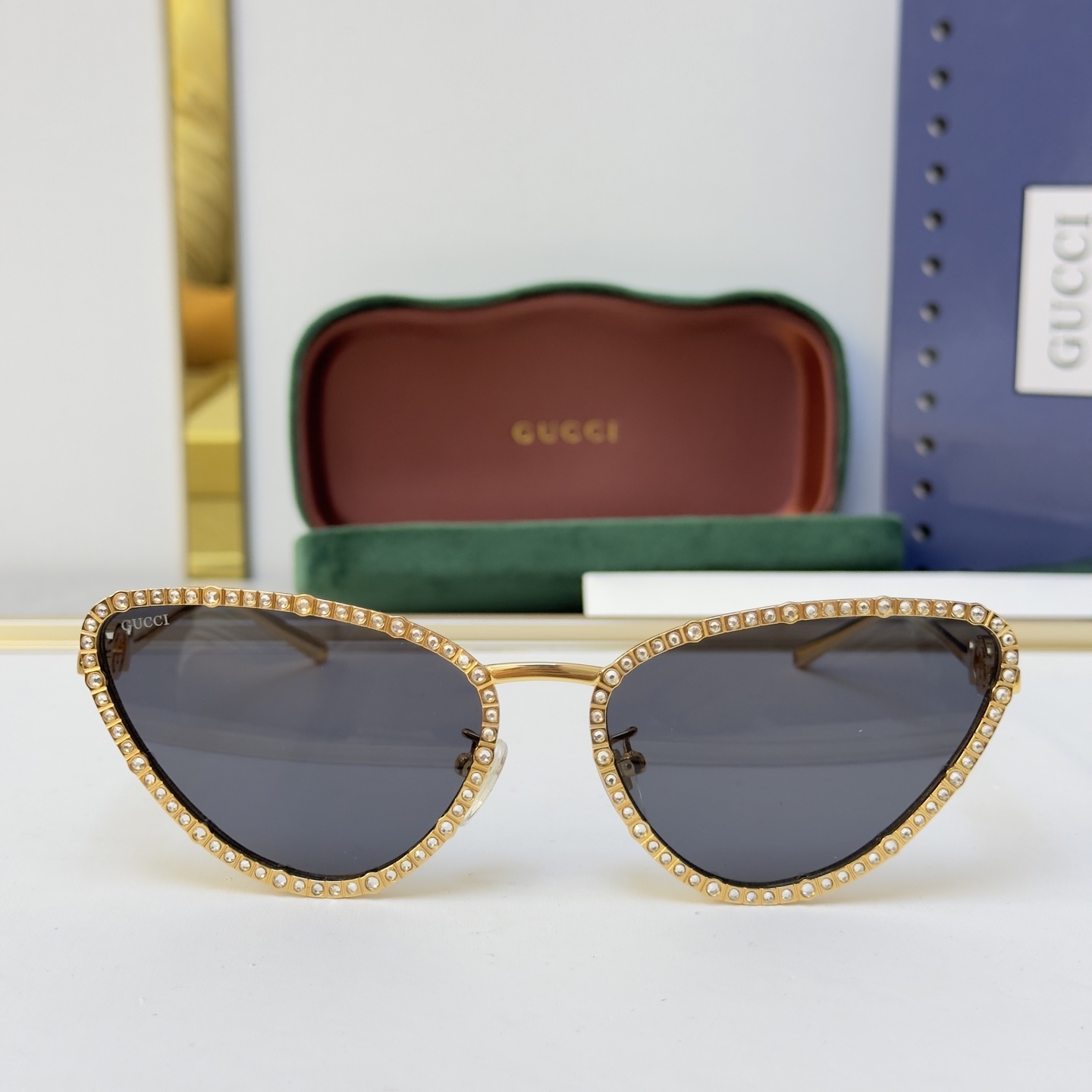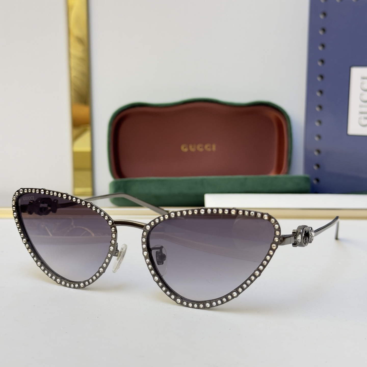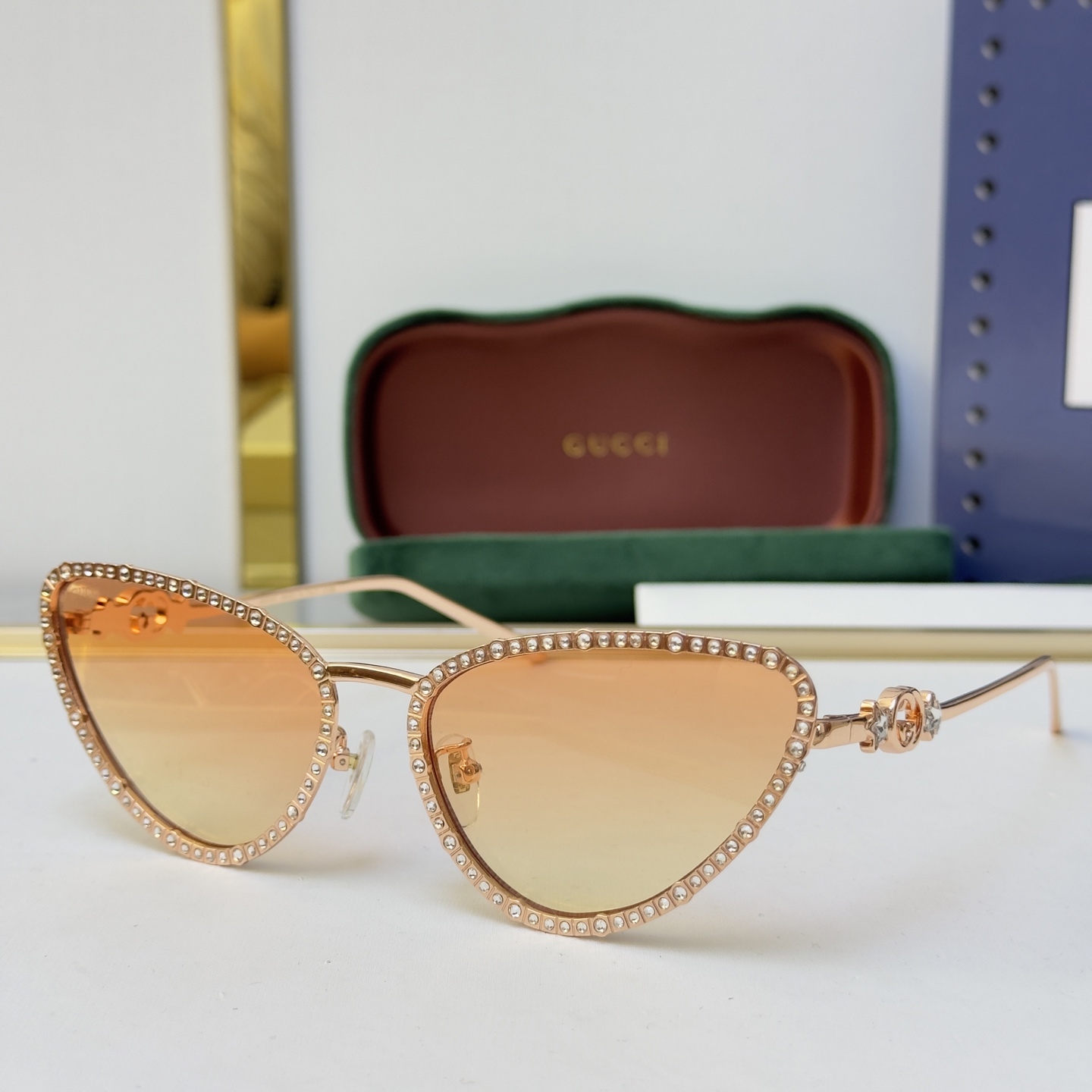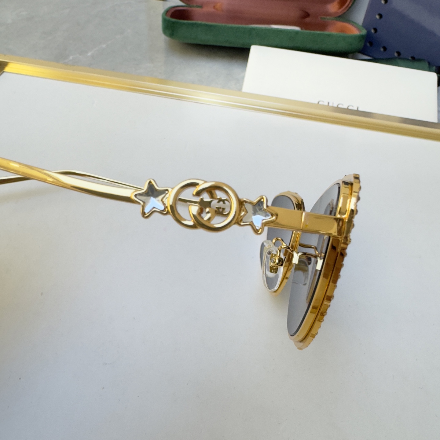 这款太阳眼镜是AAAAA 1:1 质量 (非常棒). 使用了和原版一模一样的材料. 商标部分也保持了和古奇/Gucci一样. 图片拍摄是实物太阳眼镜拍摄, 您所收到的实物保证和我们图片一模一样.