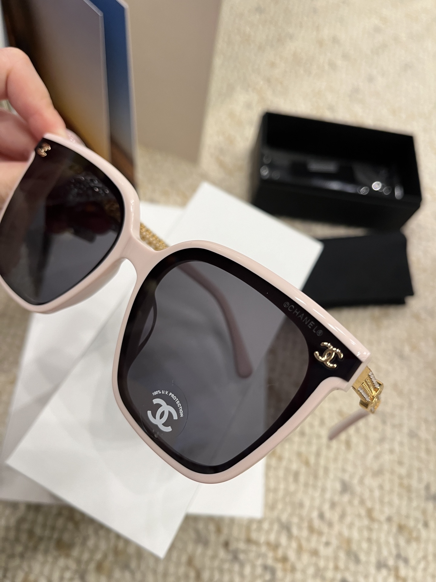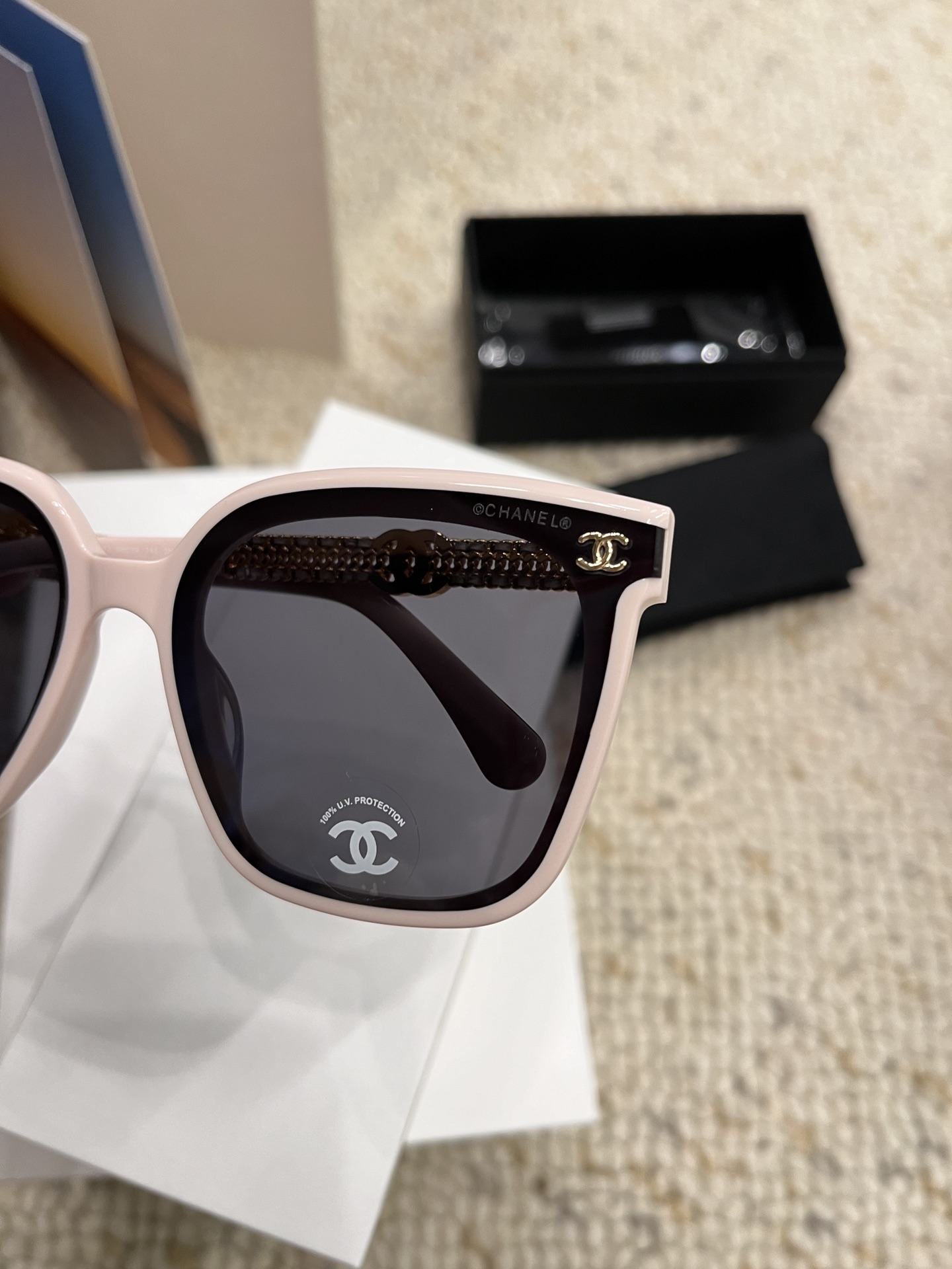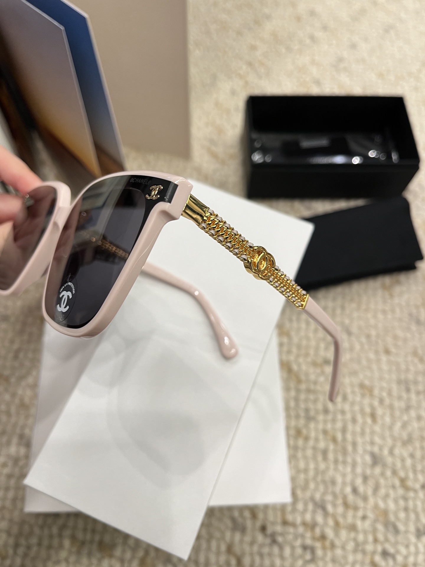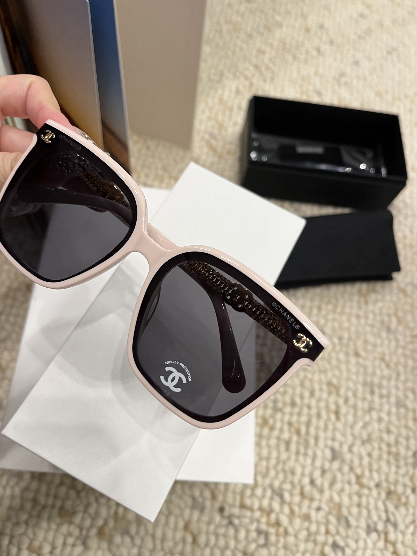 这款太阳眼镜是AAAAA 1:1 质量 (非常棒). 使用了和原版一模一样的材料. 商标部分也保持了和香奈儿/Chanel一样. 图片拍摄是实物太阳眼镜拍摄, 您所收到的实物保证和我们图片一模一样.