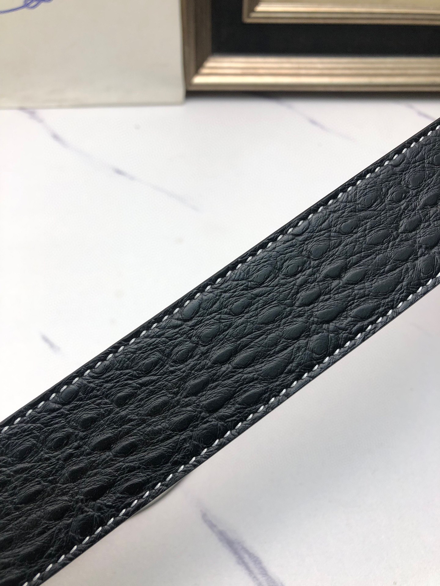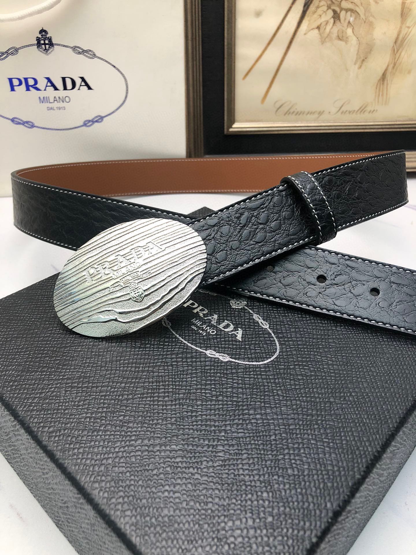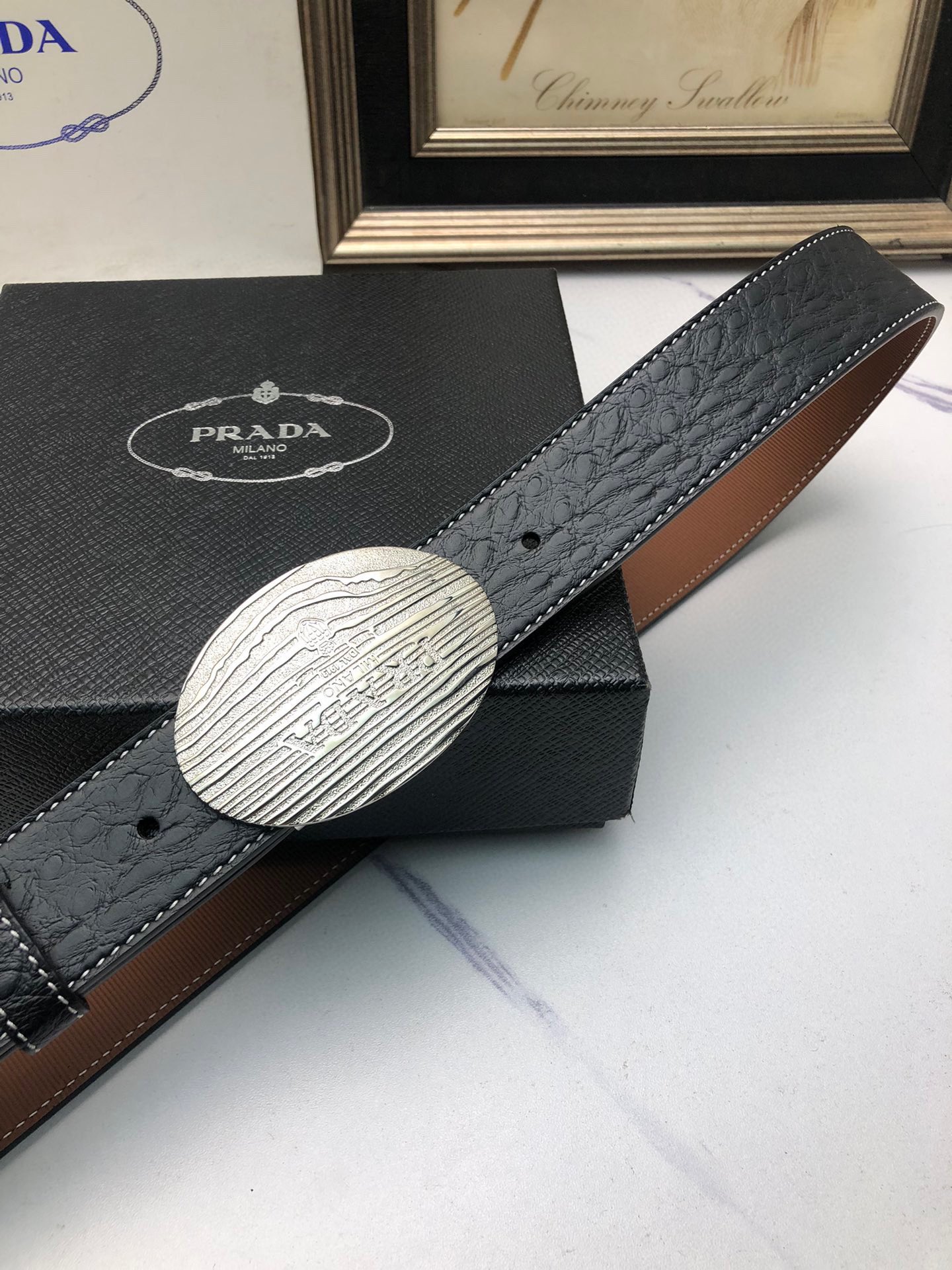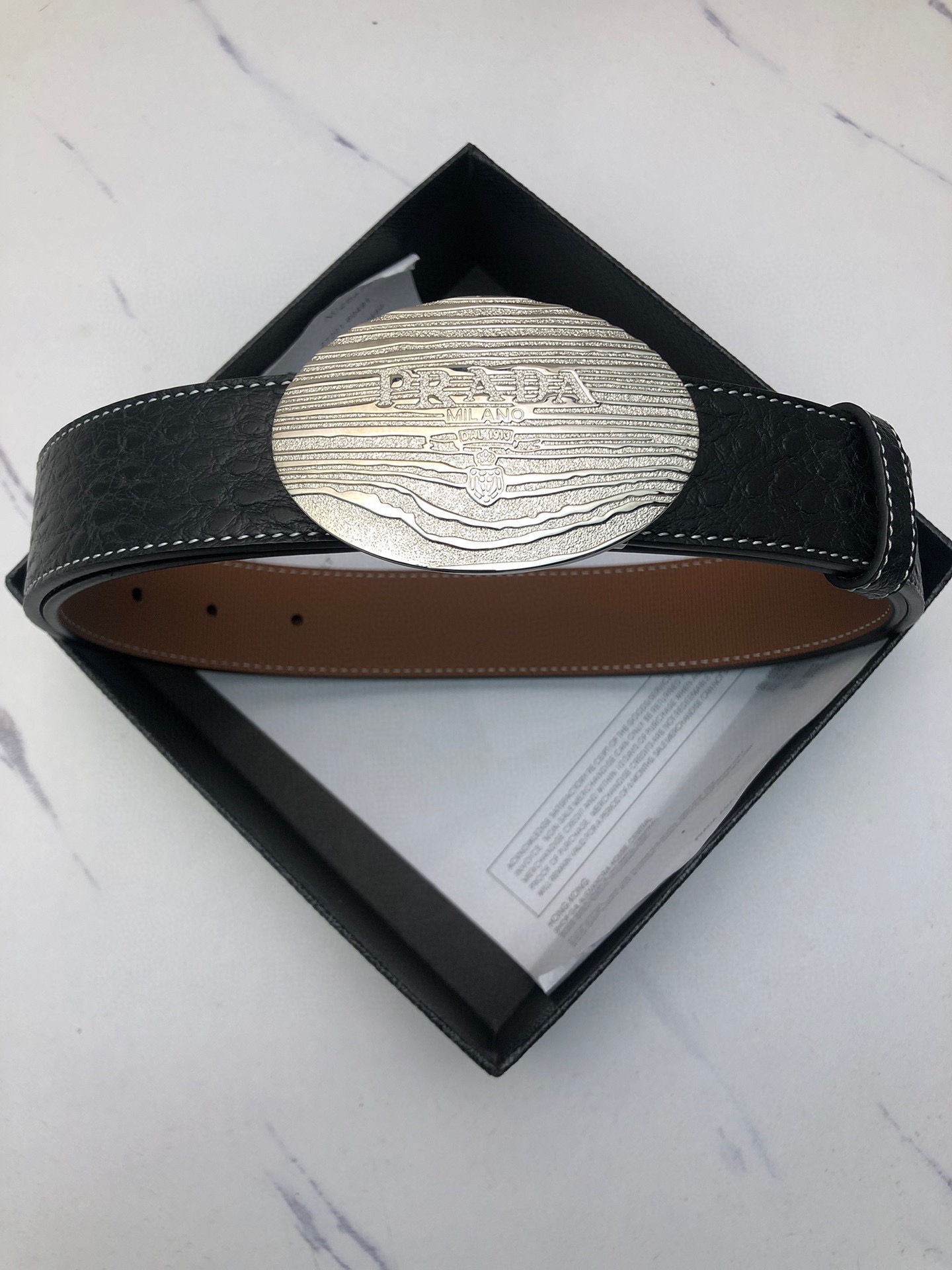 这款皮带是AAAAA 1:1 质量 (非常棒). 使用了和原版一模一样的材料. 商标部分也保持了和普拉达/Prada一样. 图片拍摄是实物皮带拍摄, 您所收到的实物保证和我们图片一模一样.