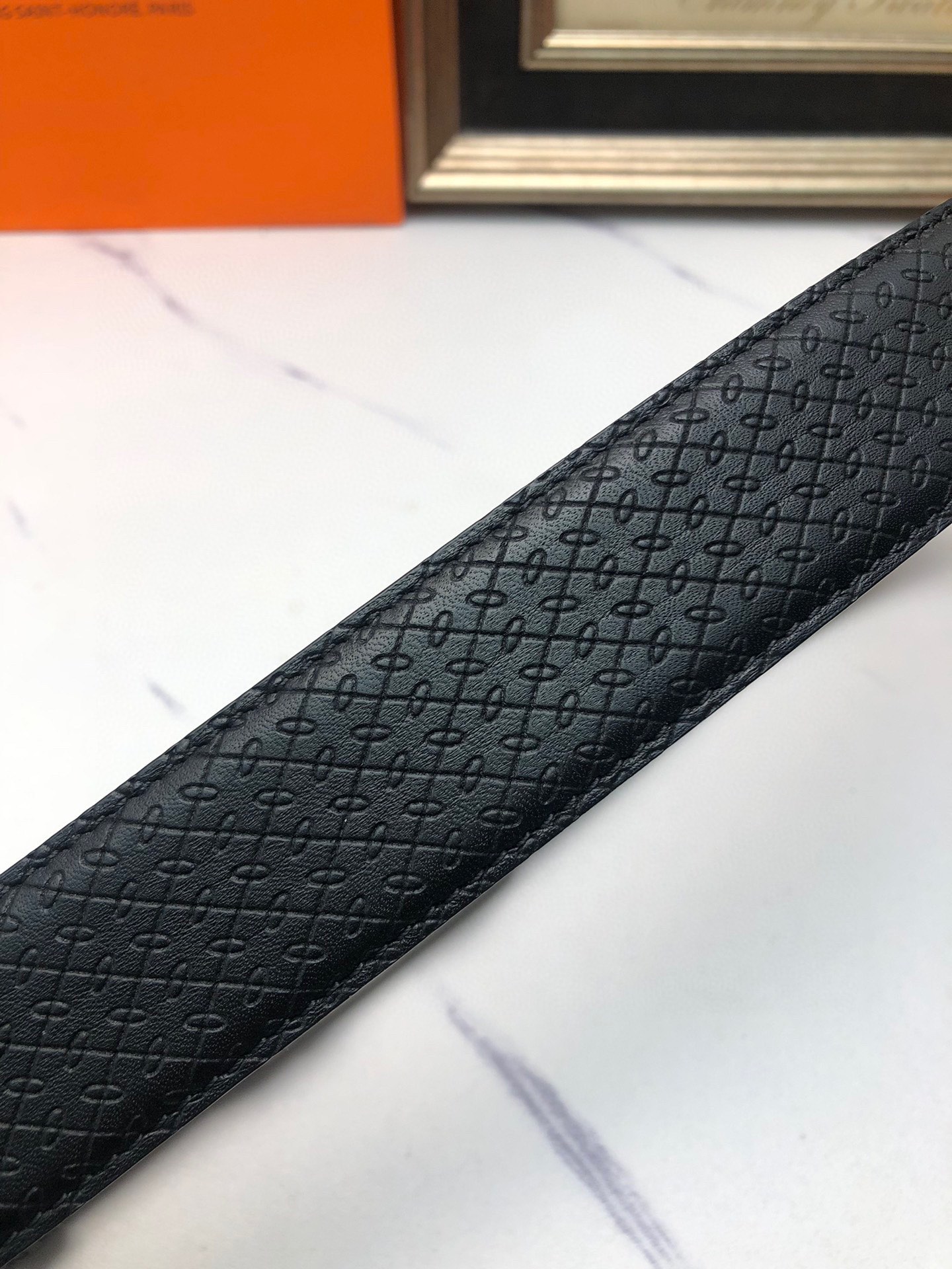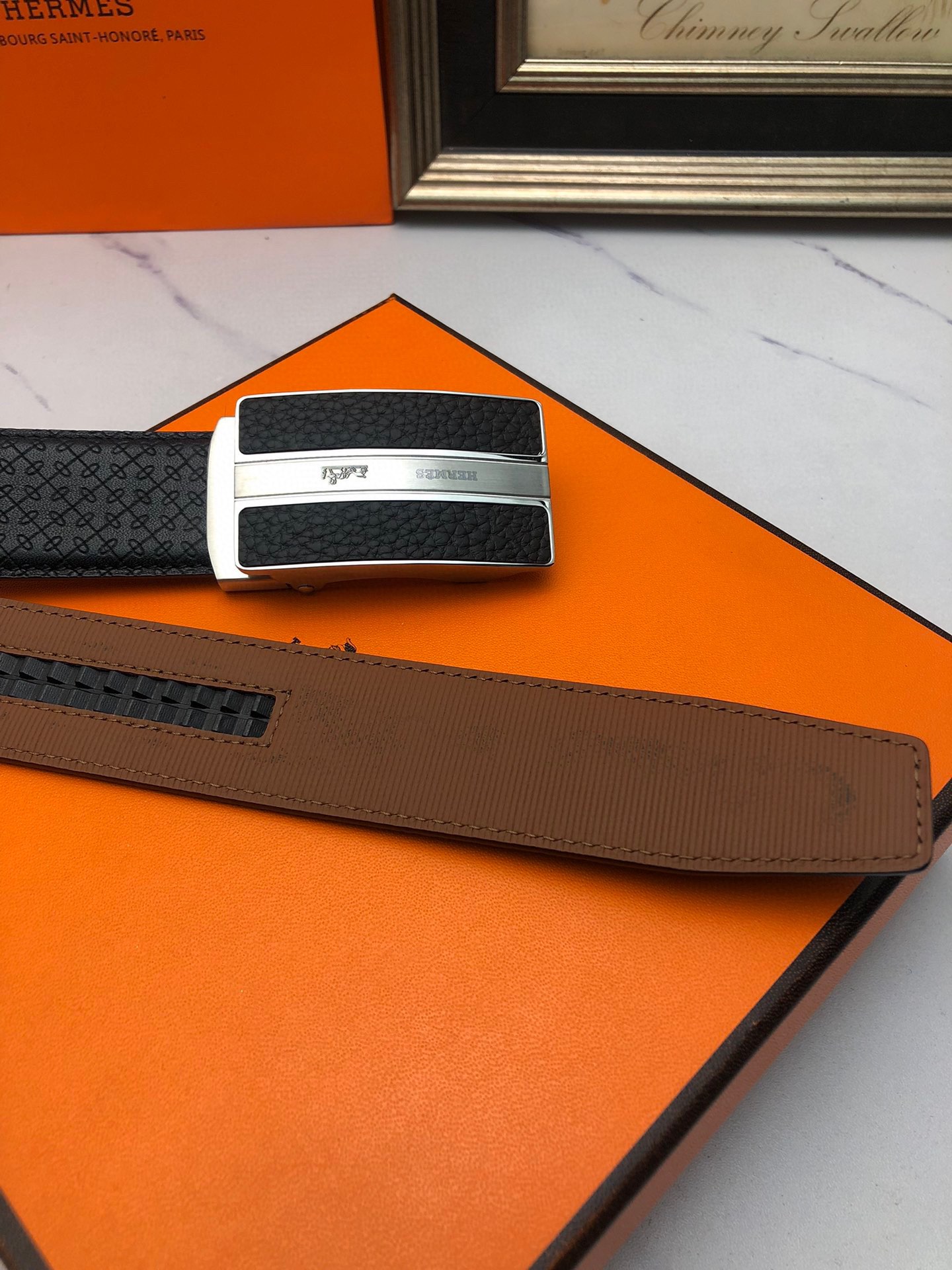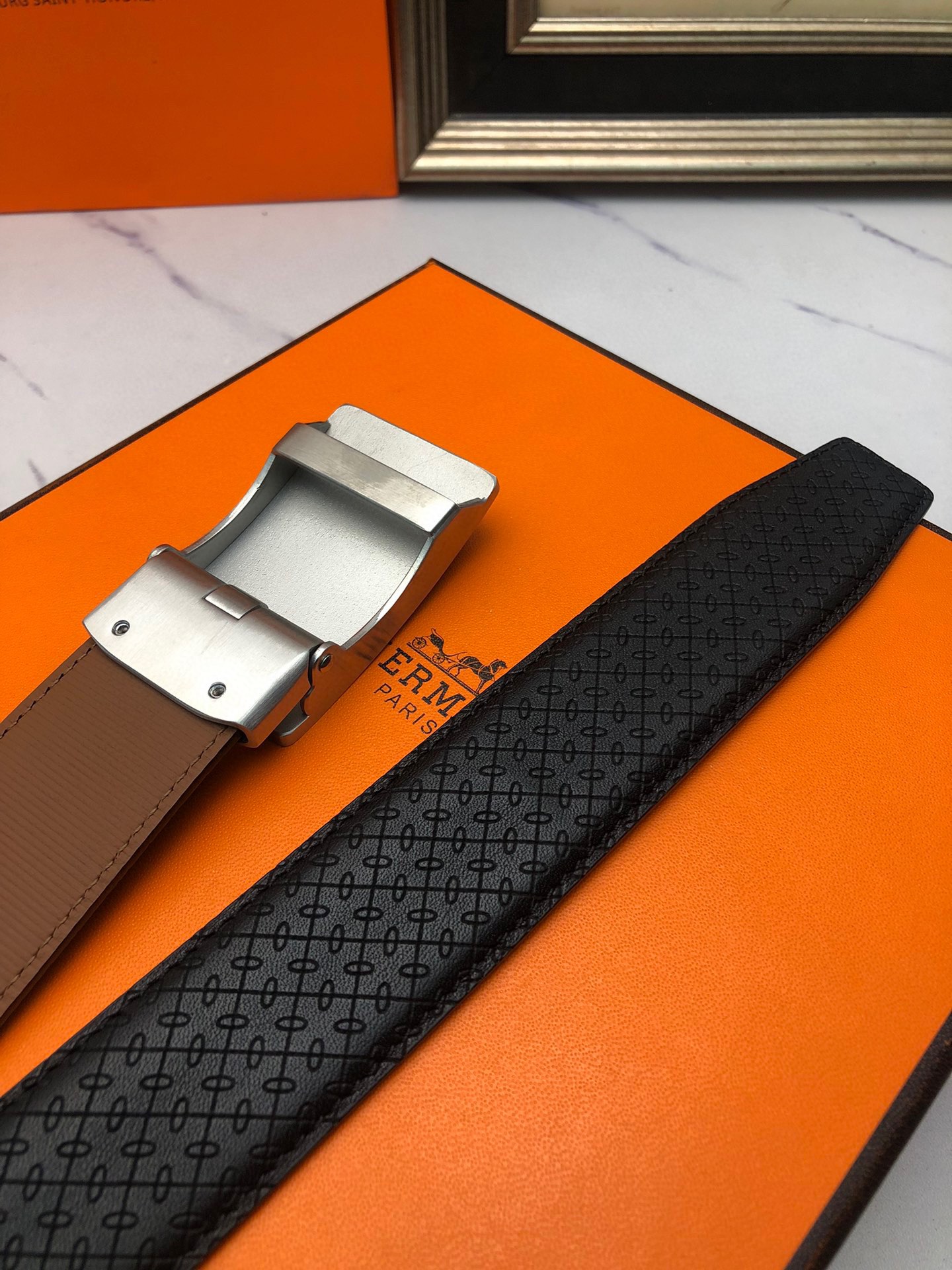 这款皮带是AAAAA 1:1 质量 (非常棒). 使用了和原版一模一样的材料. 商标部分也保持了和爱马仕/Hermes一样. 图片拍摄是实物皮带拍摄, 您所收到的实物保证和我们图片一模一样.